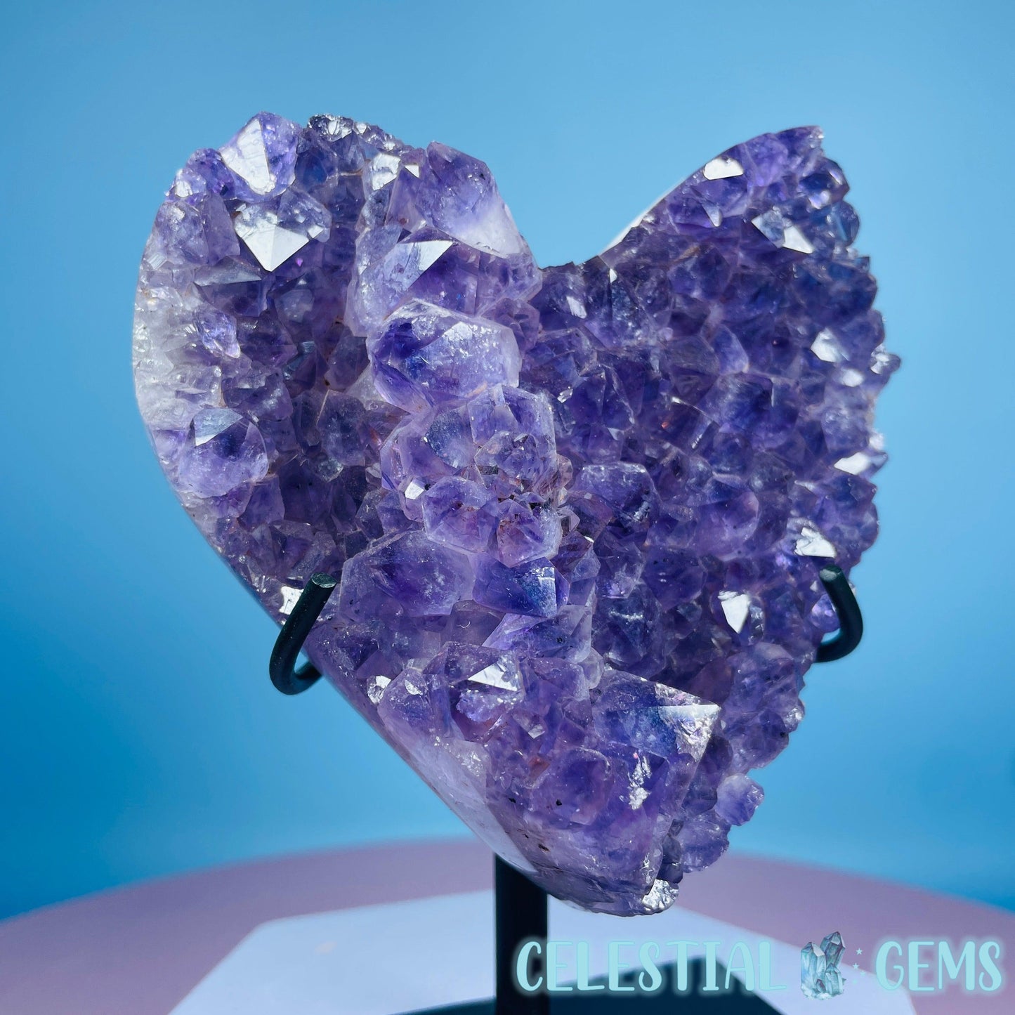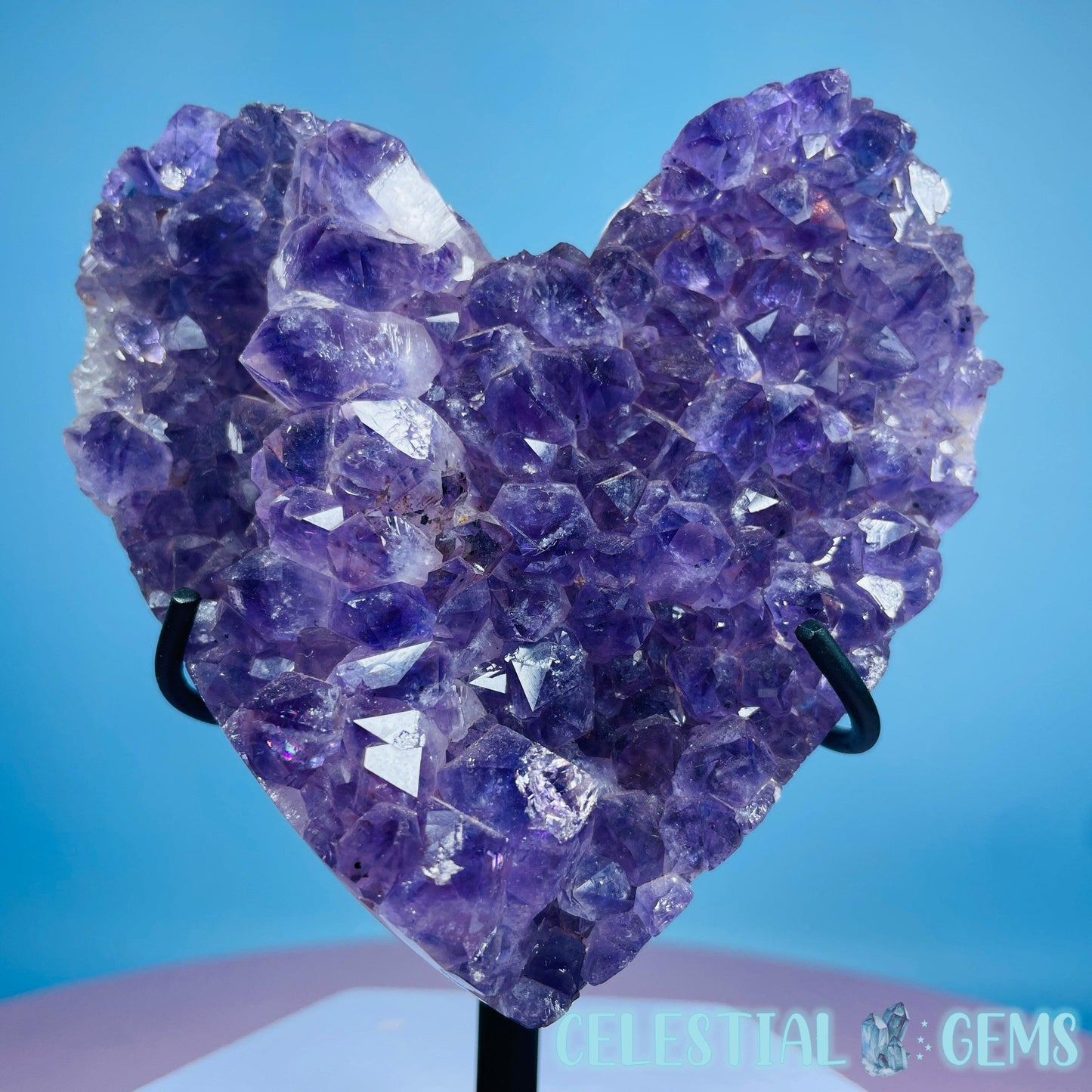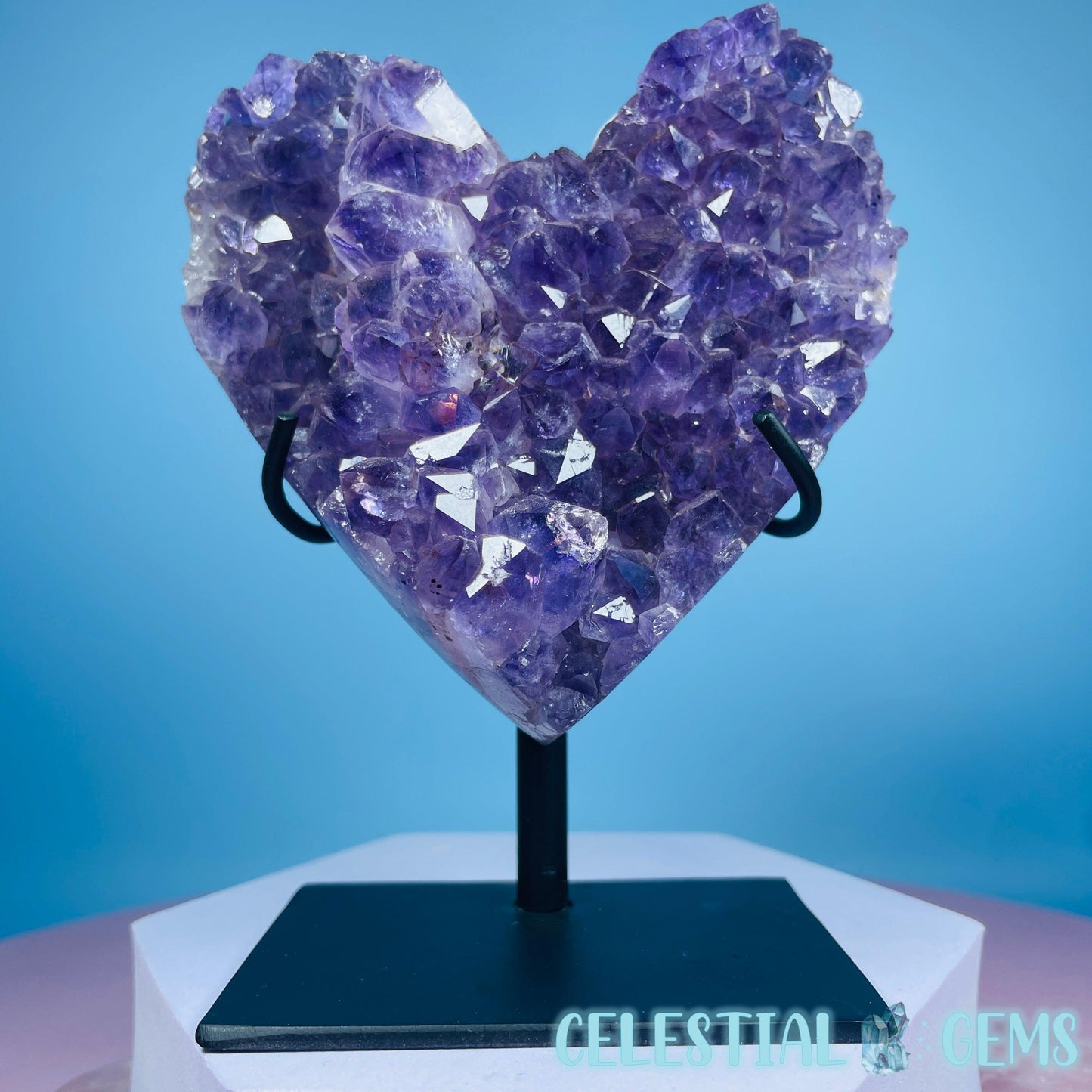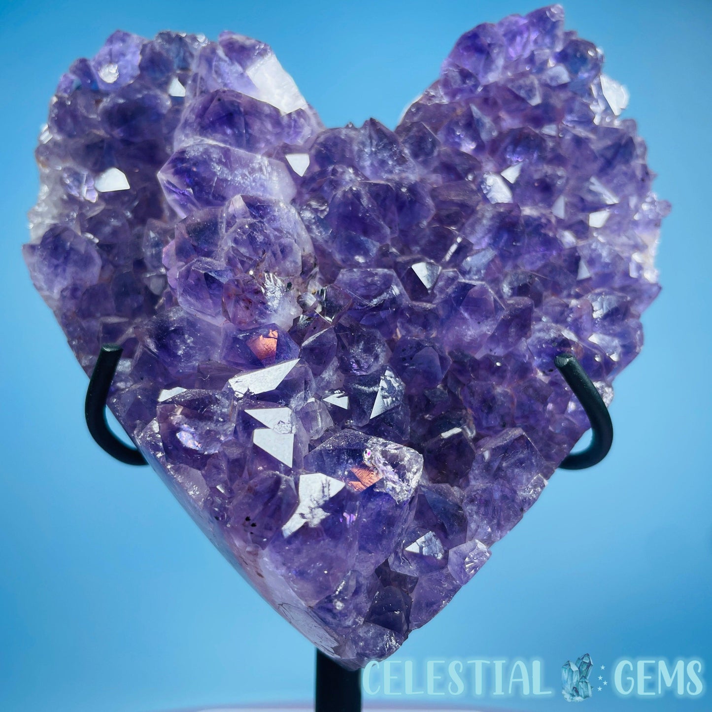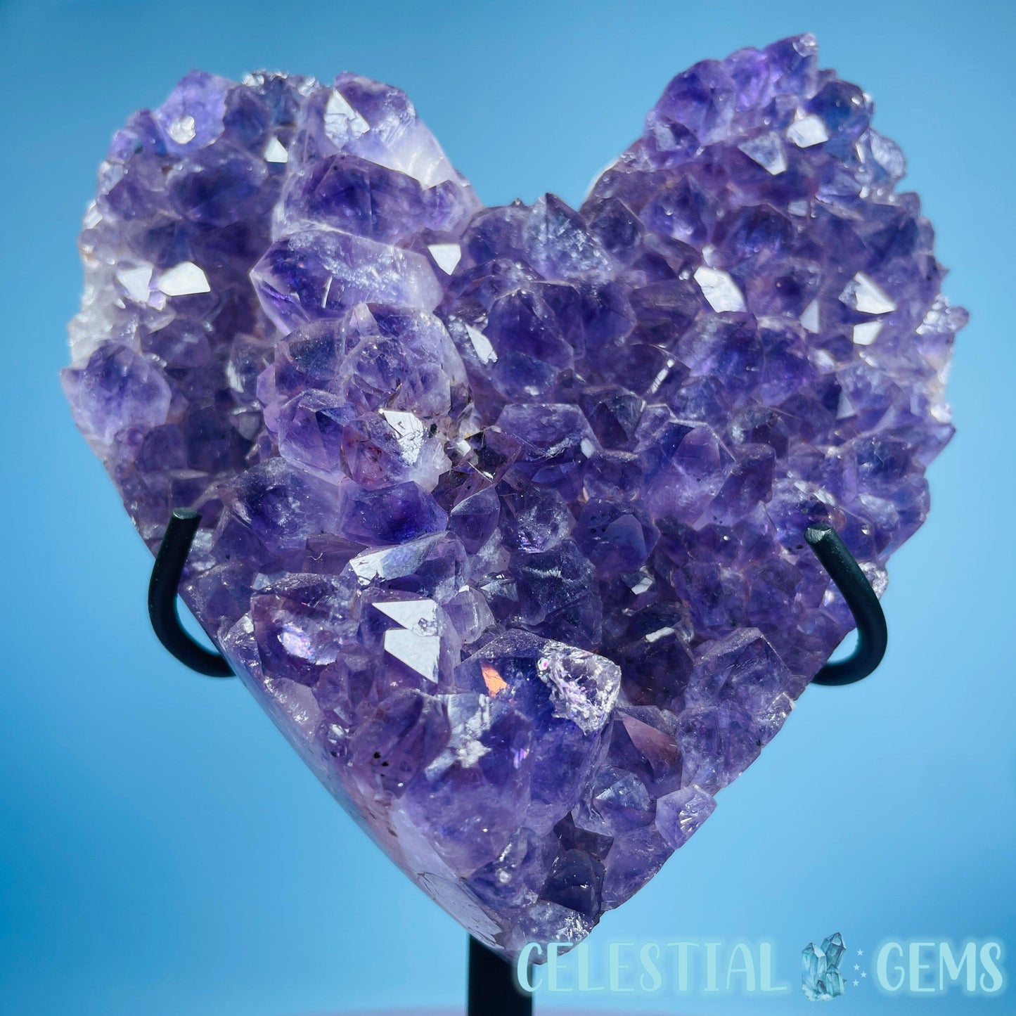 A carved heart of a dark purple Amethyst cluster with so many points. Comes in its own custom metal stand. Heart measurements 10cm x 10cm x 2.4cm. Total height in stand 12.7cm tall. Weighs 0.6kg including stand.