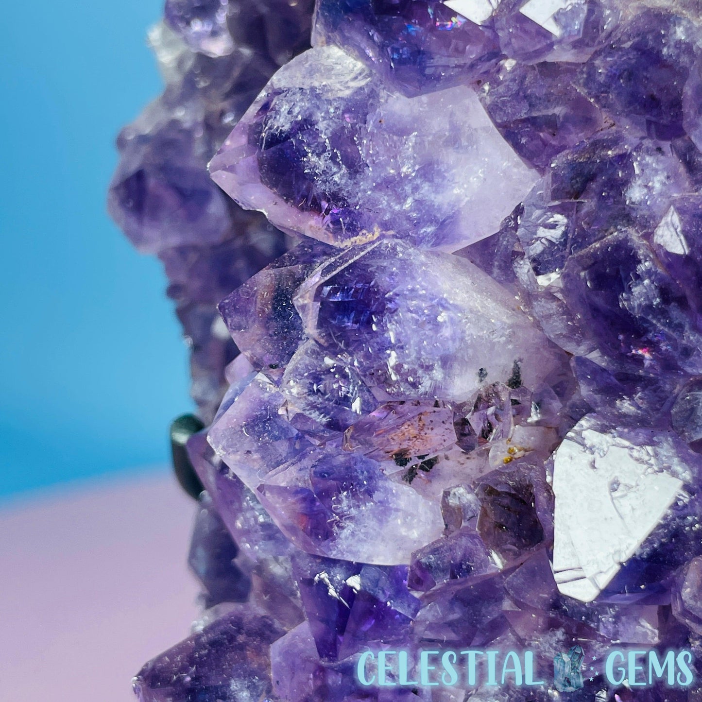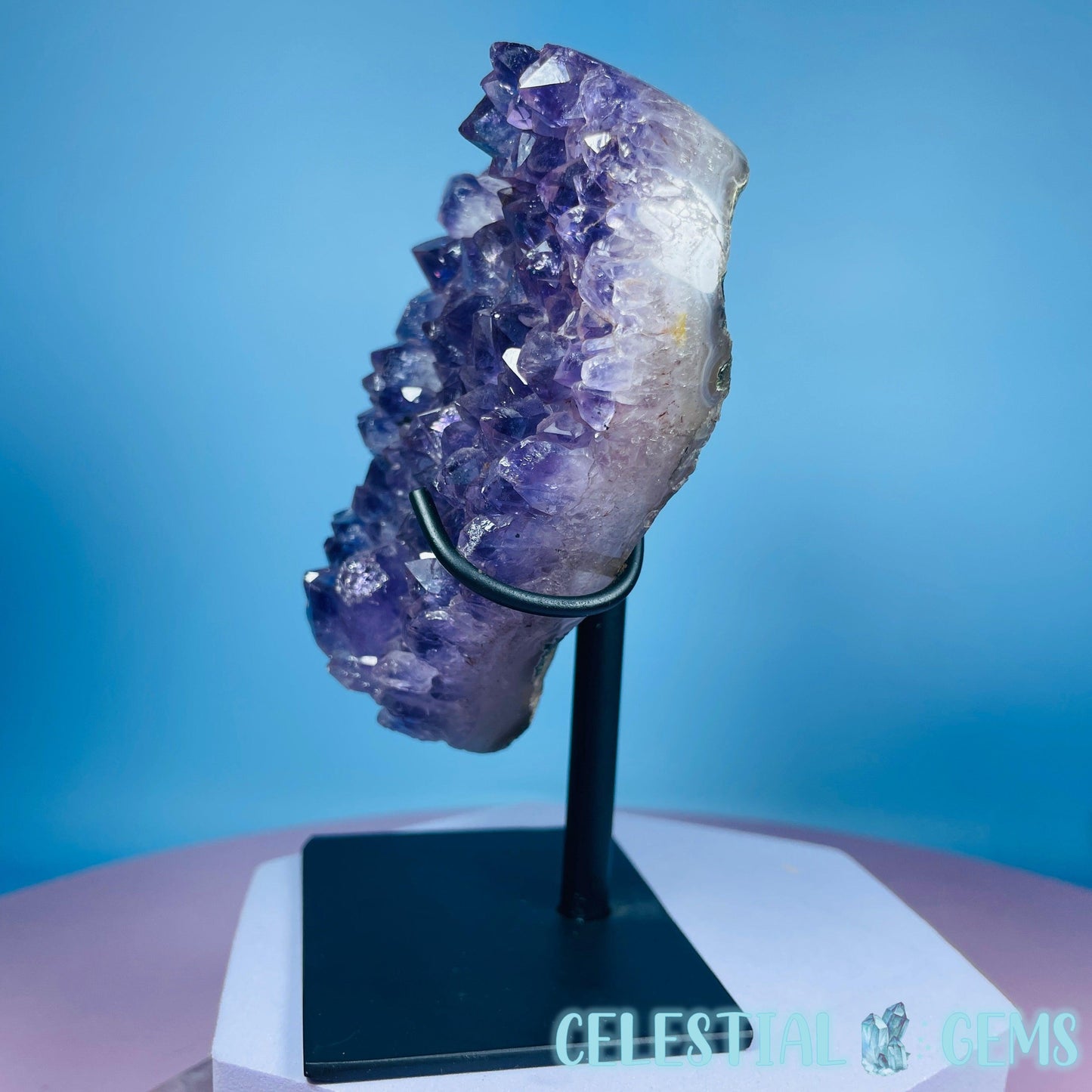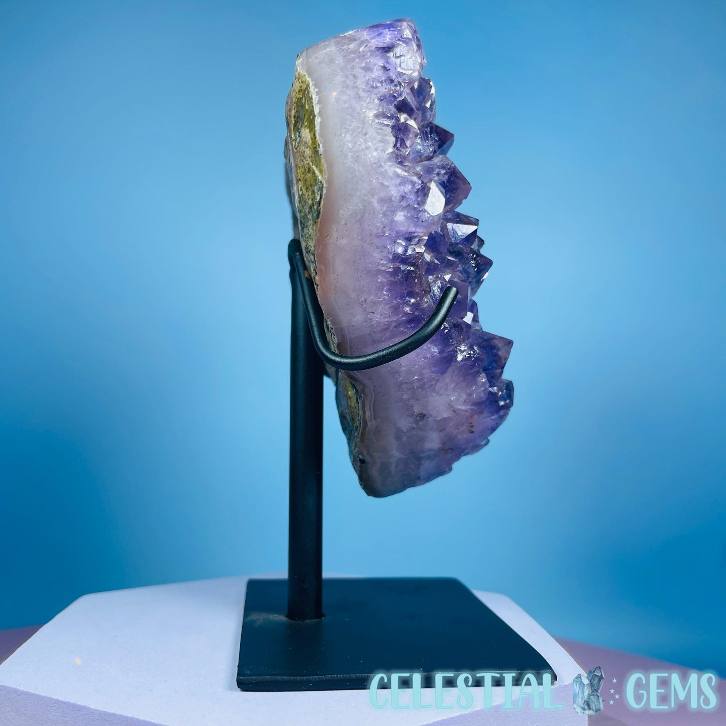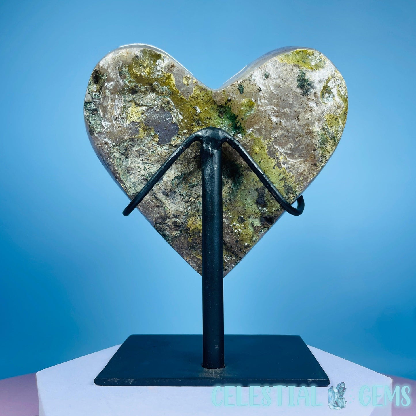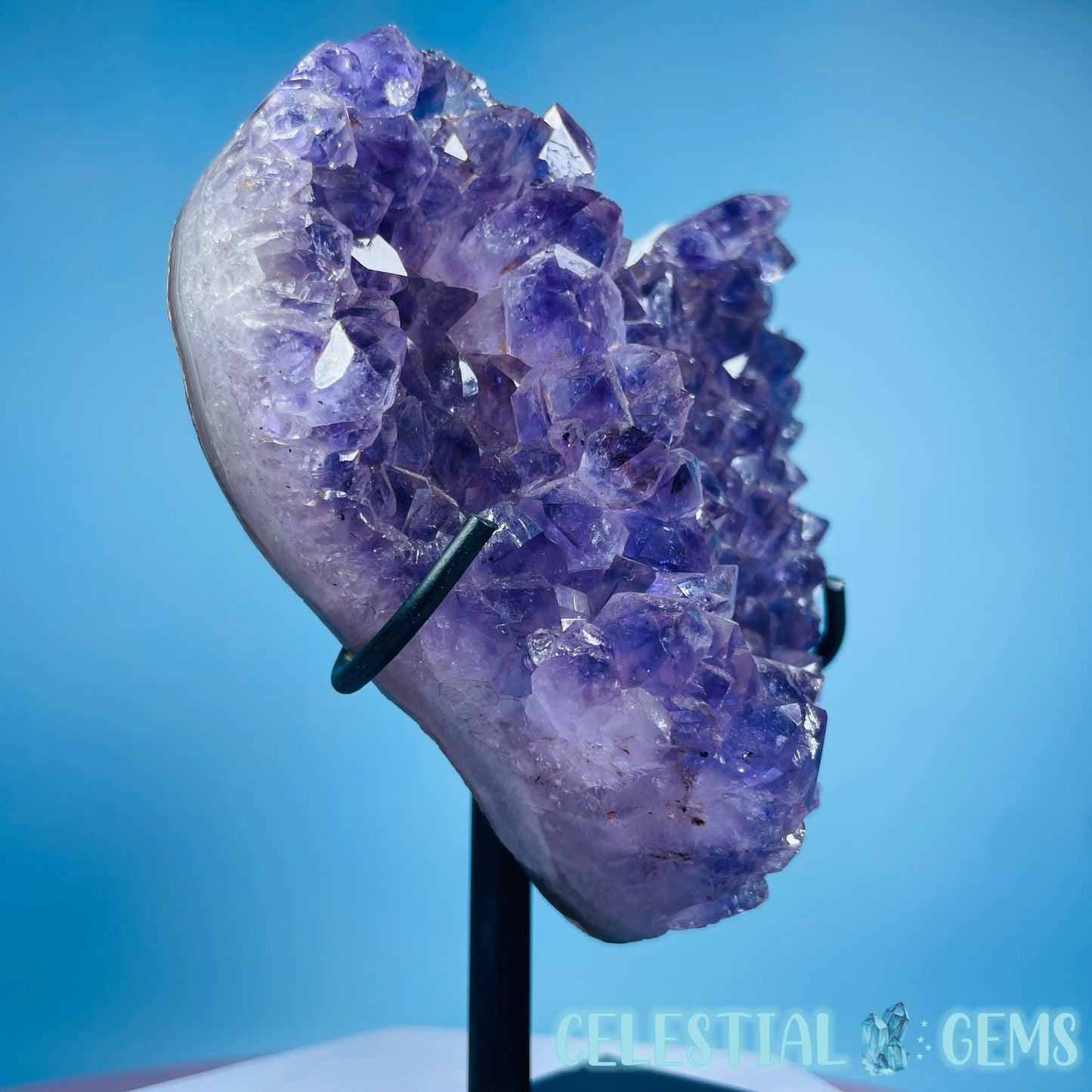 A carved heart of a dark purple Amethyst cluster with so many points. Comes in its own custom metal stand. Heart measurements 10cm x 10cm x 2.4cm. Total height in stand 12.7cm tall. Weighs 0.6kg including stand.