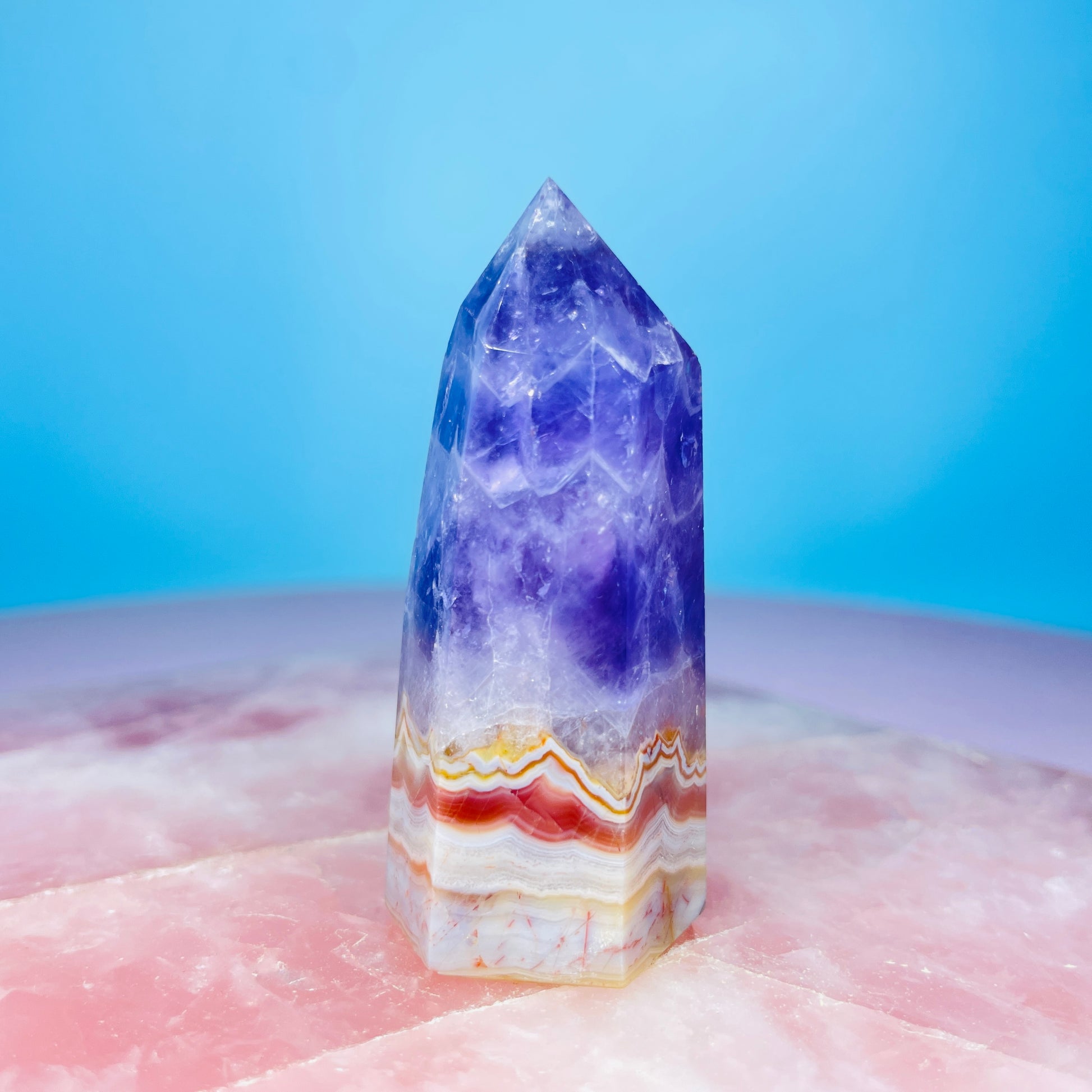 This small tower is carved from a natural blend of dark Amethyst Quartz with layers of multi-colours of Red, Orange, White, Brown and Yellow Lace Agate.
