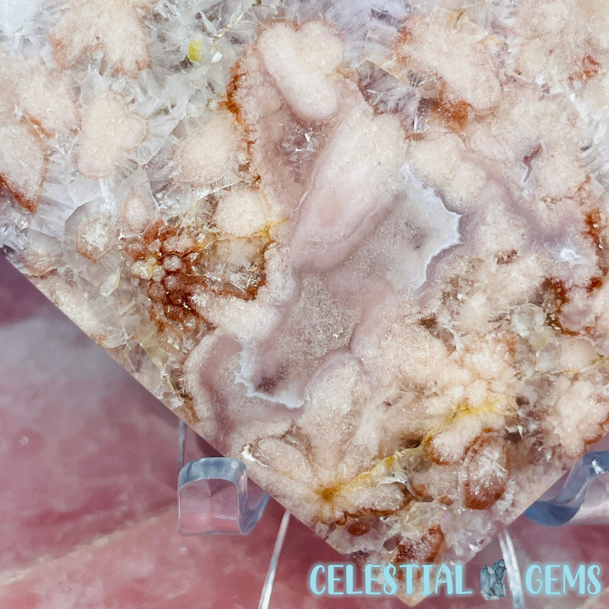 A beautiful pink Flower AGate heart with pockets of purple Amethyst. Approx. 10cm x 9cm x 2.1cm. Stand sold separately for display only.