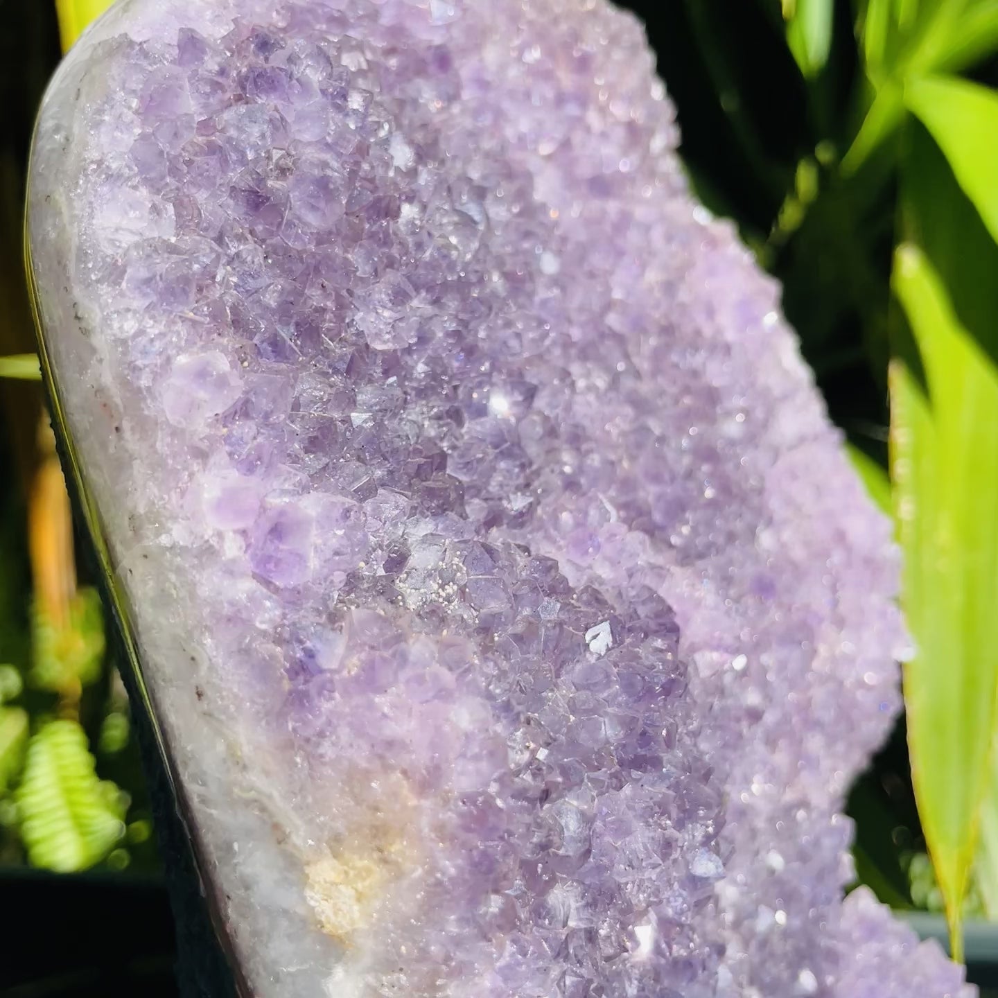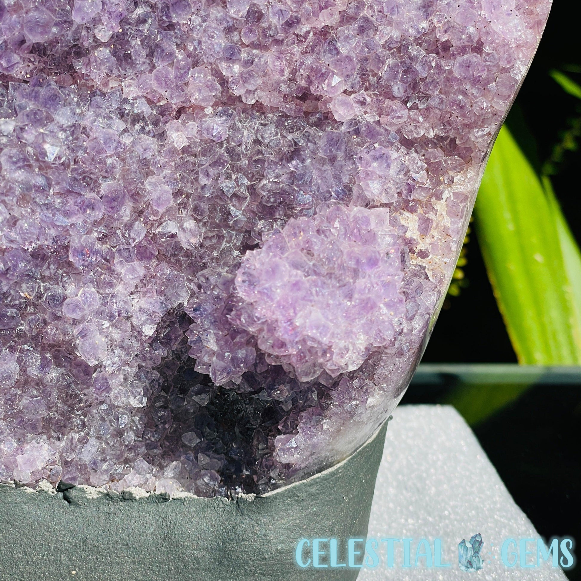 A large Amethyst cluster with dark coloured, small sparkly crystals. This cluster has a beautiful polished edge with lots of white Quartz on the sides and a concrete rear and base to make it stand.