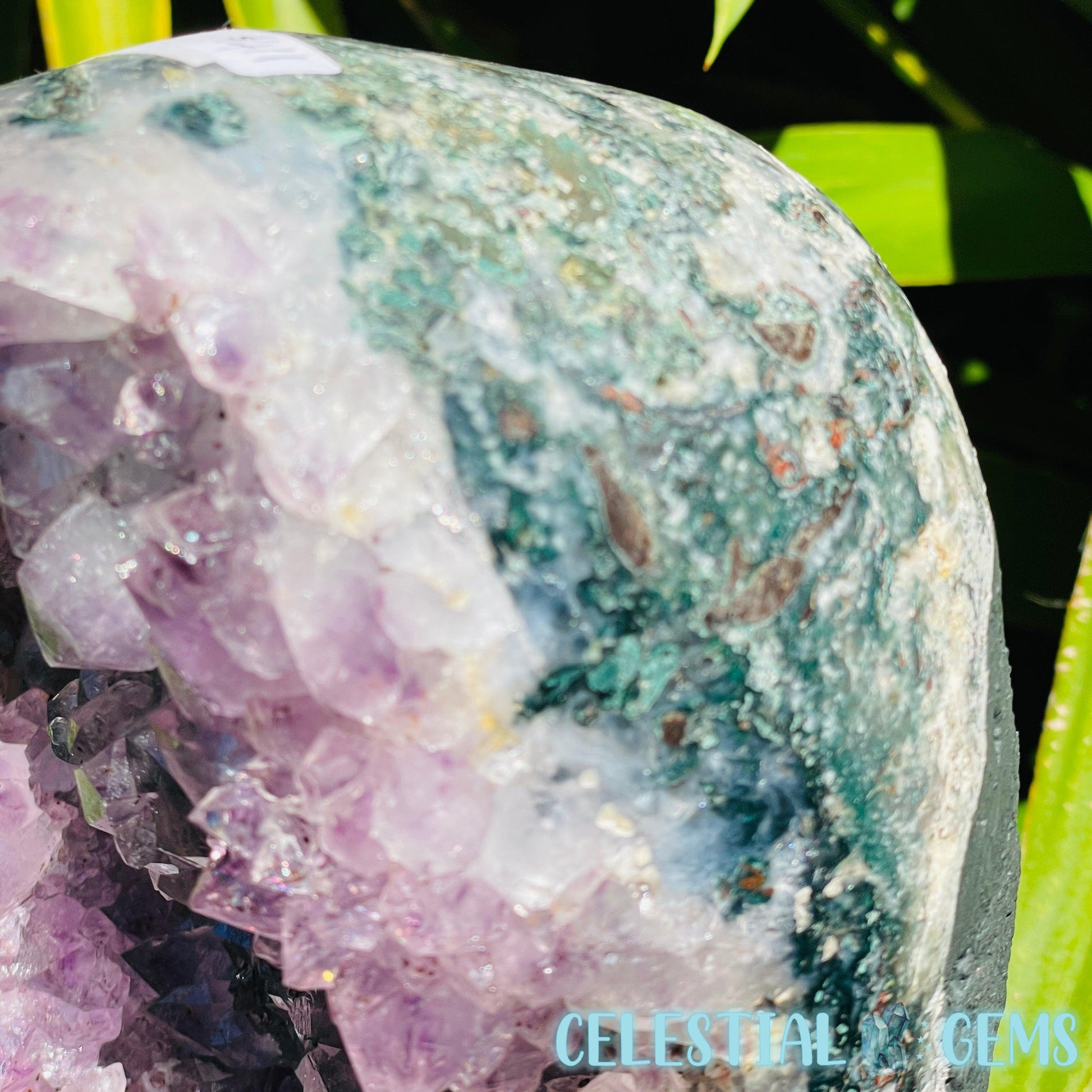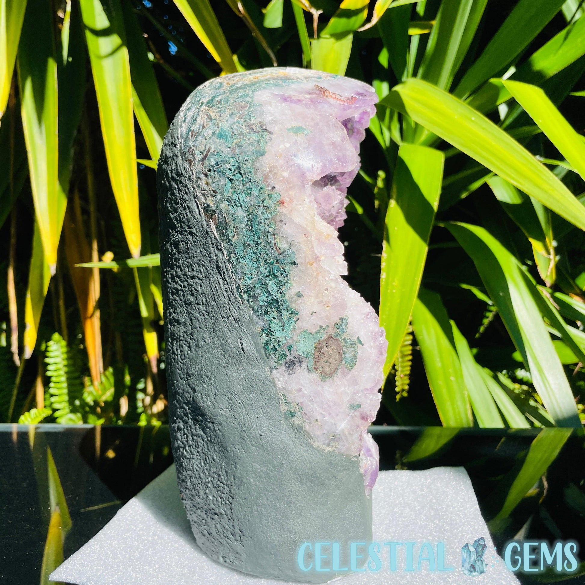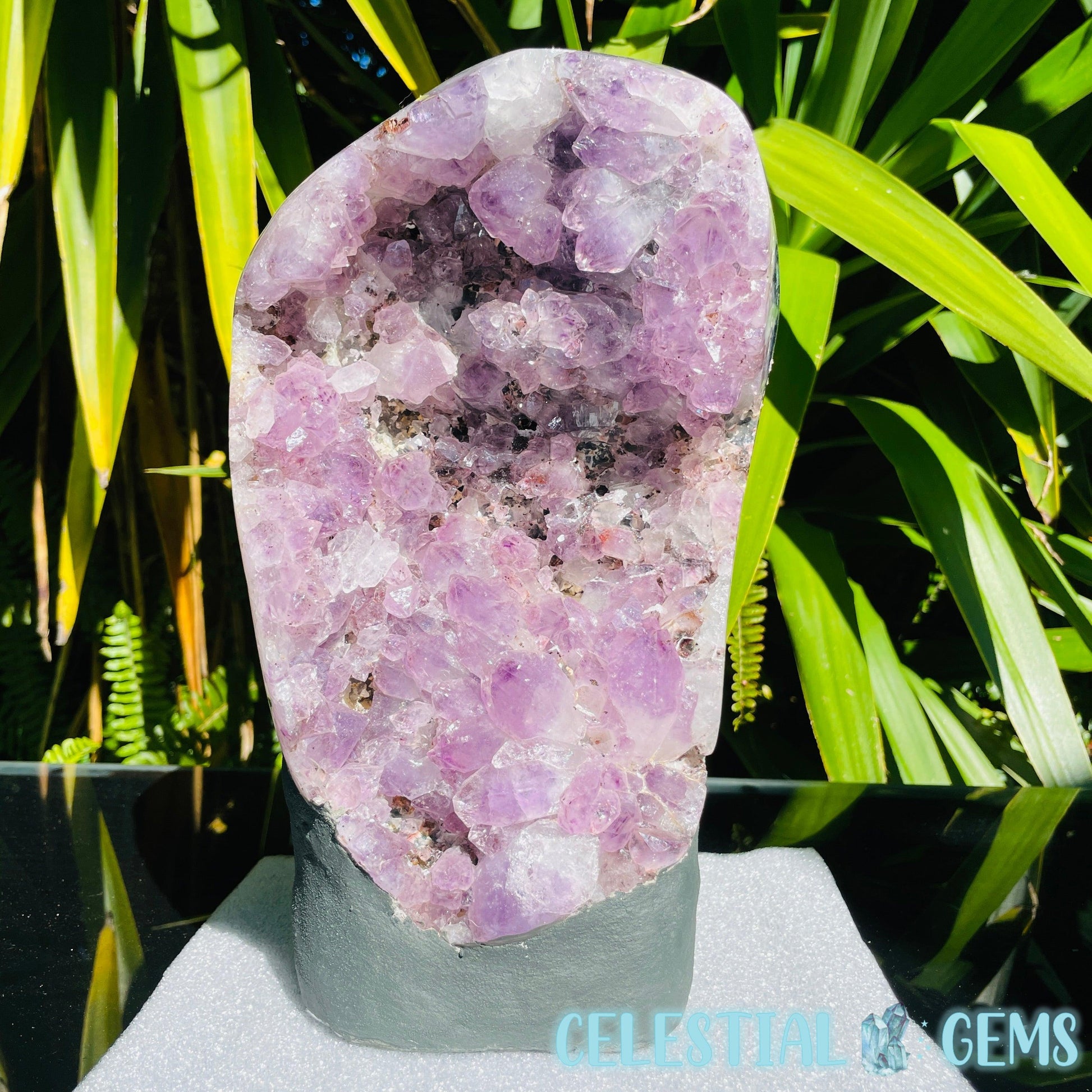 A large Amethyst cluster with phantom coloured crystals with Hematite Iron inclusions. This cluster has a beautiful polished edge with lots of Moss Agate on the sides and a concrete rear and base to make it stand.