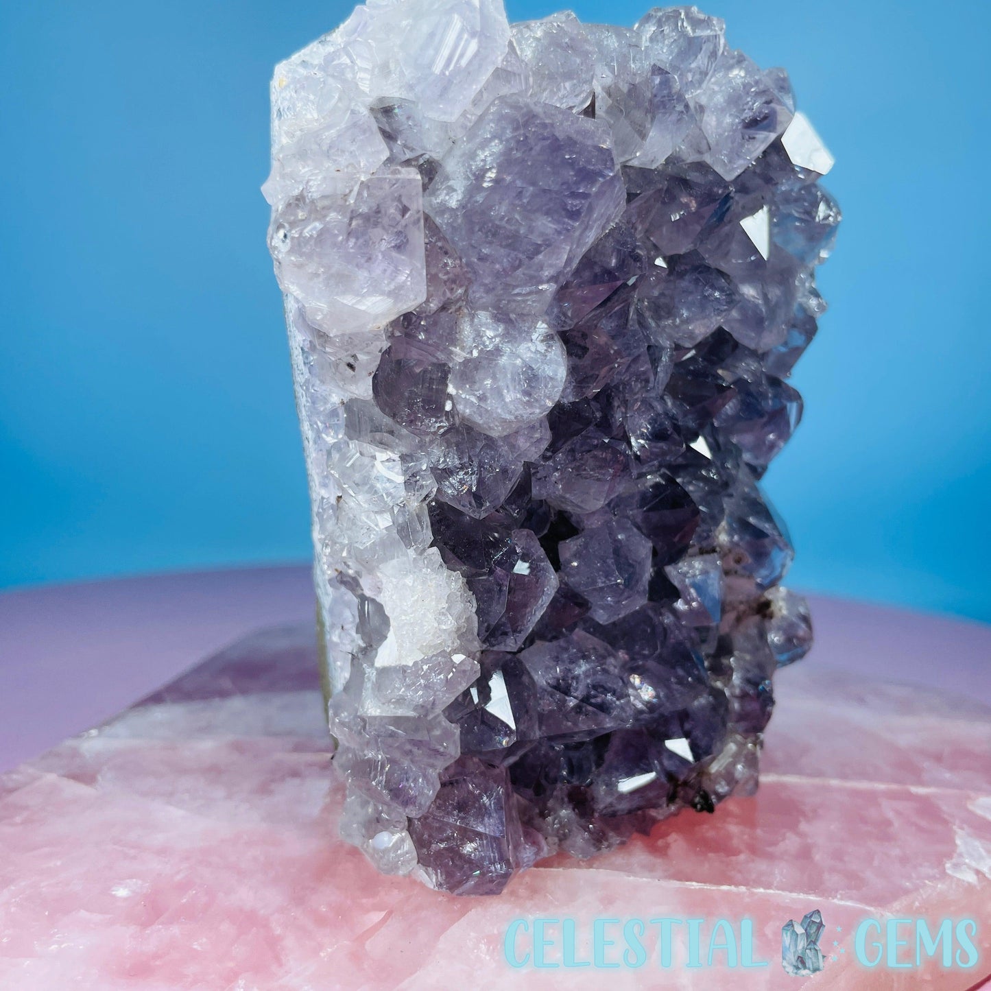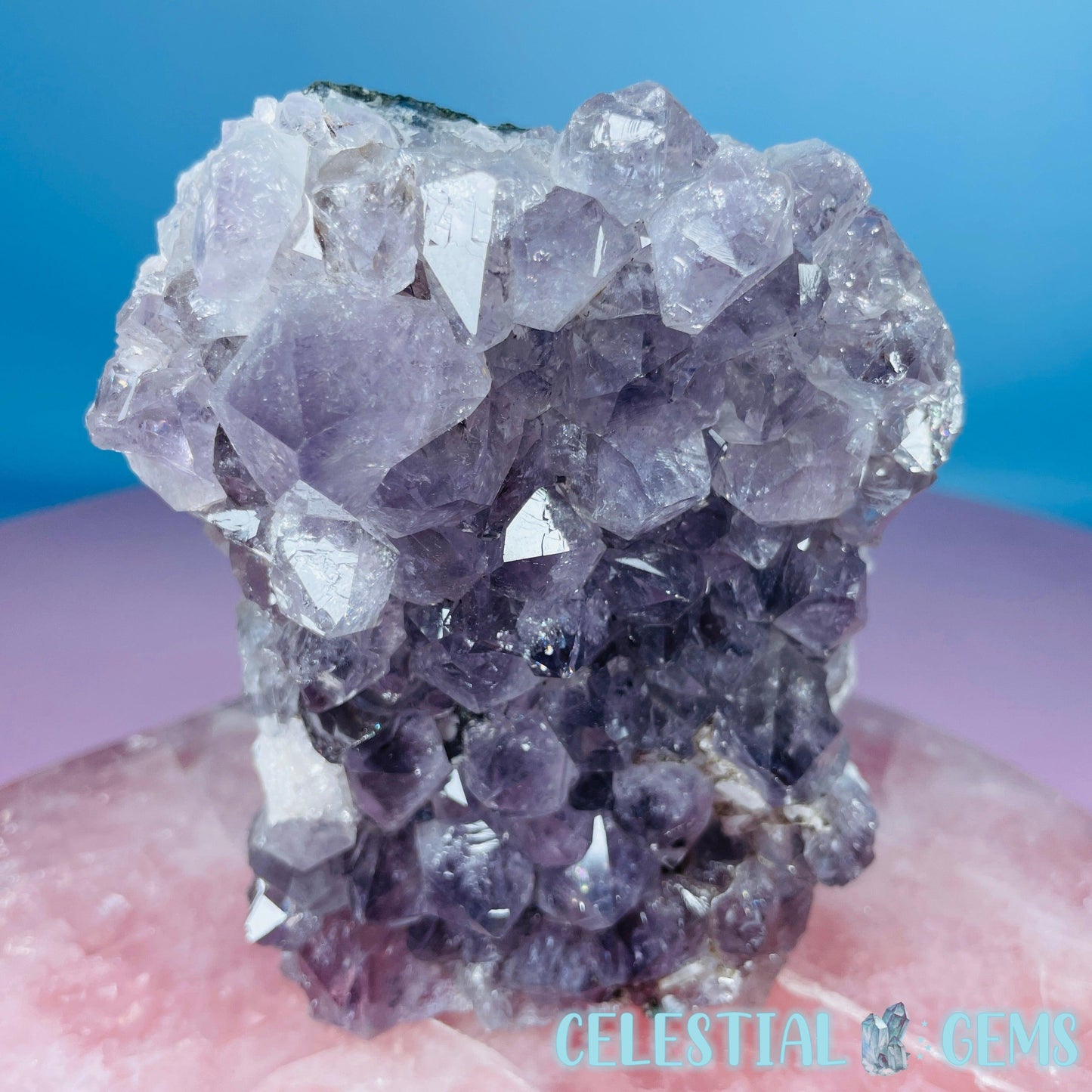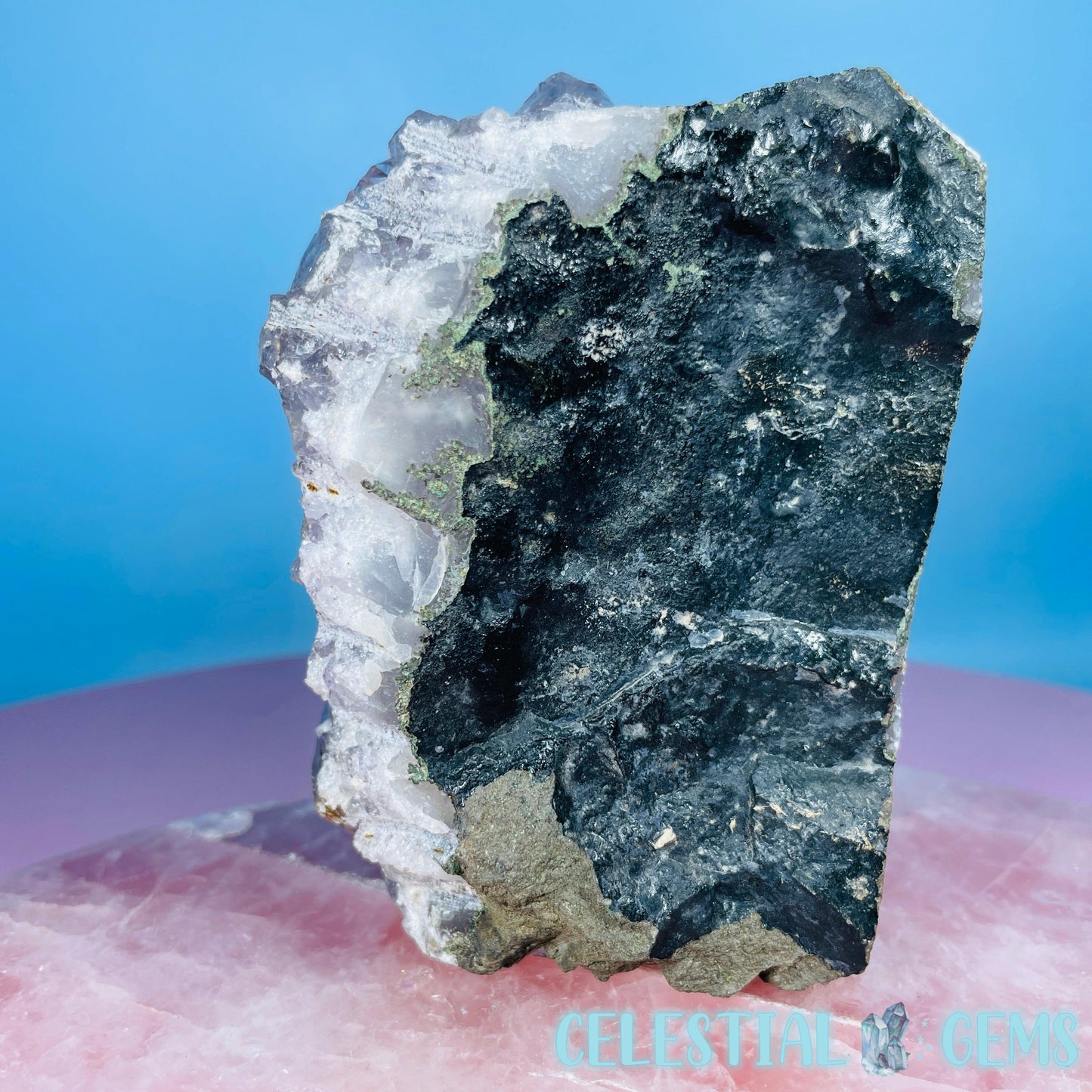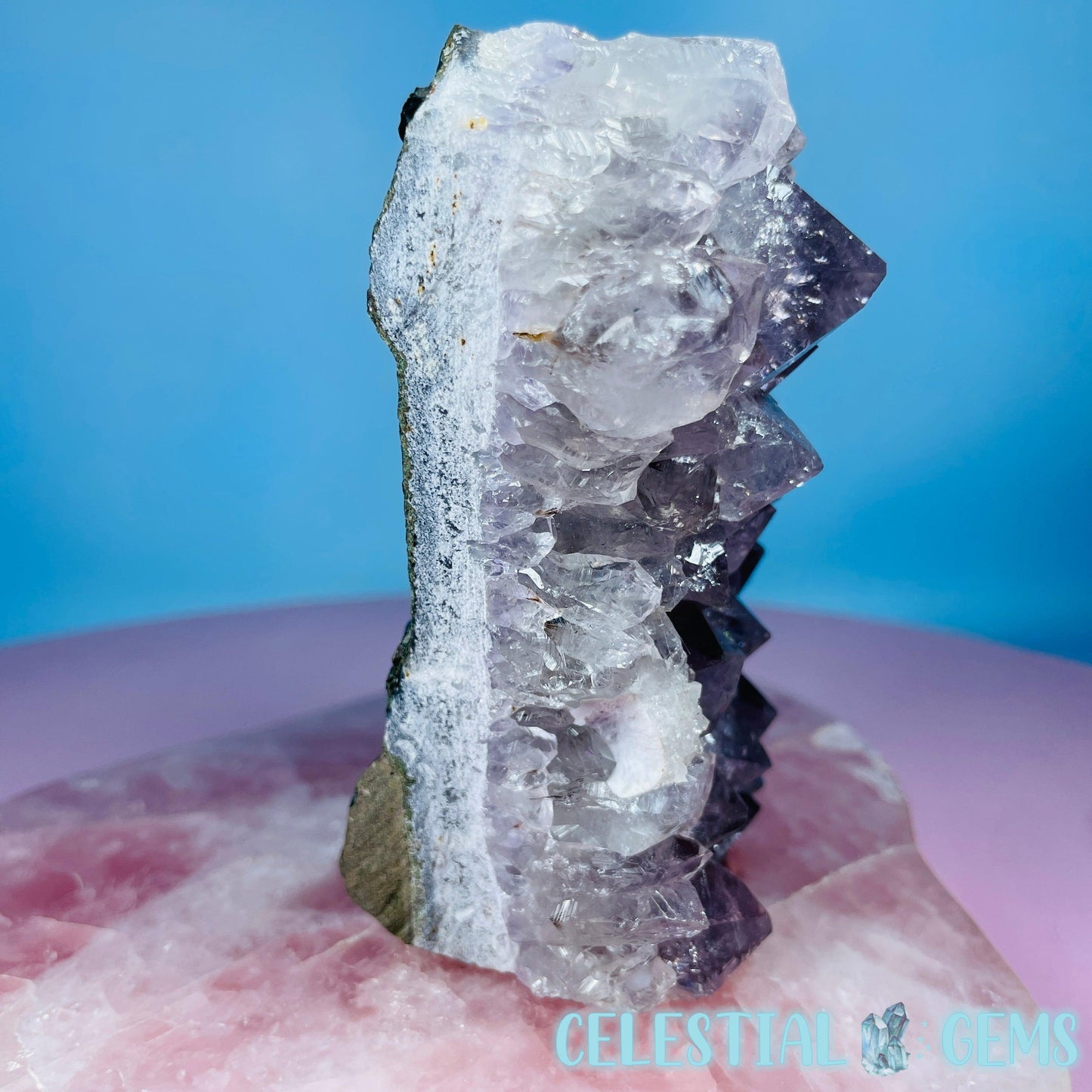 A stunning sparkly high grade Amethyst cluster with Celadonite and Basalt on the rear. The edge is natural and unpolished with a flat cut bottom so it can stand on its own. Sourced from Brazil.