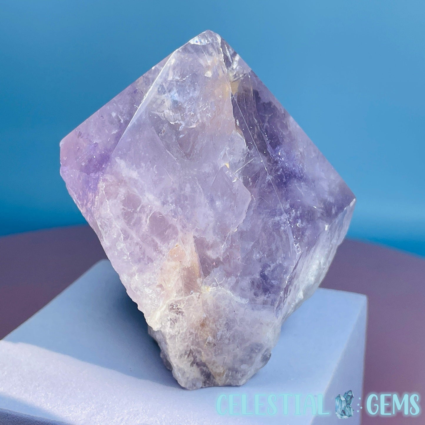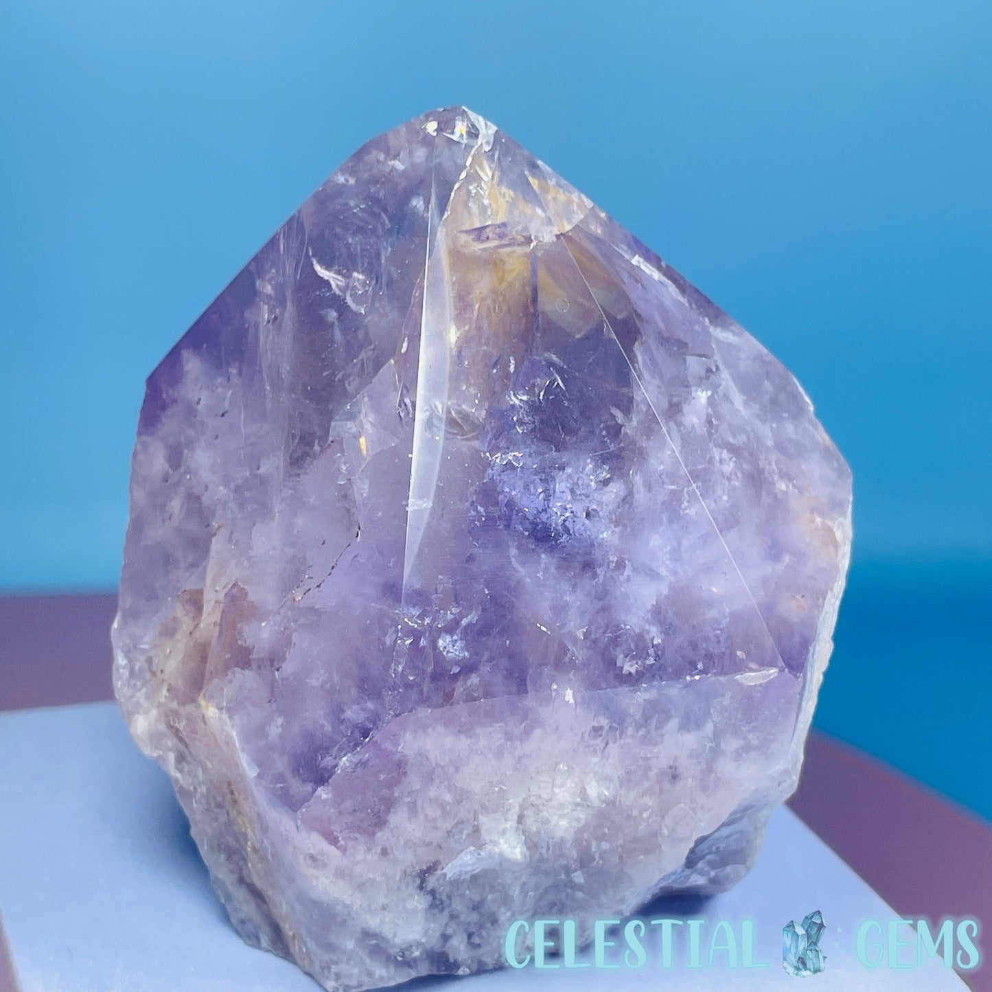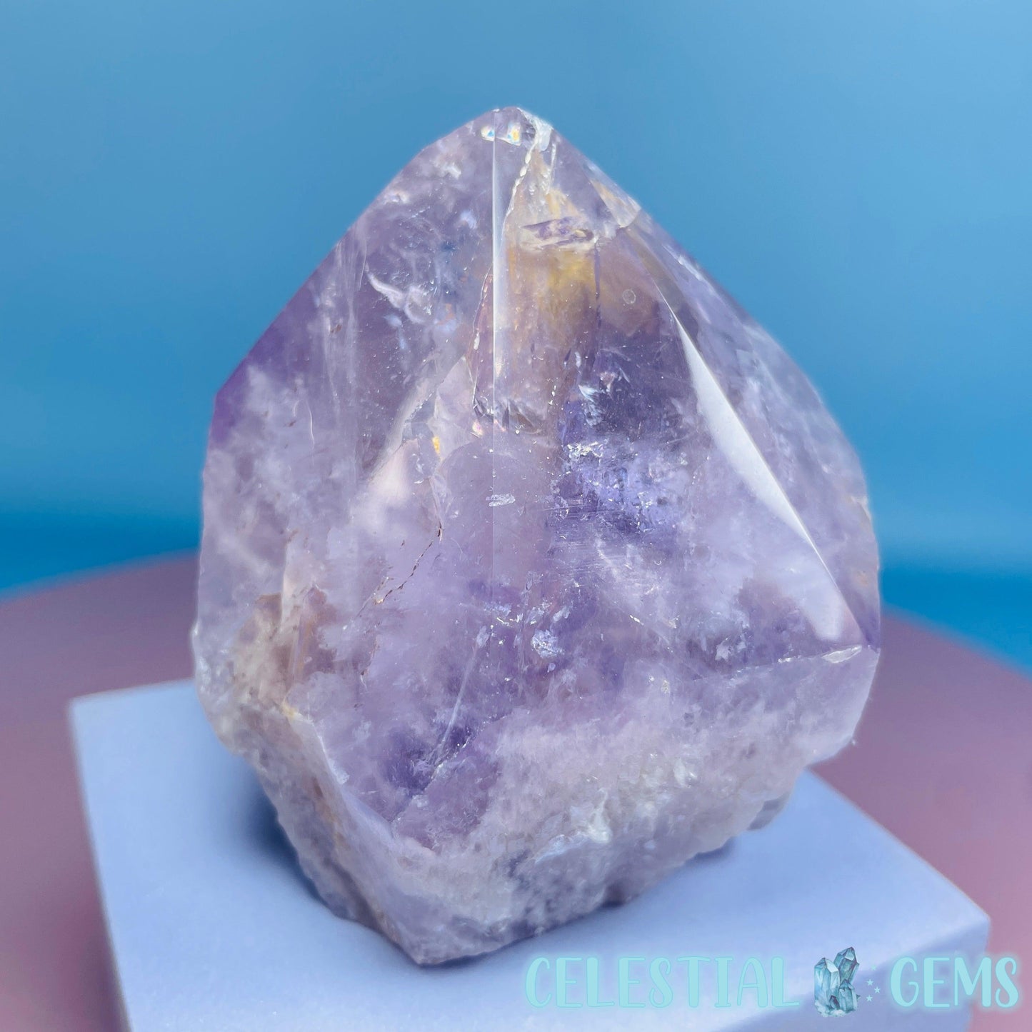 An Amethyst freeform with a raw cut base and a polished point on the top. Approx. 7.6cm x 6.6cm x 5.6cm. Weight 333g.