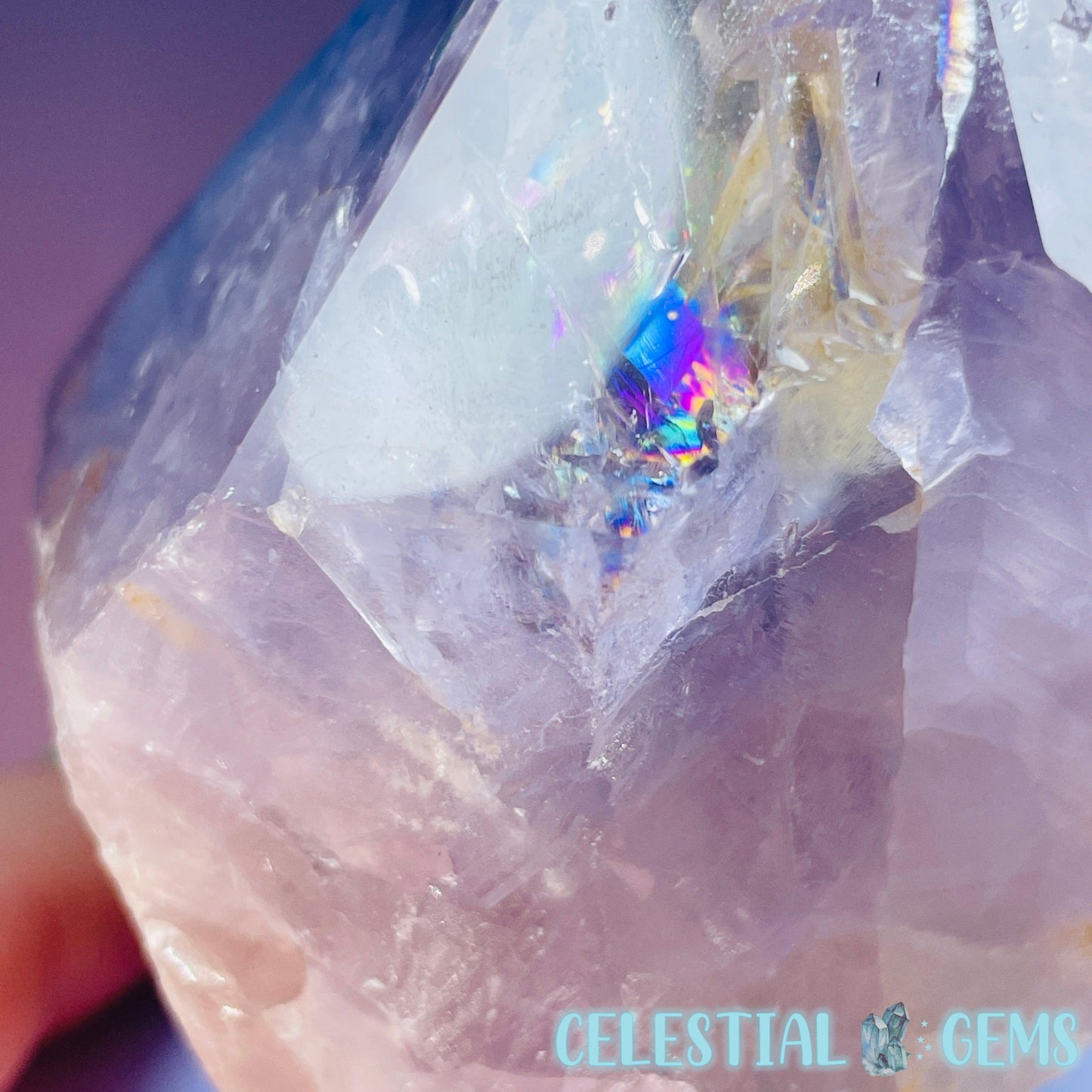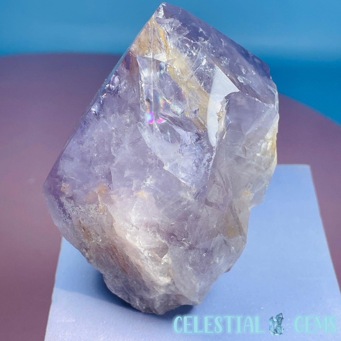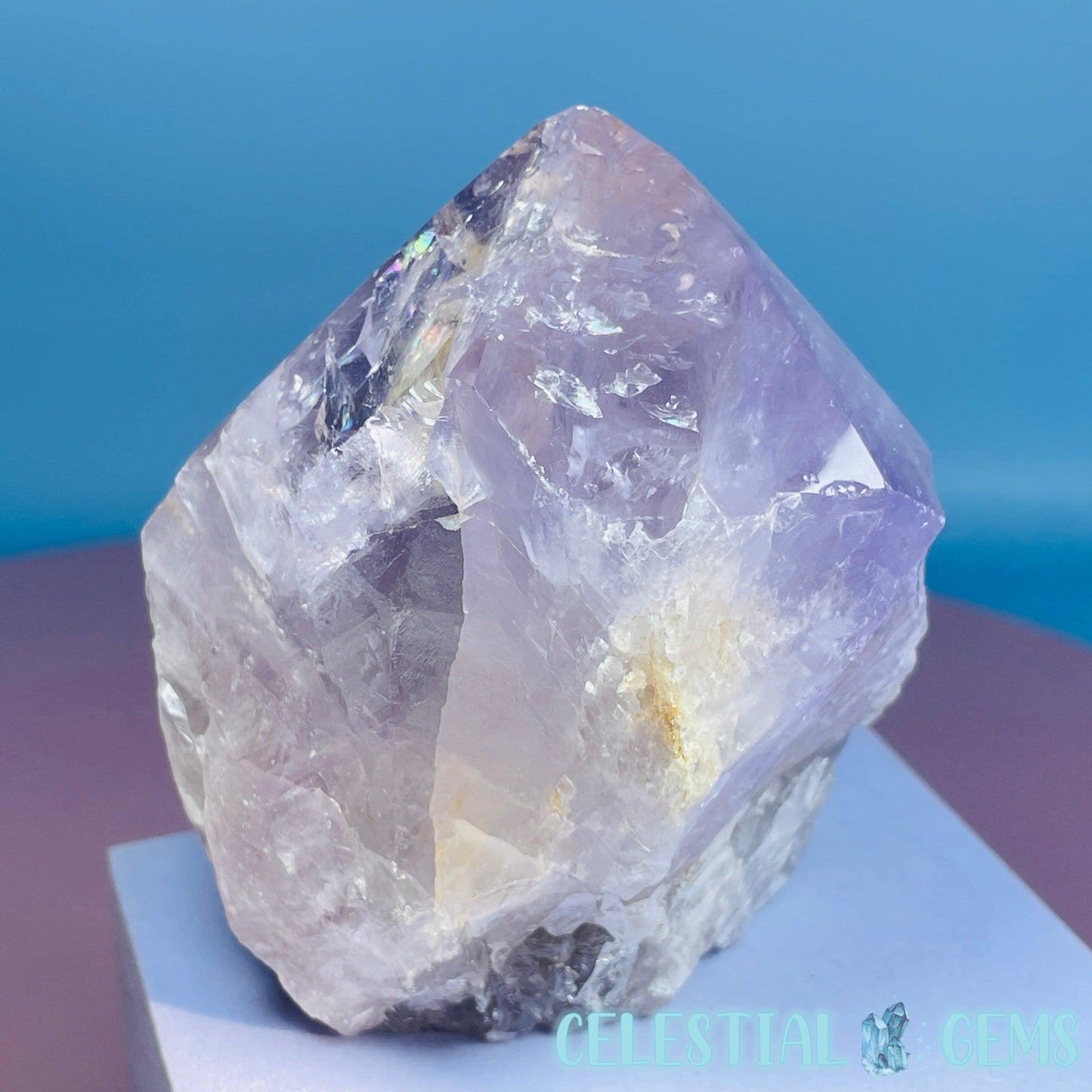An Amethyst freeform with a raw cut base and a polished point on the top. Approx. 7.6cm x 6.6cm x 5.6cm. Weight 333g.