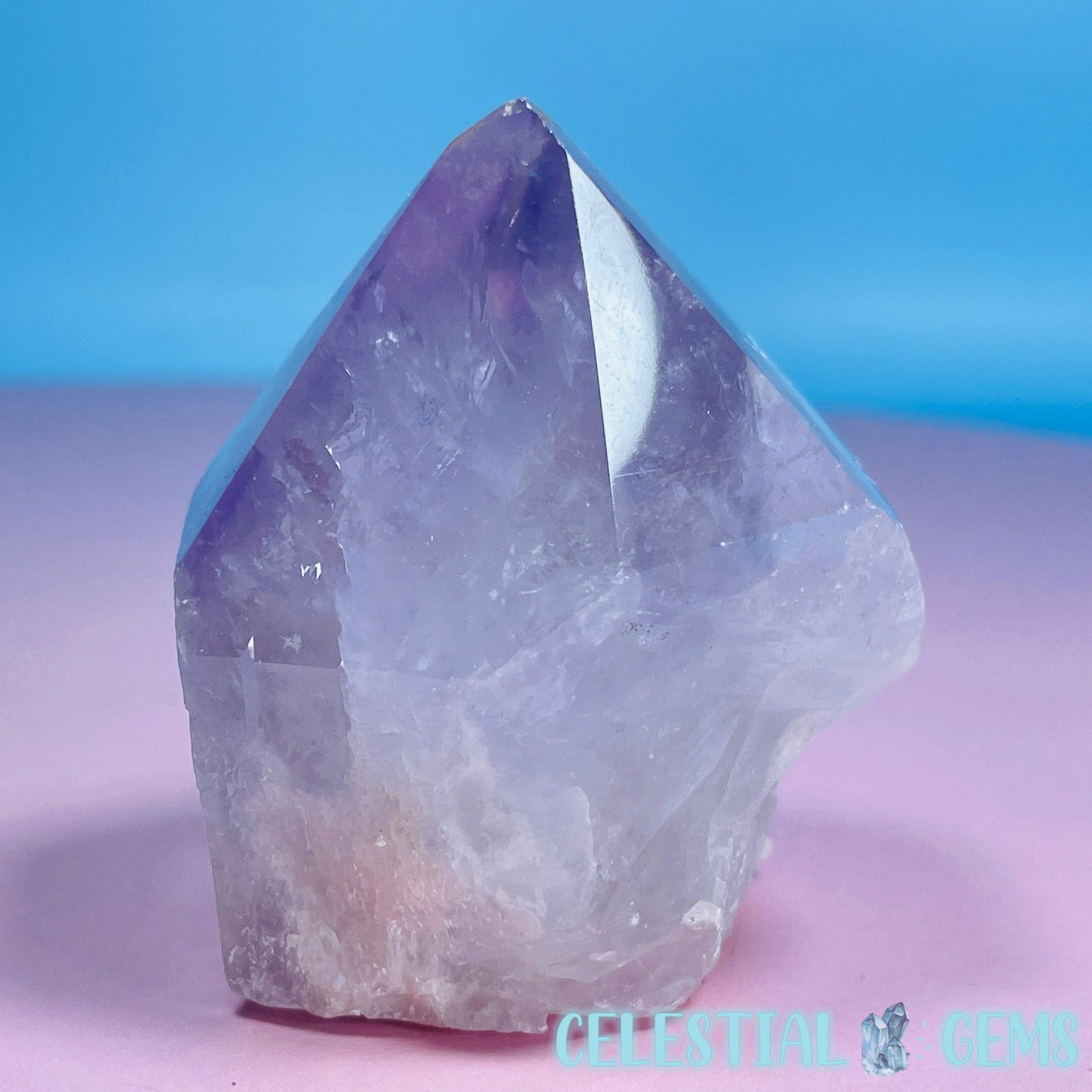 An Amethyst freeform with a raw cut base and a polished point on the top. Approx. 5.5cm x 4.6cm x 4.5cm. Weight 139g.