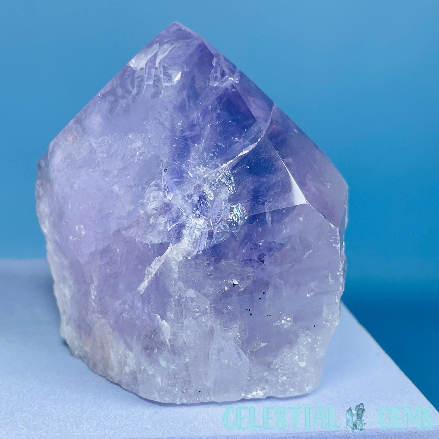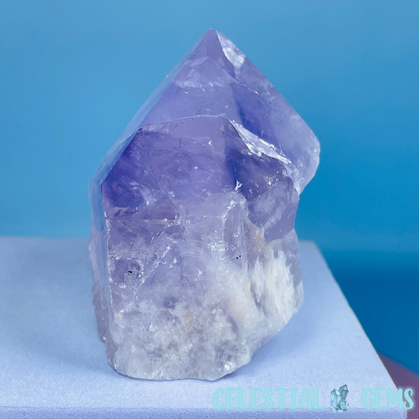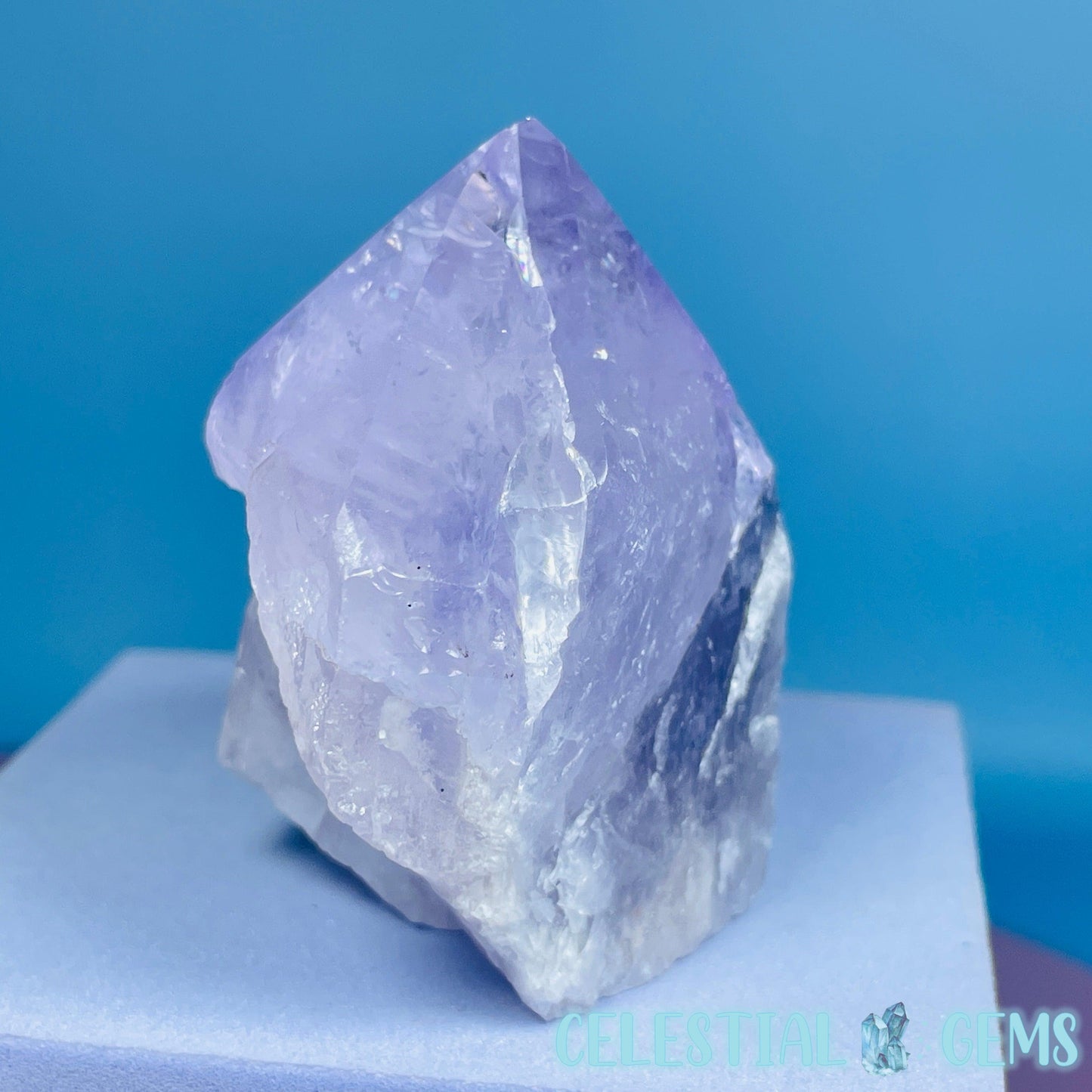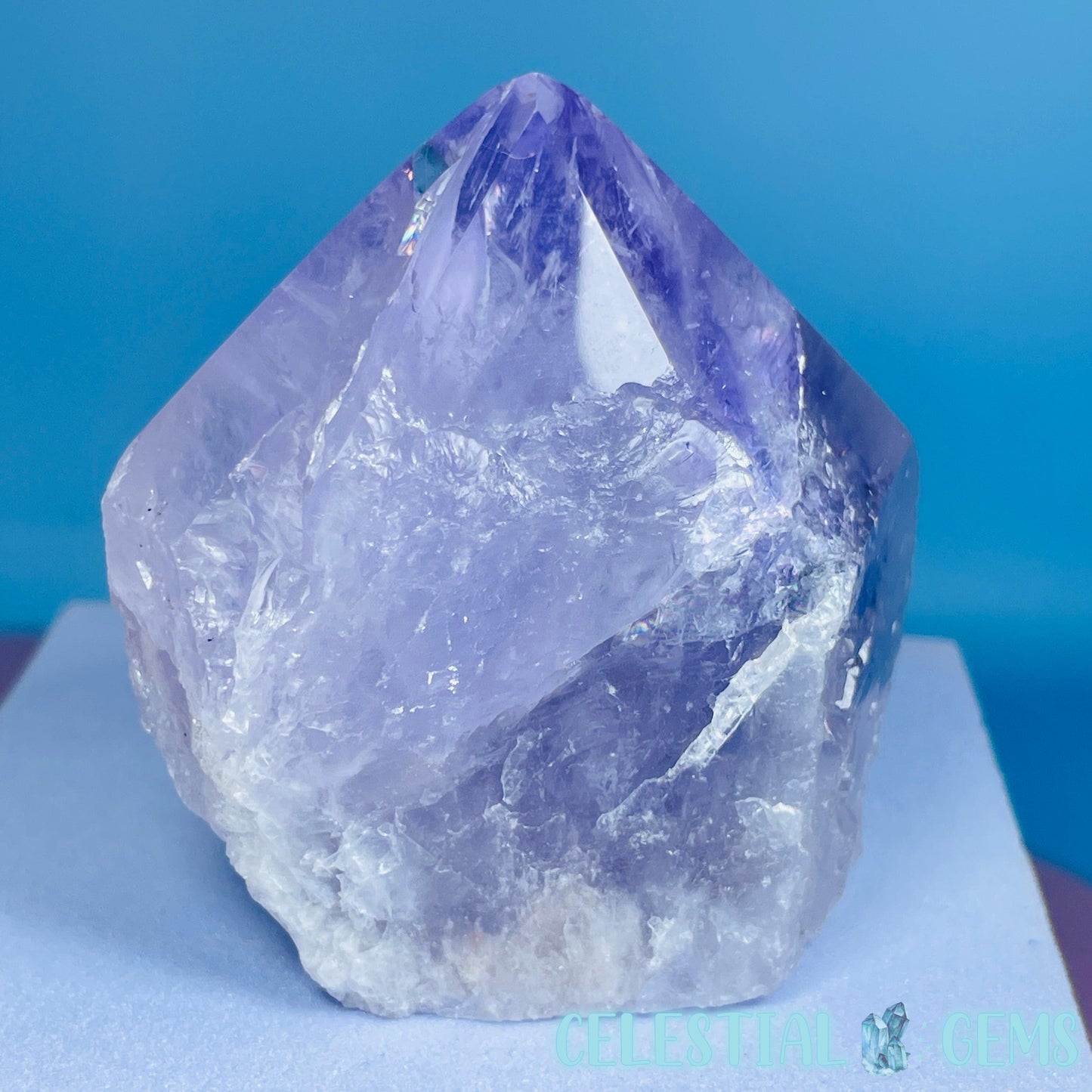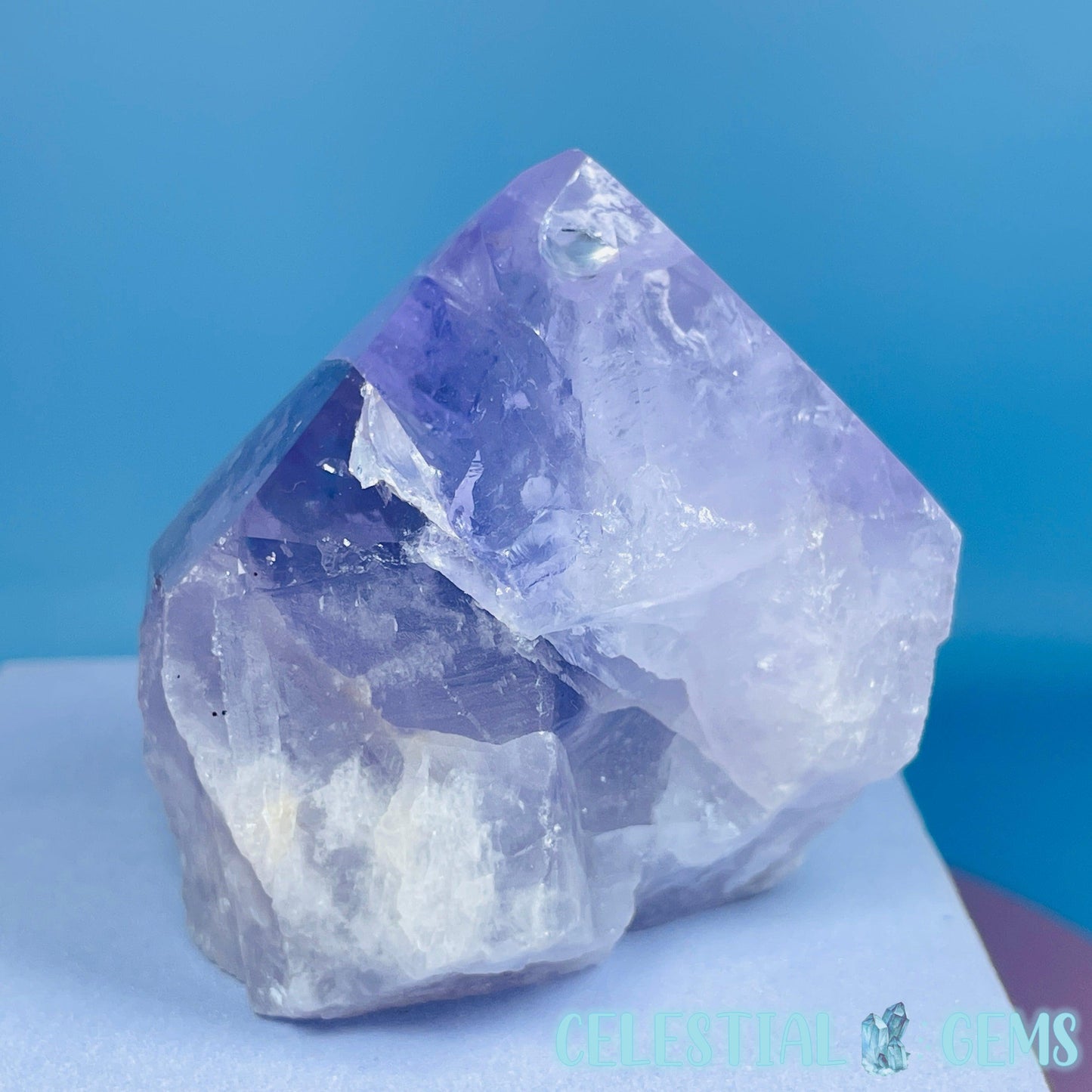 An Amethyst freeform with a raw cut base and a polished point on the top. Approx. 5.7cm x 5.6cm x 3.7cm. Weight 147g.