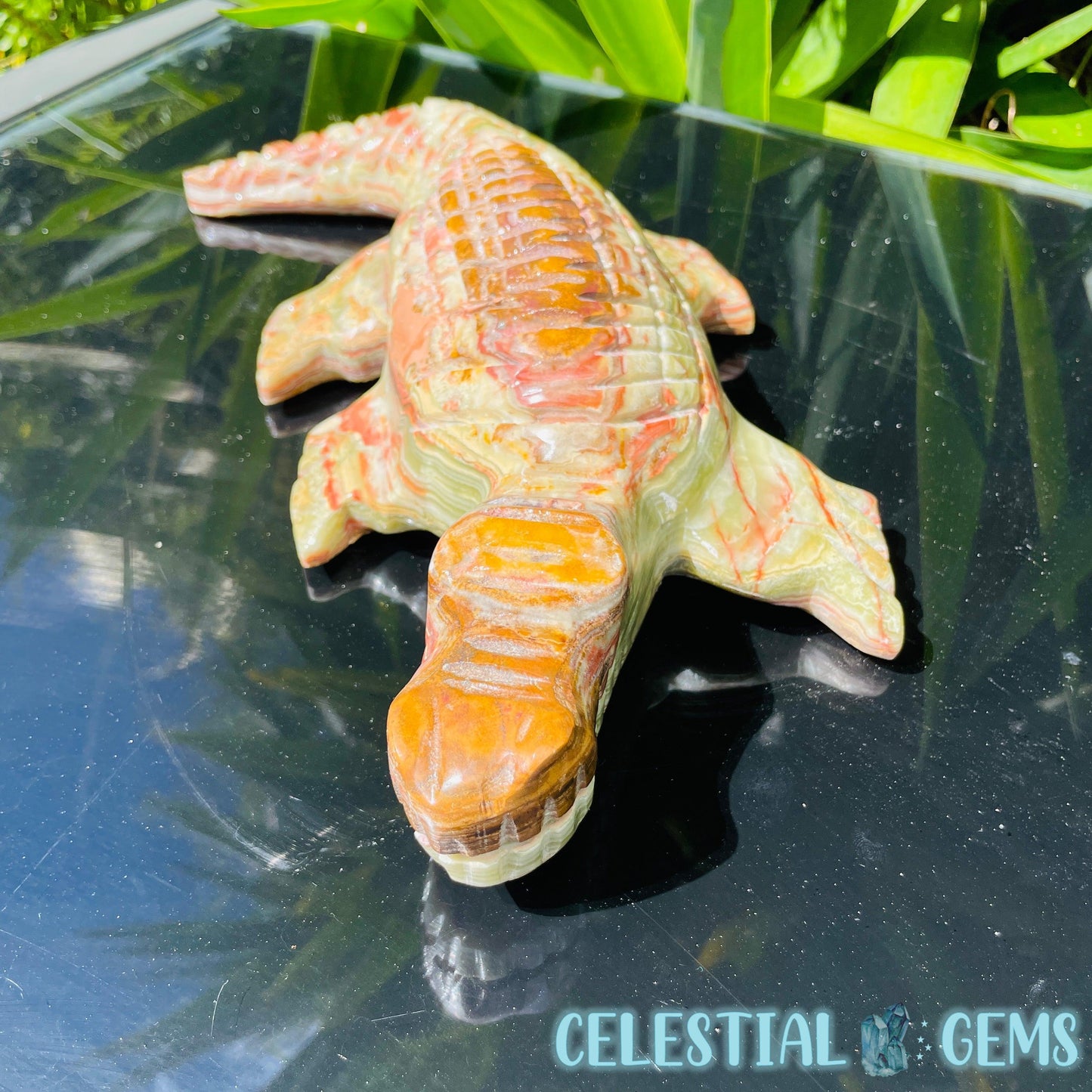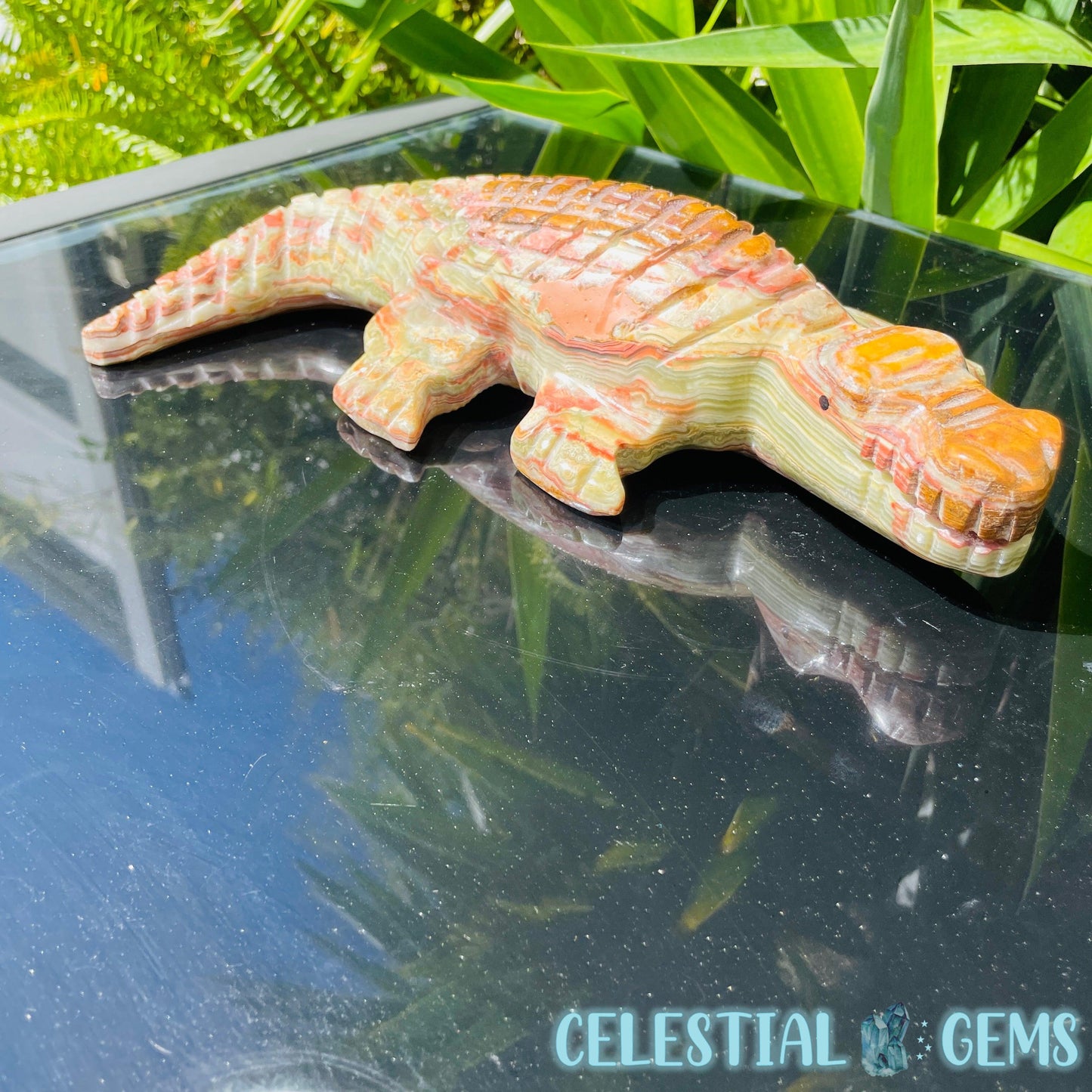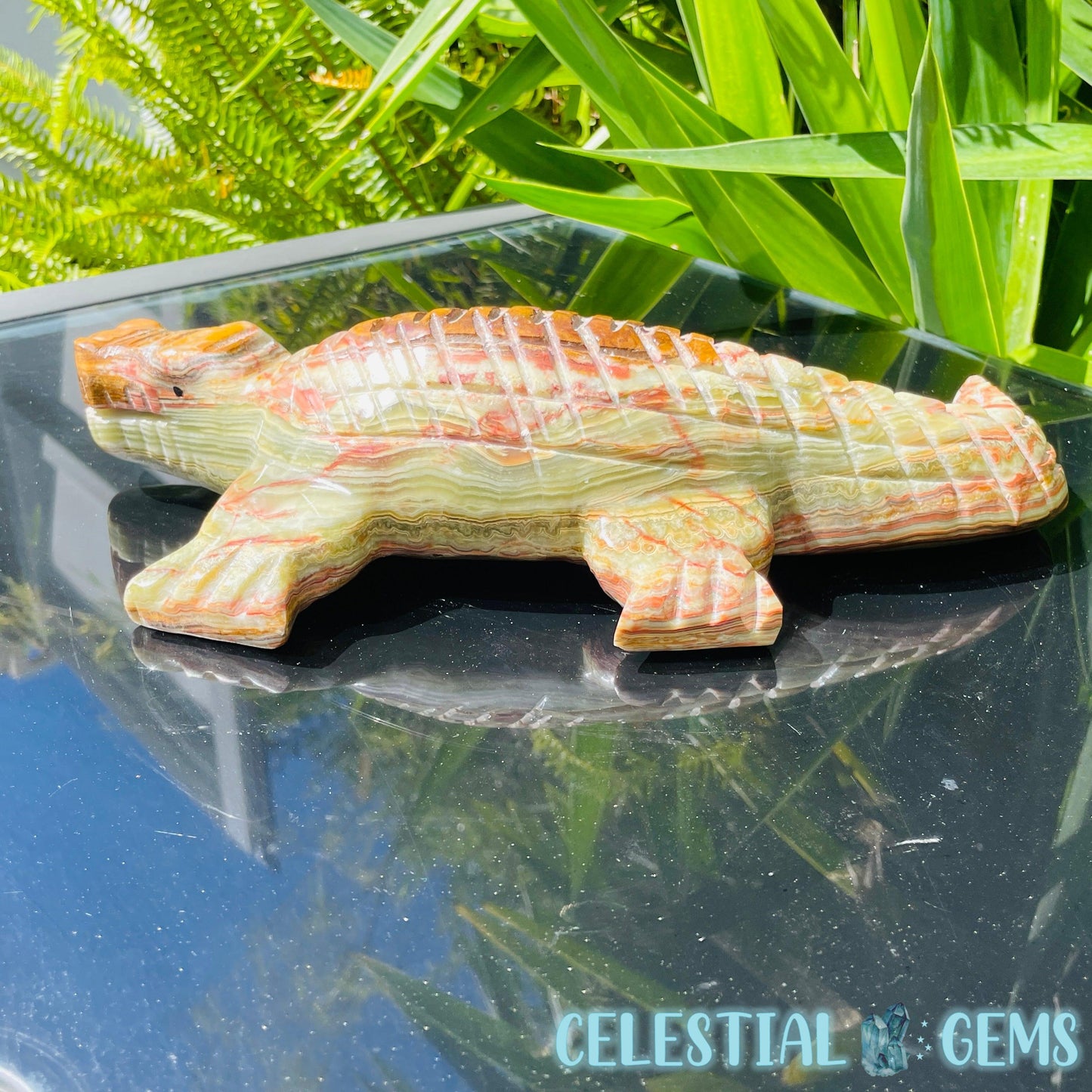 A large crocodile carving made of Banded Onyx Calcite with an incredible mix of earthy coloured Calcites such as greens, browns, reds and whites in stunning natural layers.