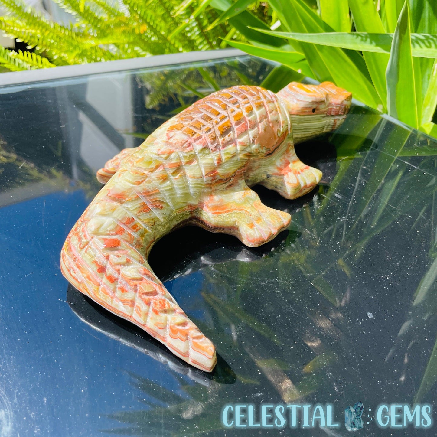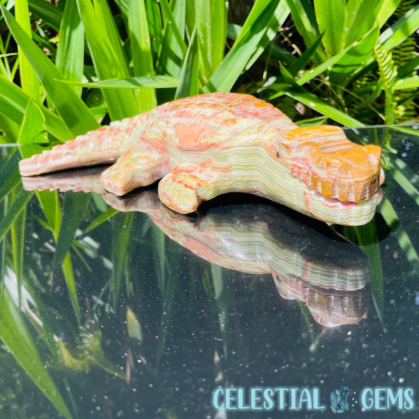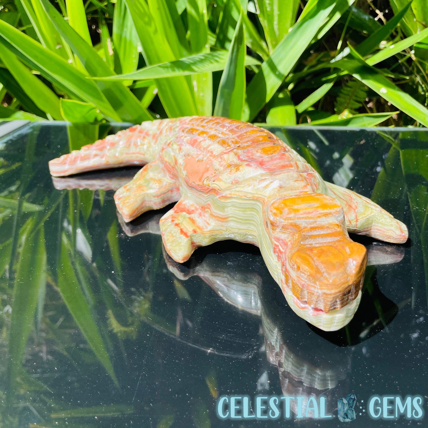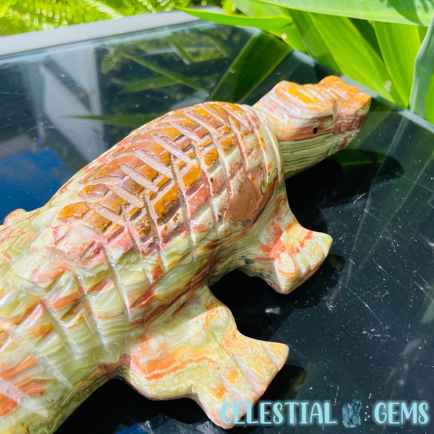 A large crocodile carving made of Banded Onyx Calcite with an incredible mix of earthy coloured Calcites such as greens, browns, reds and whites in stunning natural layers.