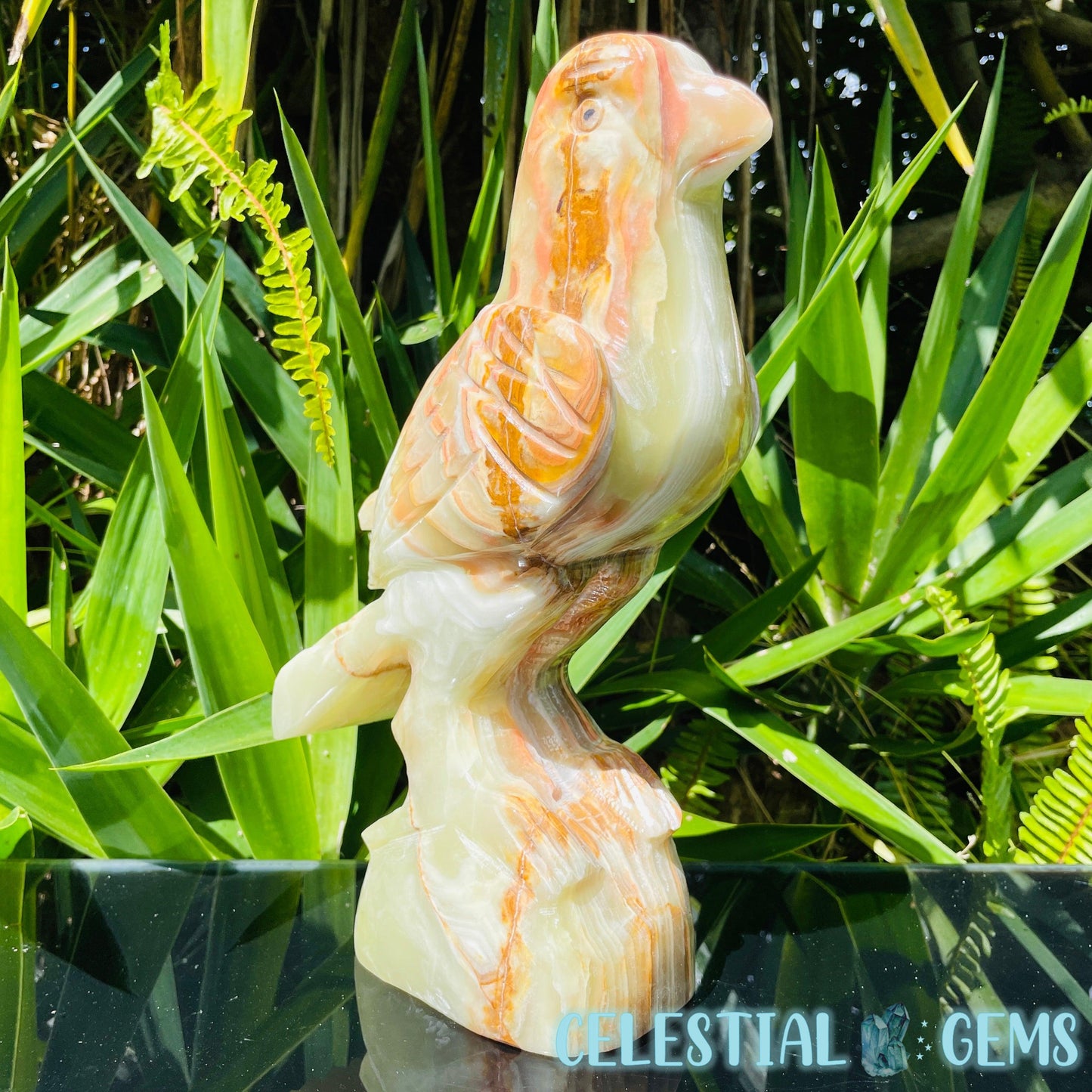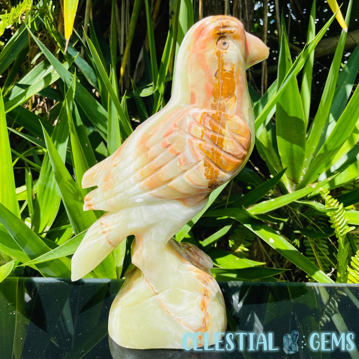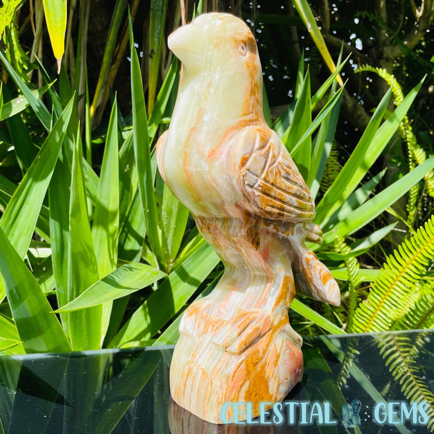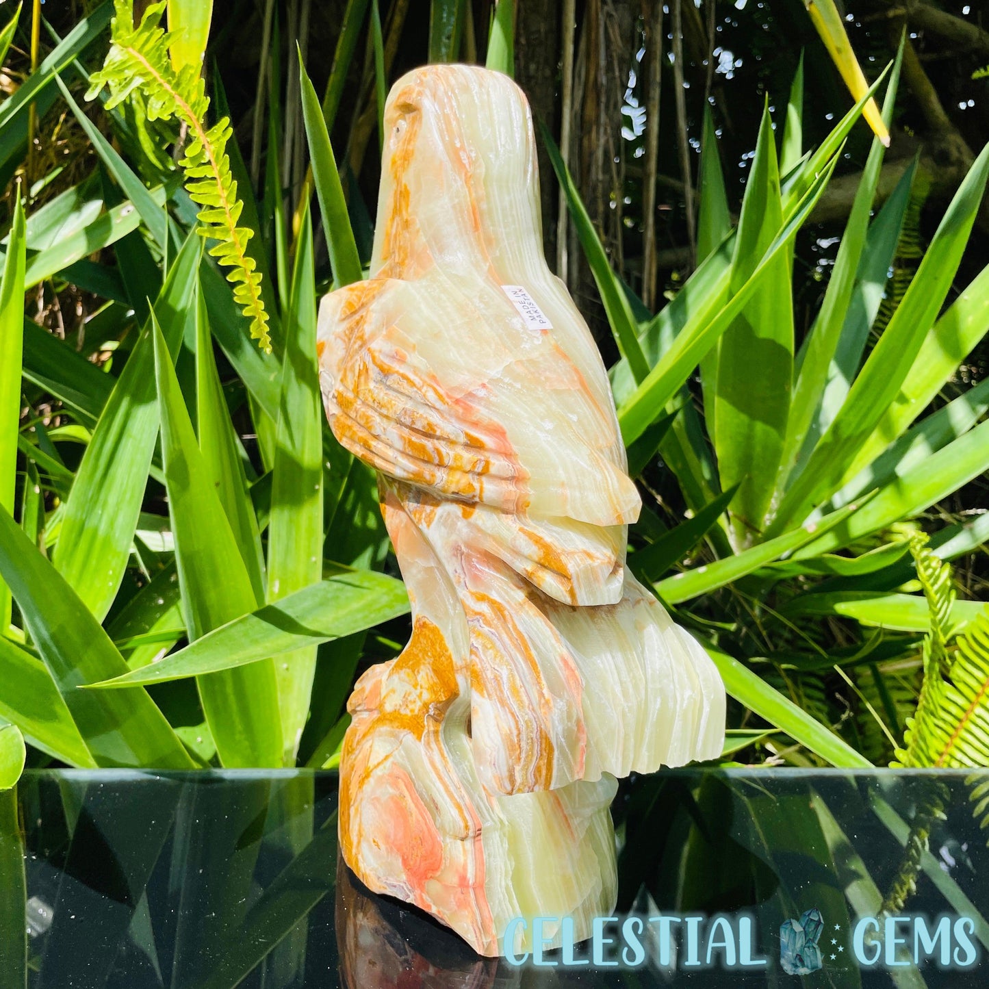 A large bird carving made of Banded Onyx Calcite with an incredible mix of earthy coloured Calcites such as greens, browns, reds and whites in stunning natural layers.