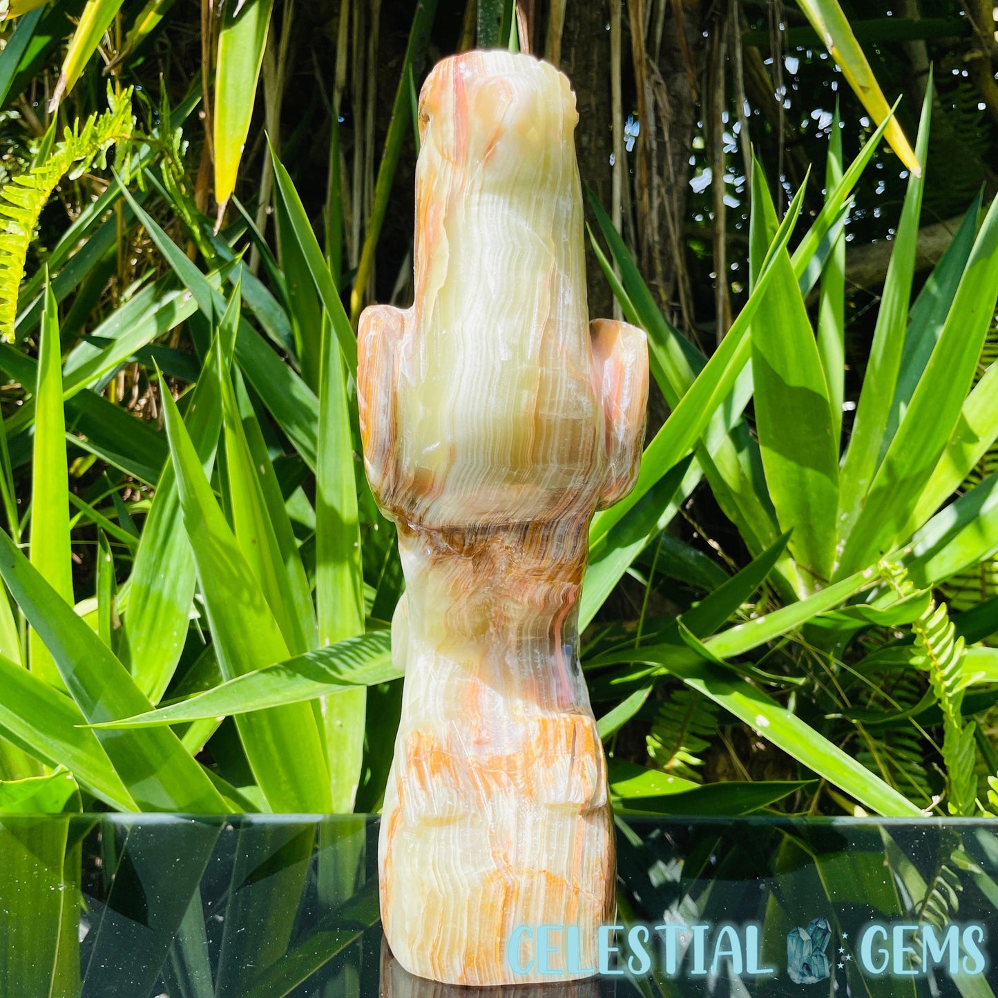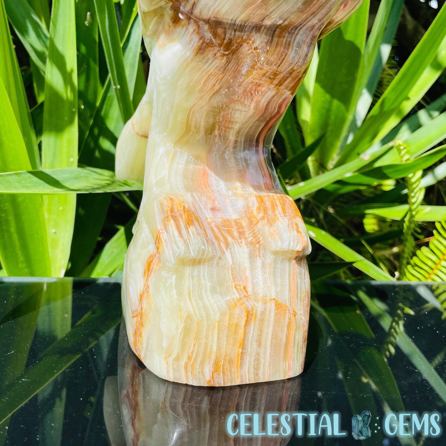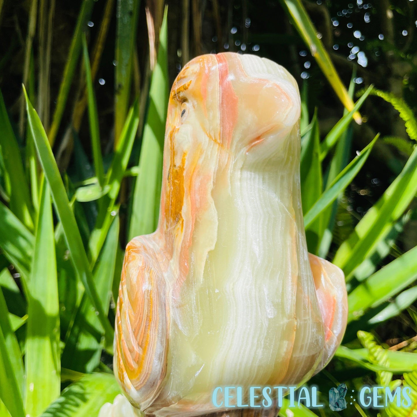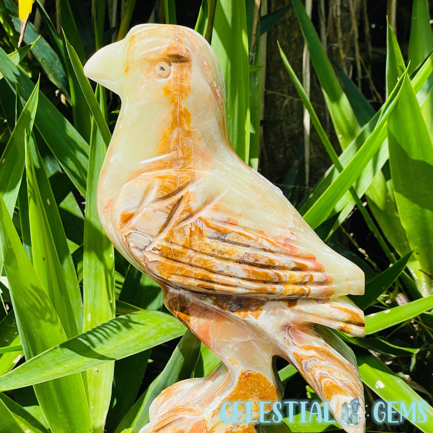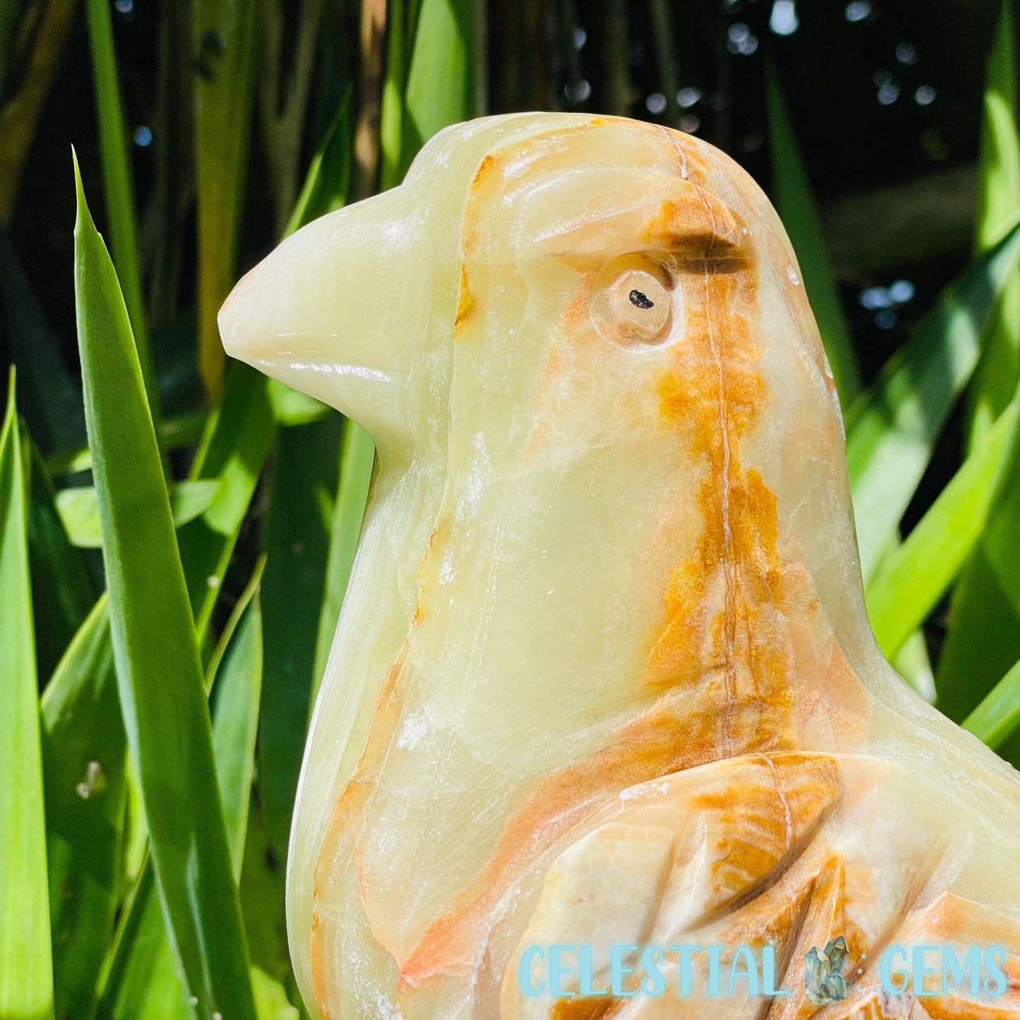 A large bird carving made of Banded Onyx Calcite with an incredible mix of earthy coloured Calcites such as greens, browns, reds and whites in stunning natural layers.