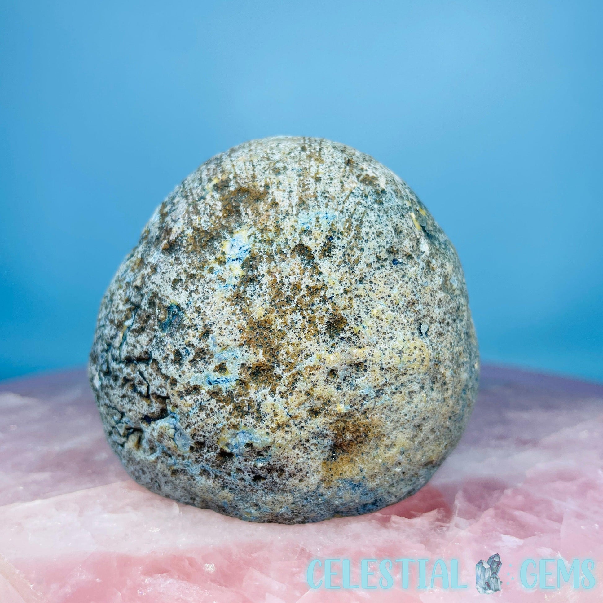 A crystallized Agate geode that is cut flat with a polished face and raw rock on the rear. Dyed blue. Lovely sparkles in the Agate crystallization and beautiful banding in the layers. Approx. 7.3cm x 6.4cm x 3cm.