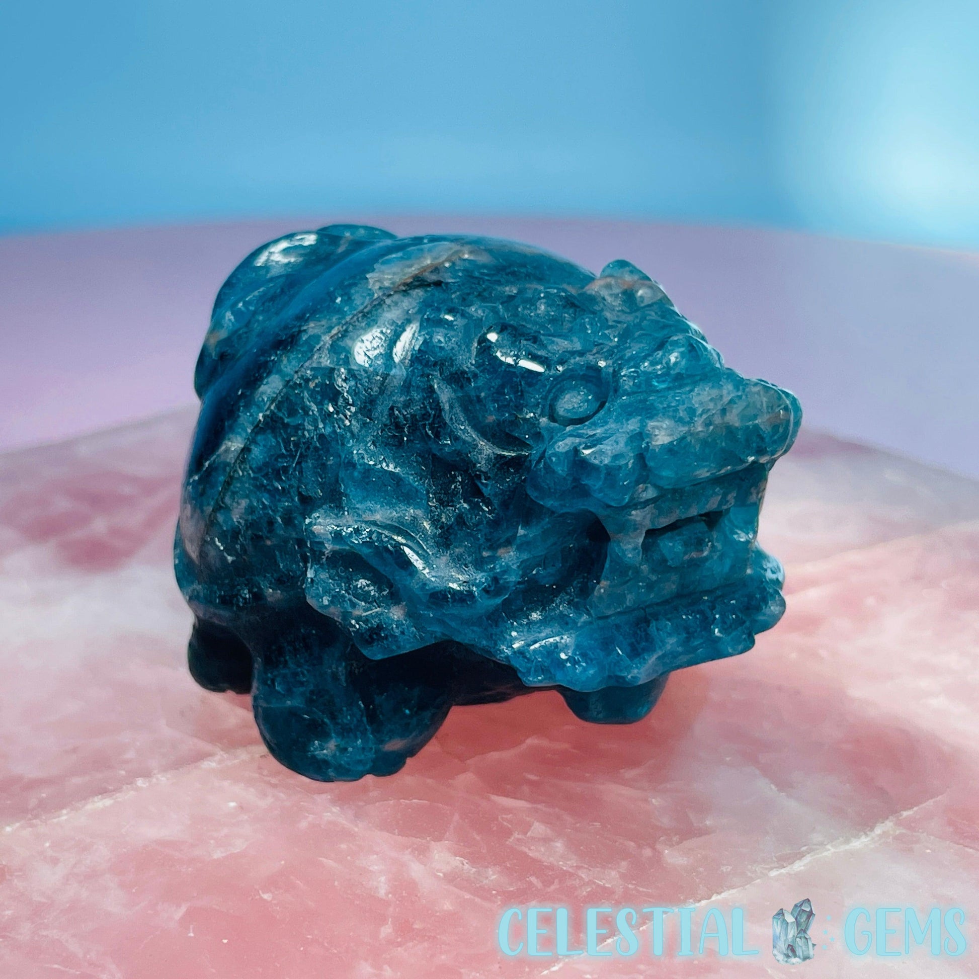 A dark blue flashy Apatite carving of a Pixiu - a mythological creature from ancient Chinese culture which depicts the head of a dragon and the body of a frog (sometimes a lion). The Pixiu is a symbol of luck, fortune and is a protector of souls and the way of feng shui.