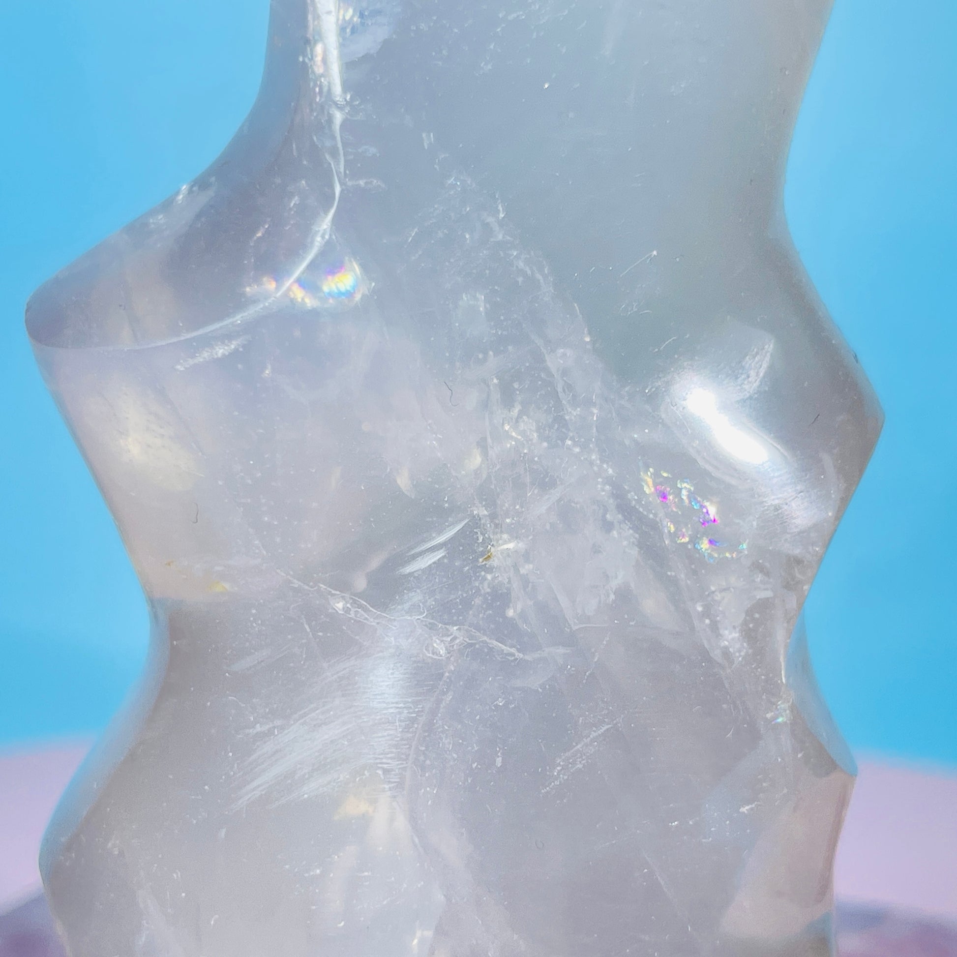 A medium flame freeform of Blue Rose Quartz. An uncommon variety of Quartz with a faint blue grey glow and flashes within. Sourced from Madagascar.