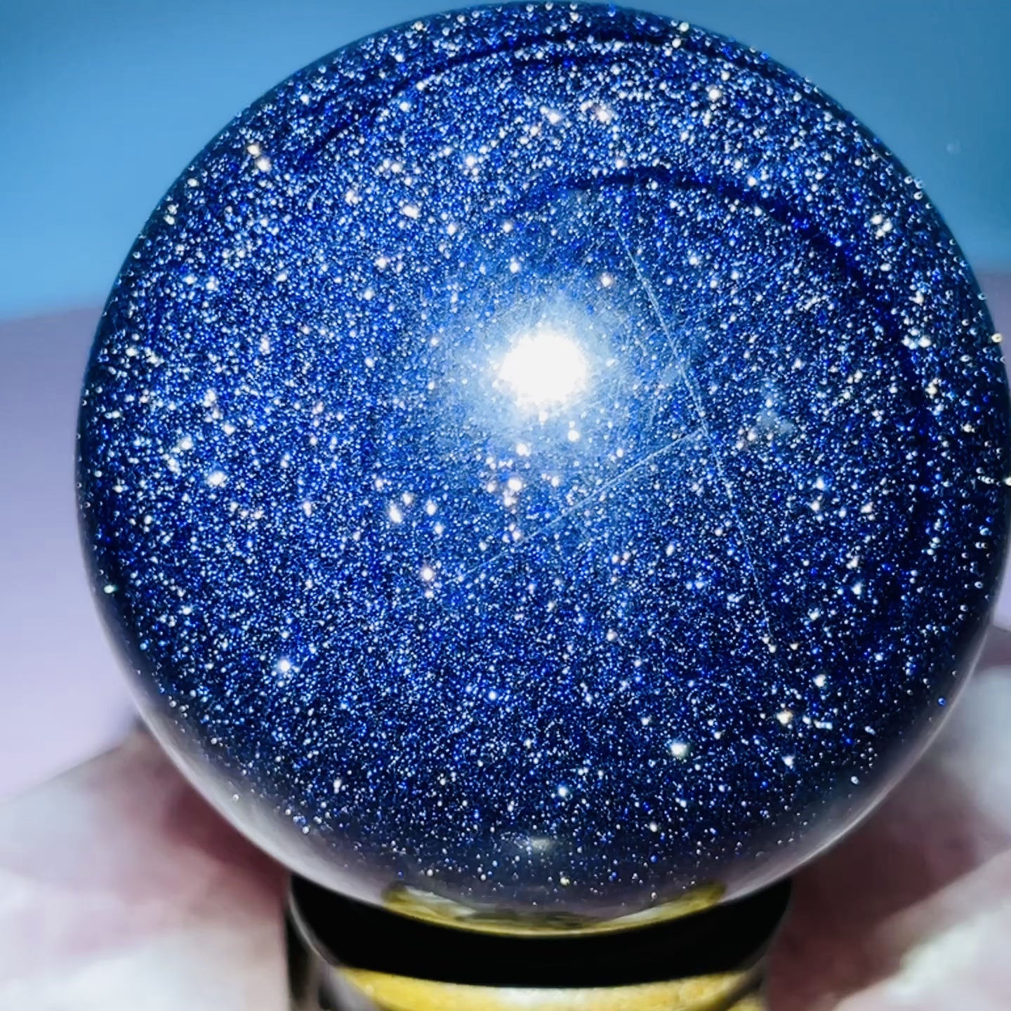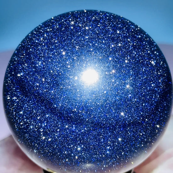 A sparkly sphere carved from Blue Sandstone, a man-made glass with copper sparkles inside. Approx. 5.7cm diameter. Stand sold separately.