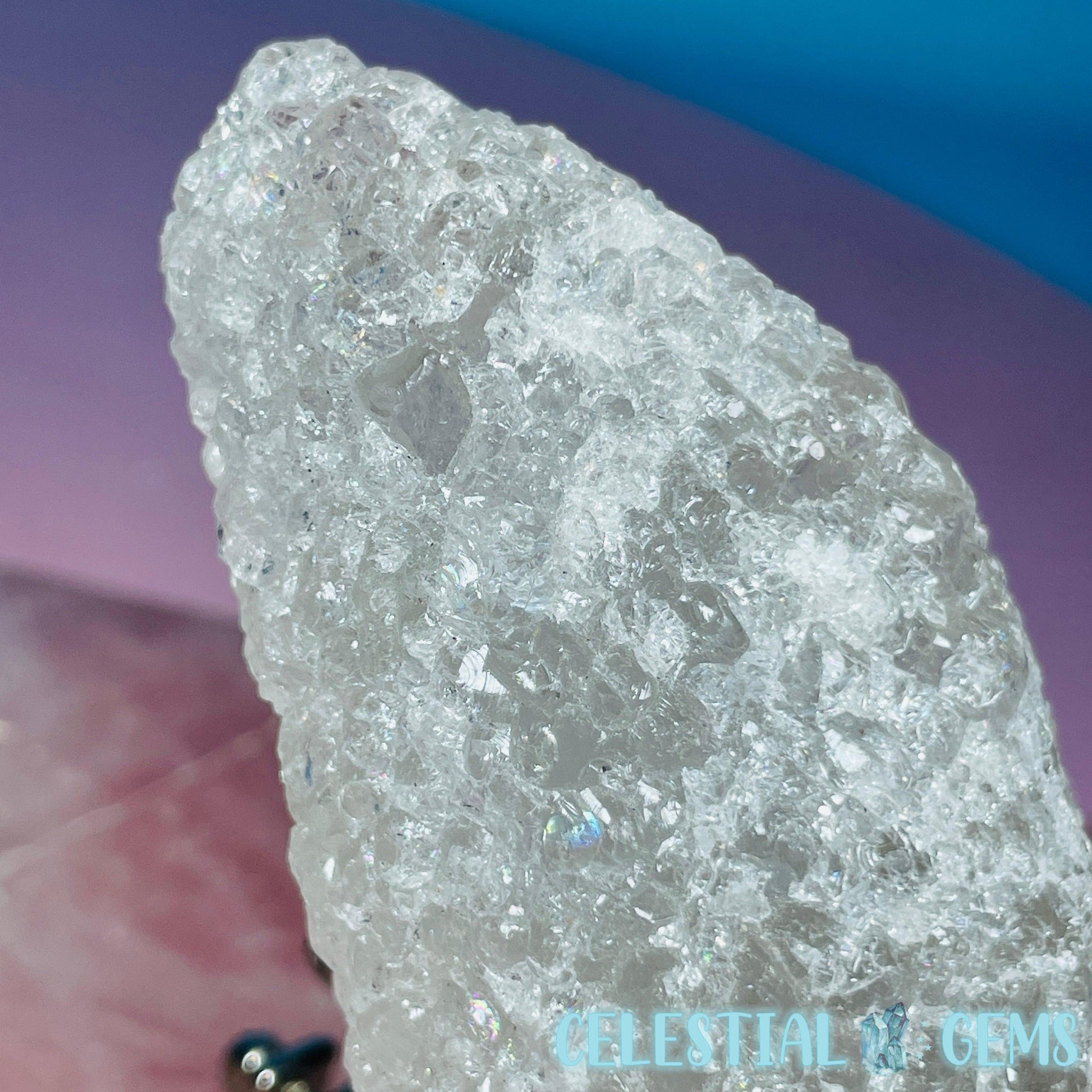 A natural point of rare Buddha Head Quartz (Also known as Nirvana or Himalayan Ice Quartz). This stone exhibits a pockmarked exterior caused by hydrothermal activities.