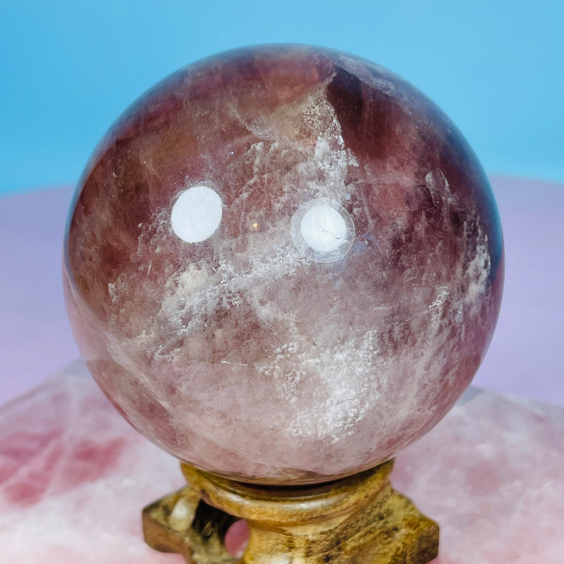 A medium sphere of layered, multicoloured Fluorite - this variety is known as 'Candy Fluorite' with its candy-coloured layers. We have photographed these on a light to show the translucency and range of colours (light sold separately).
