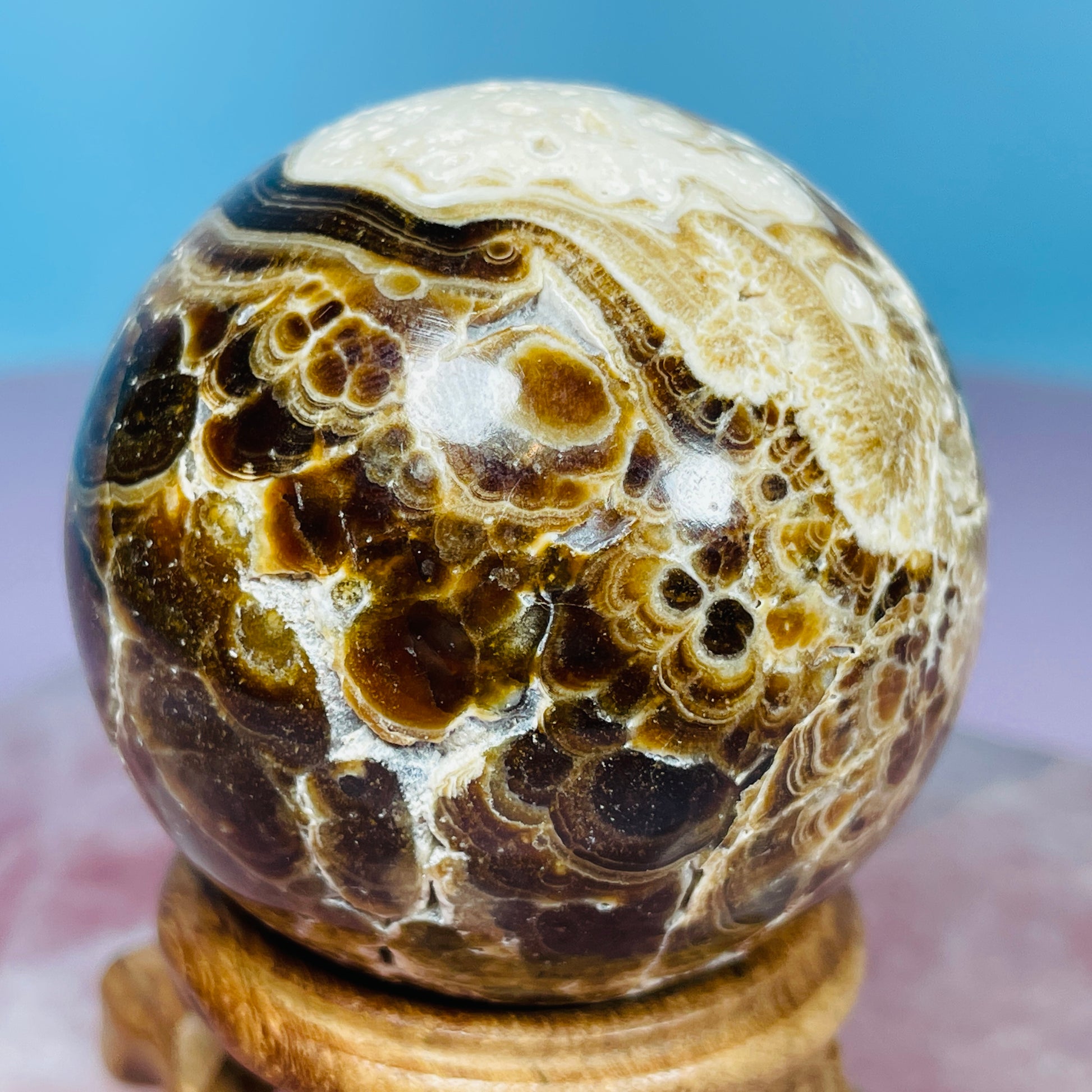 A medium sphere of semi-polished Chocolate Calcite. Sourced from Pakistan. Approx. 4.8cm diameter. Sphere stand sold separately.