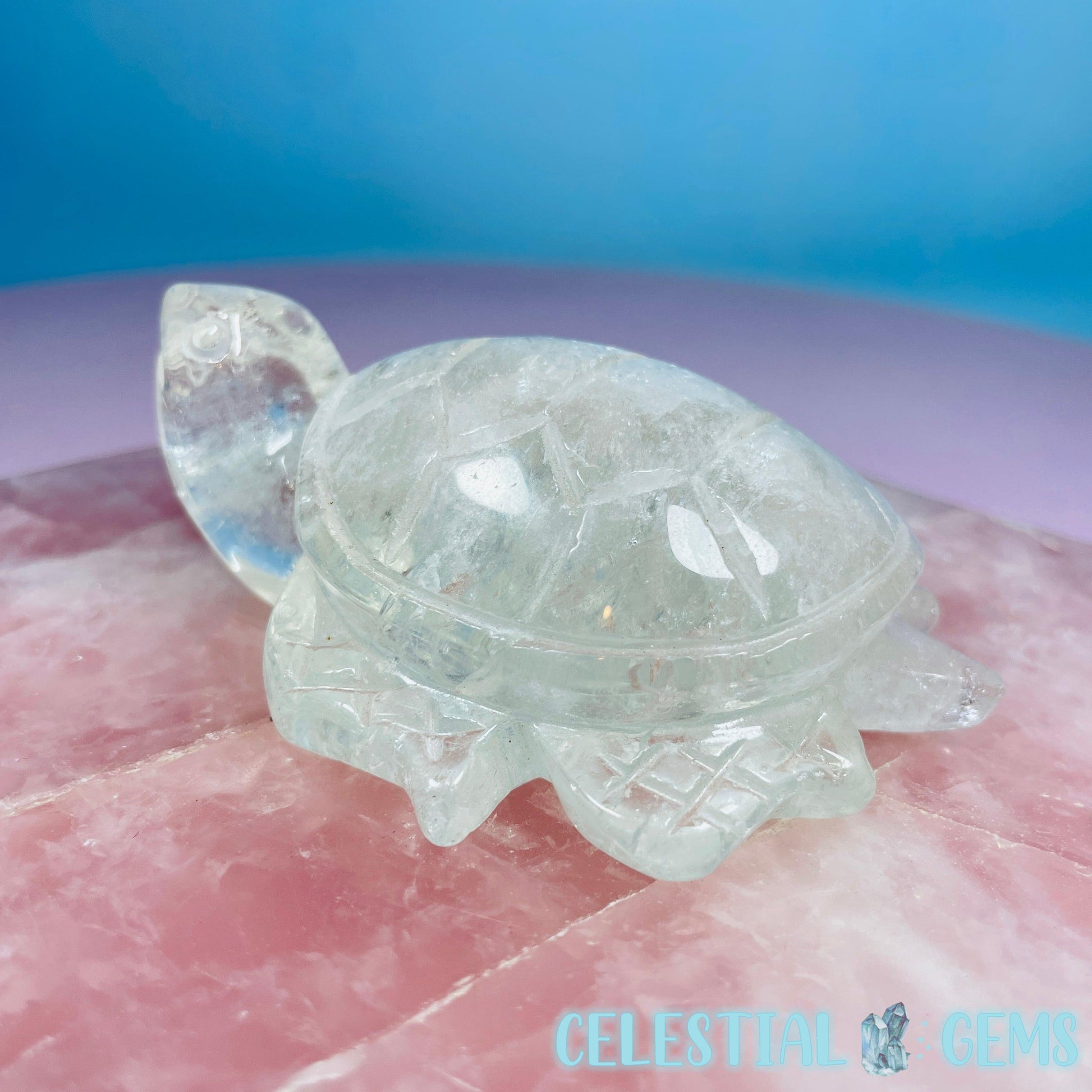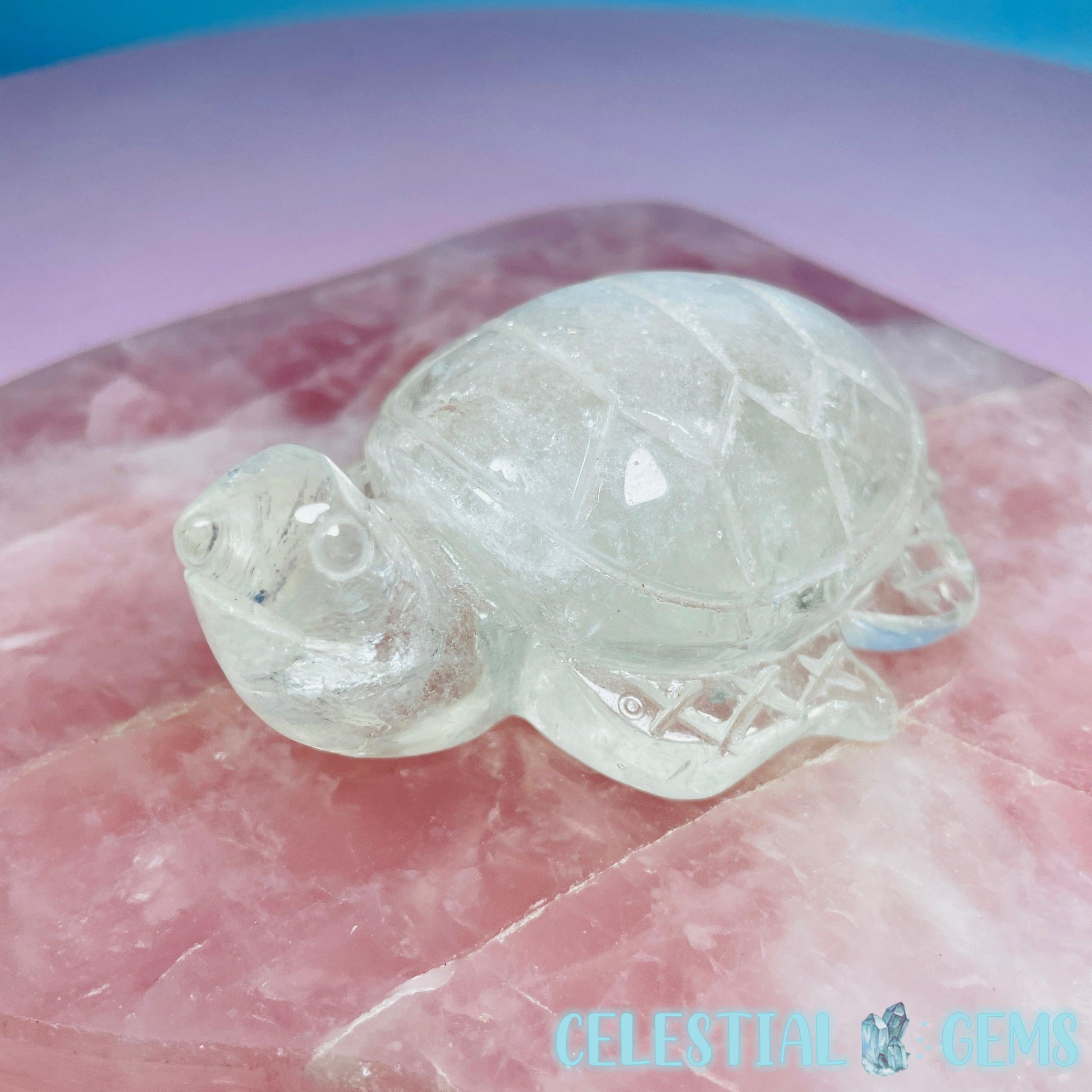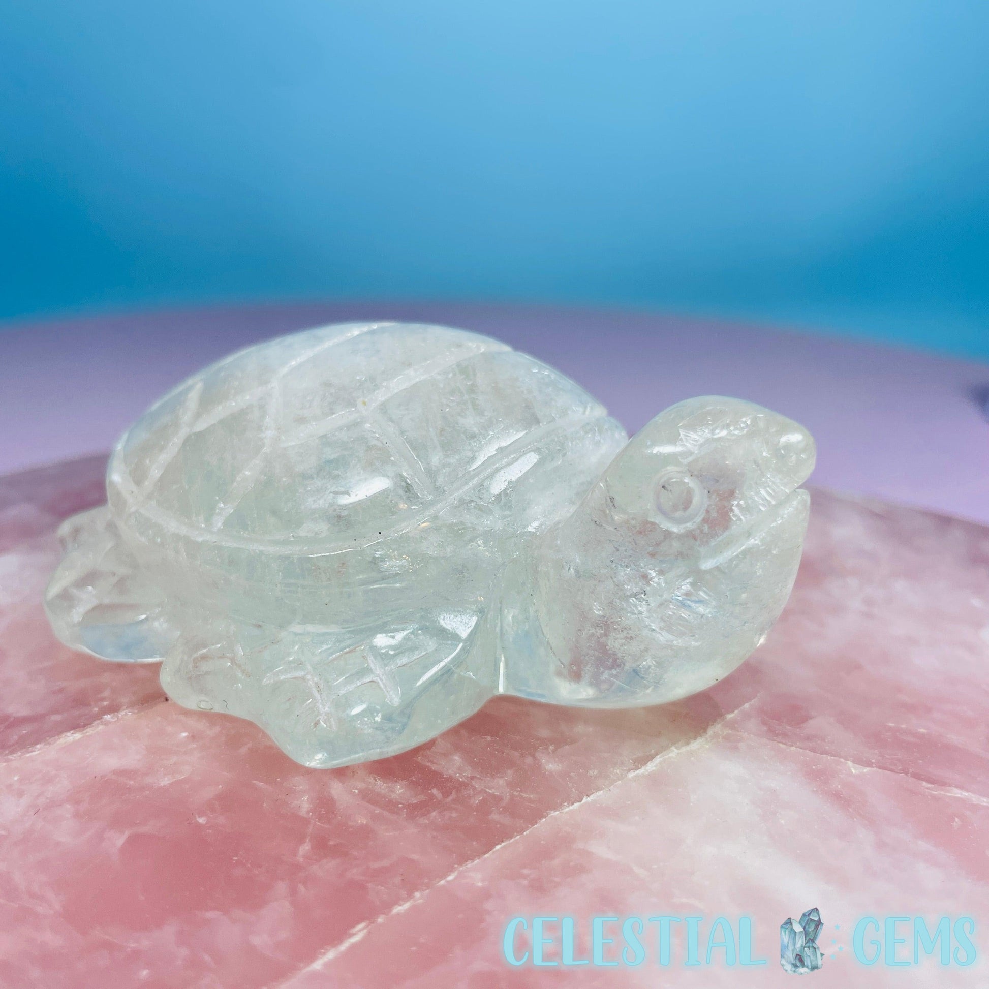 A sea turtle carved from Citrine with rainbow flashes. Approx. 8.4cm x 6cm x 3cm.