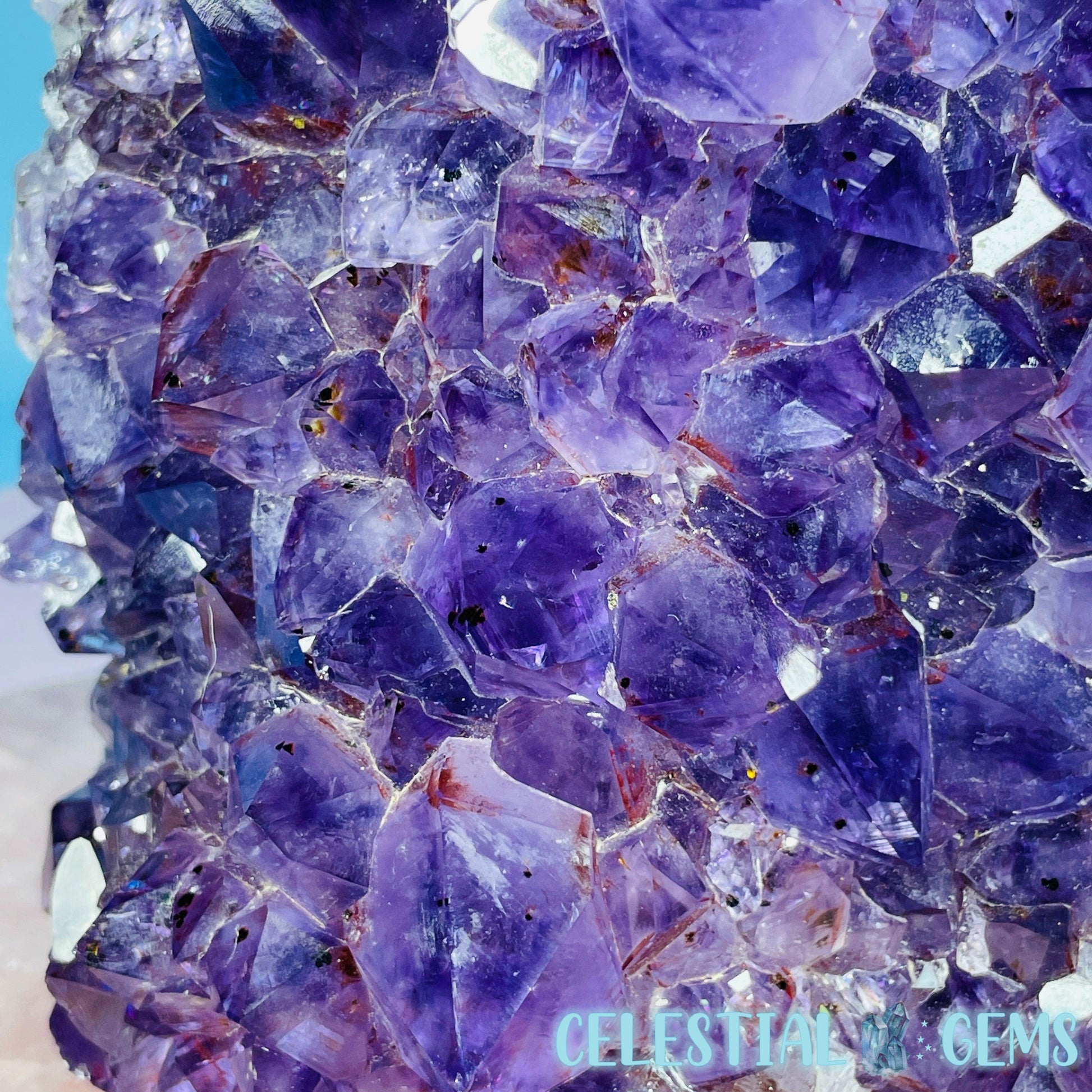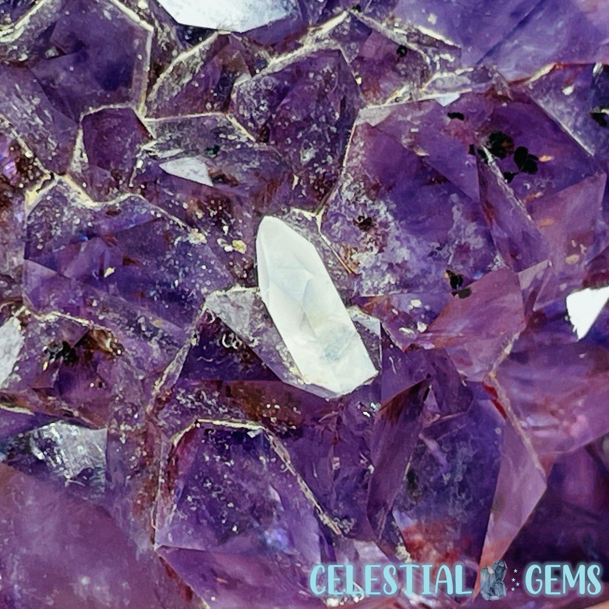 A stunning dark Amethyst cluster with a baby Quartz point inclusion, Cacoxenite golden shine, Goethite black spots and Celadonite and Basalt layer on the rear. The edge is natural and unpolished with a flat cut bottom so it can stand on its own. Sourced from Brazil.