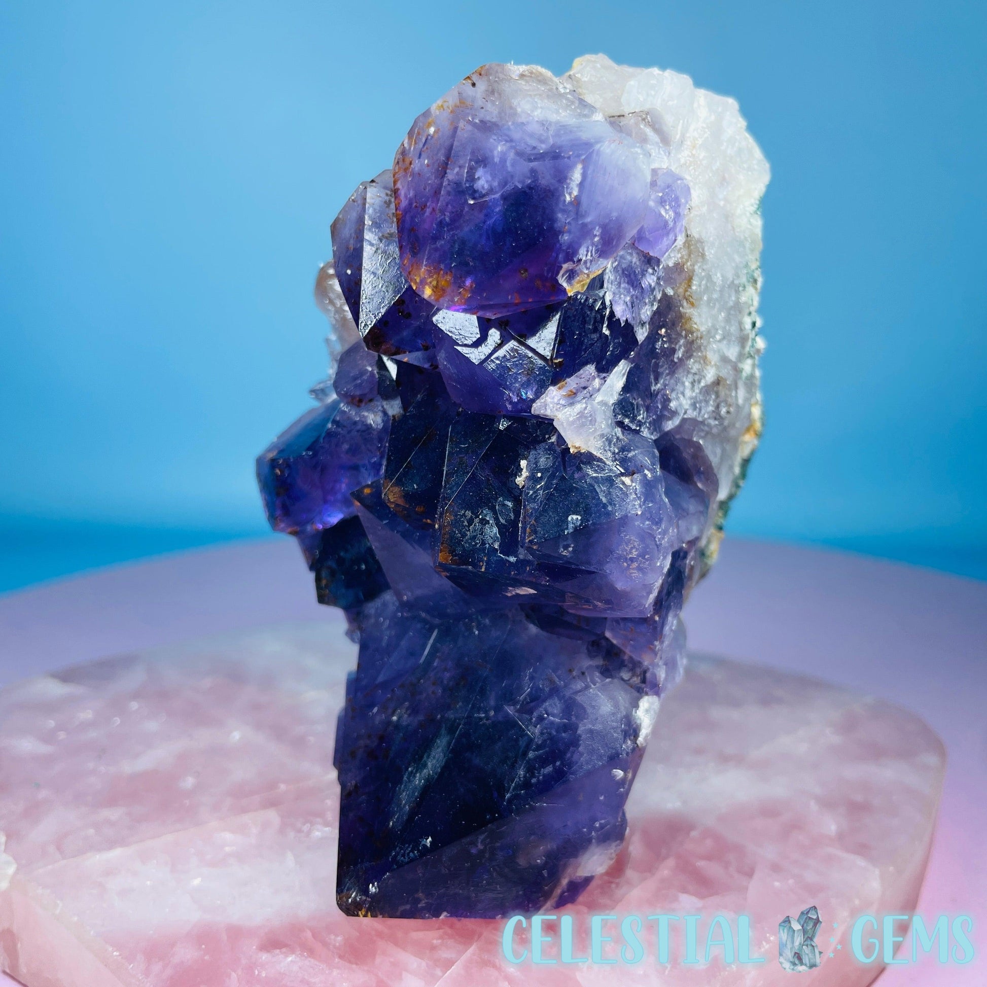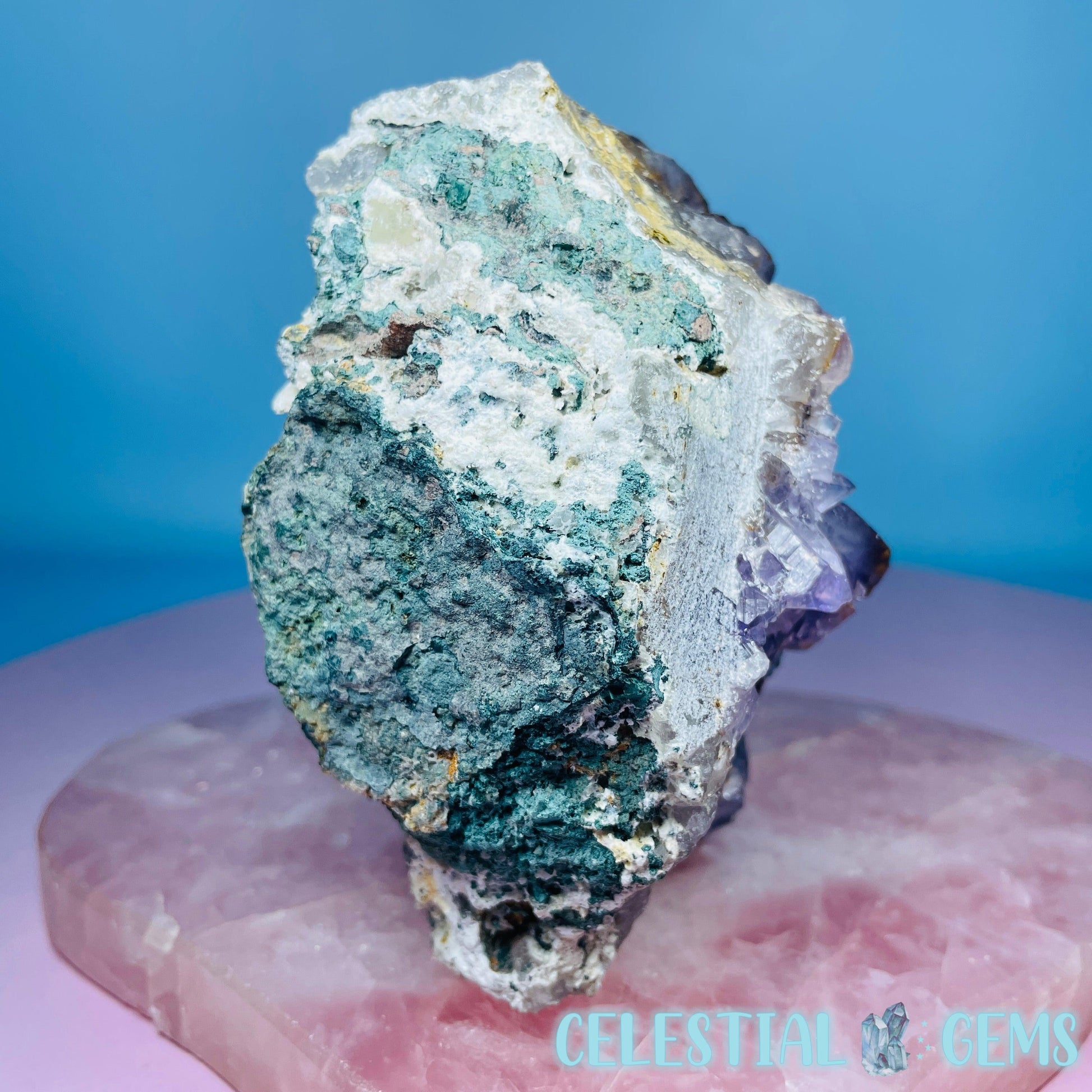 A stunning dark Amethyst cluster with large points and a Celadonite and Basalt layer on the rear. The edge is natural and unpolished with a flat cut bottom so it can stand on its own. Sourced from Brazil.
