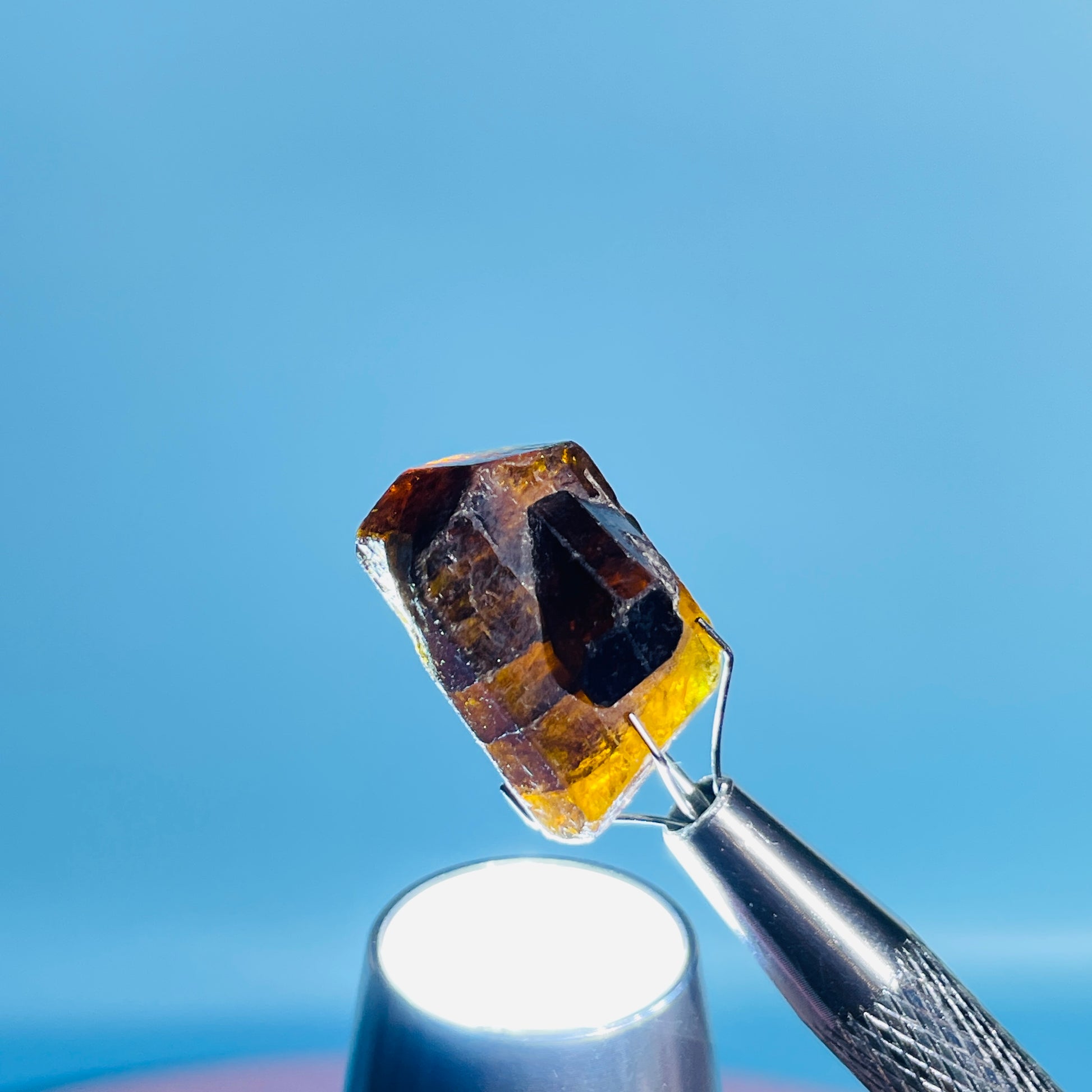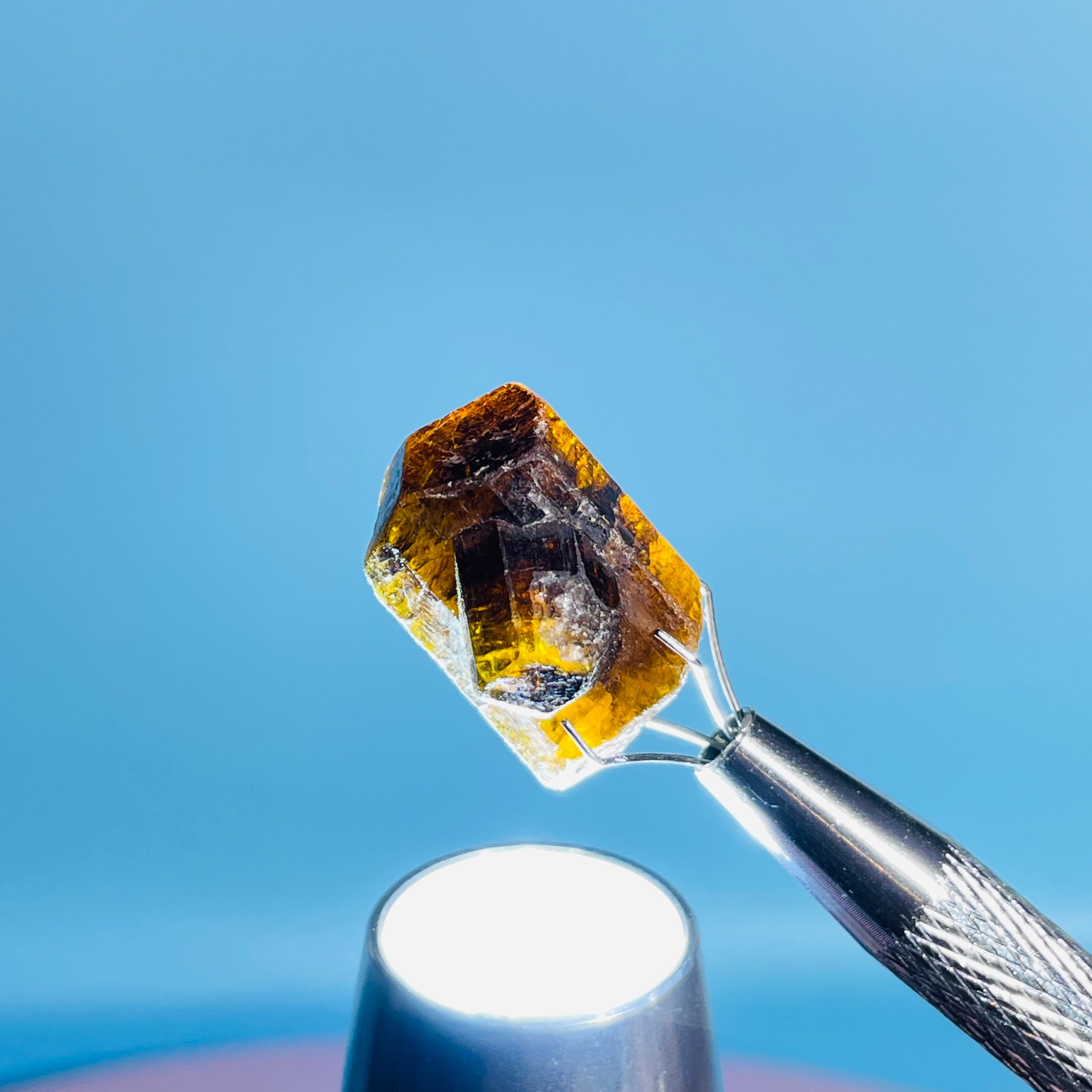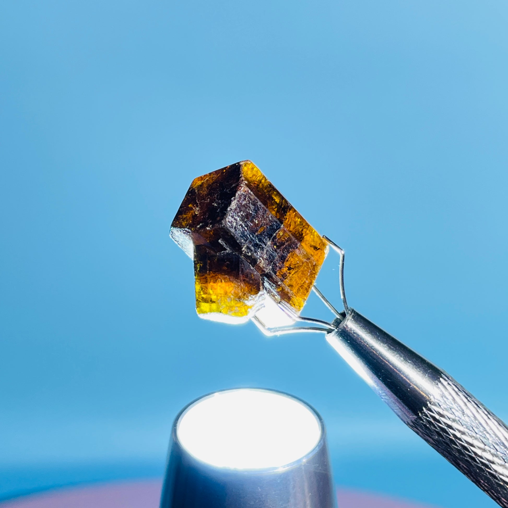 A gorgeous dark brown/orange/yellow rare Dravite Tourmaline crystal with lovely inner colour as shown with our gem torch.