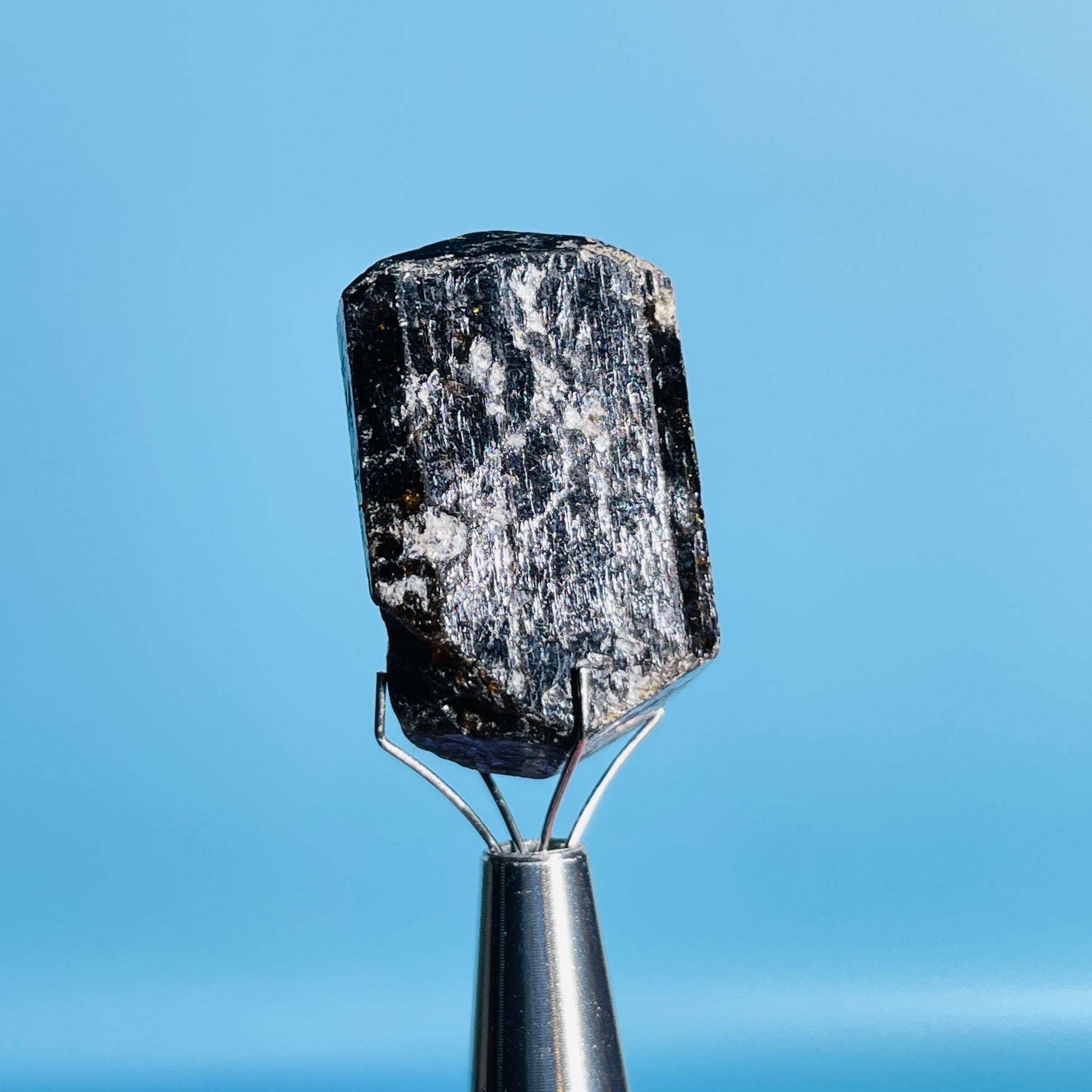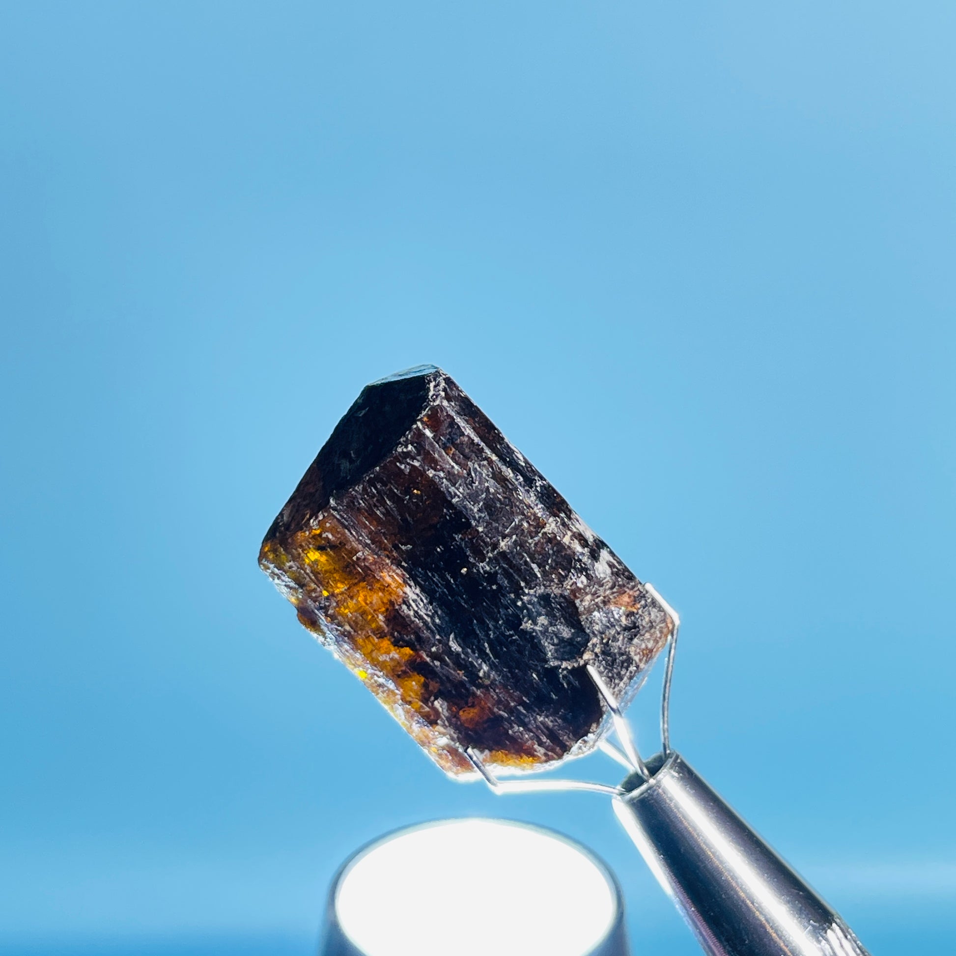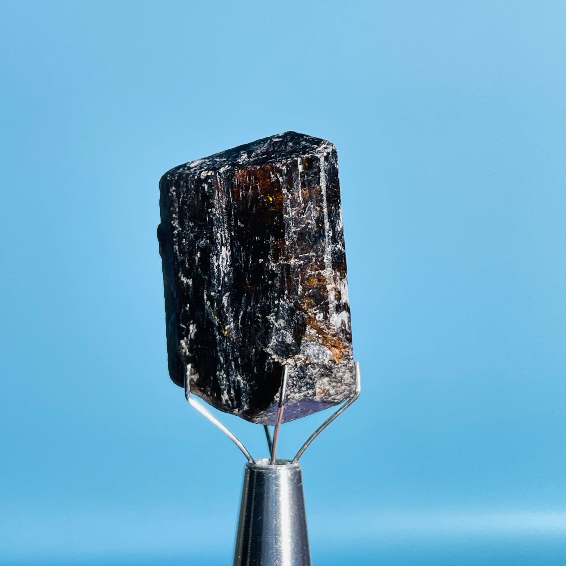 A gorgeous dark brown/orange/yellow rare Dravite Tourmaline crystal with lovely inner colour as shown with our gem torch.
