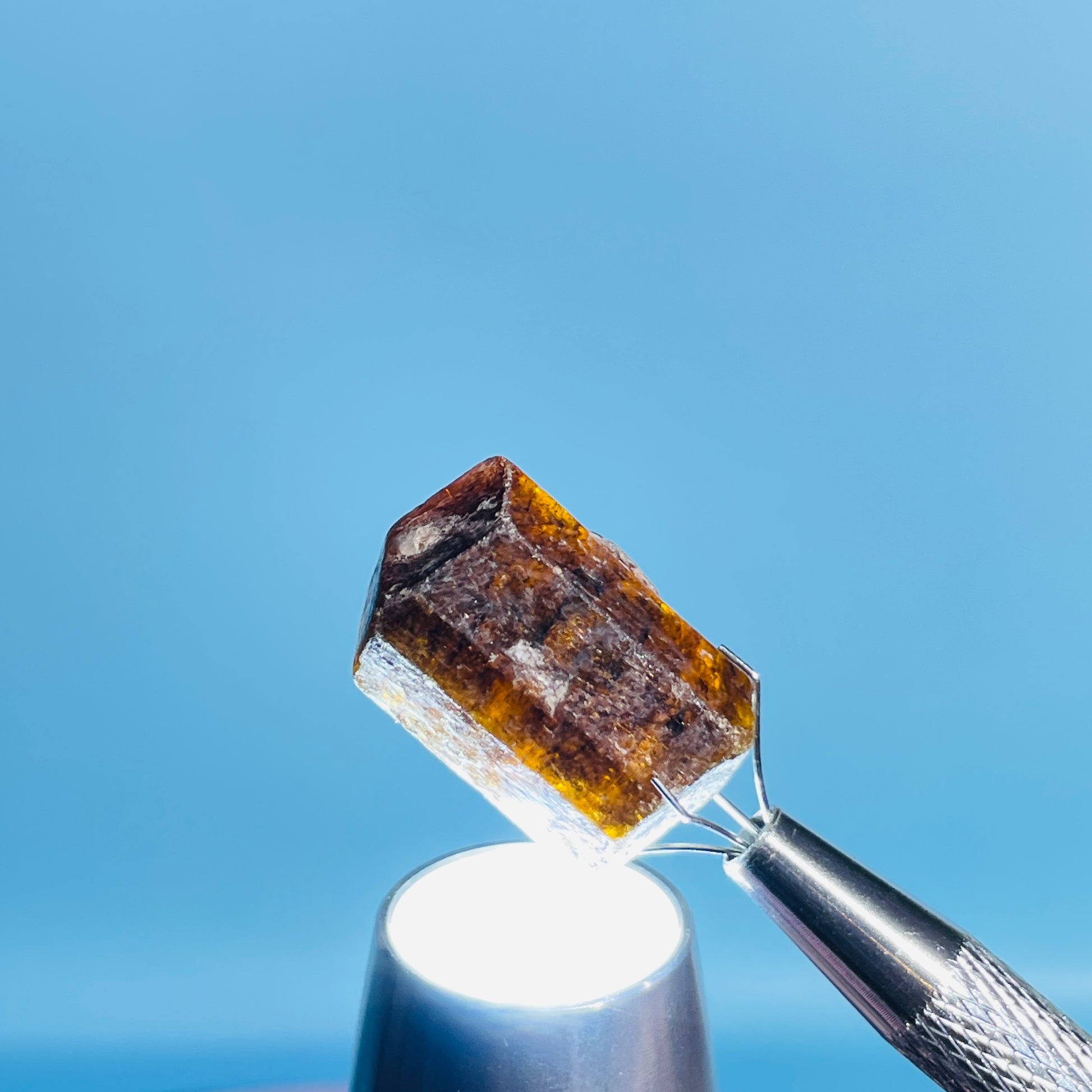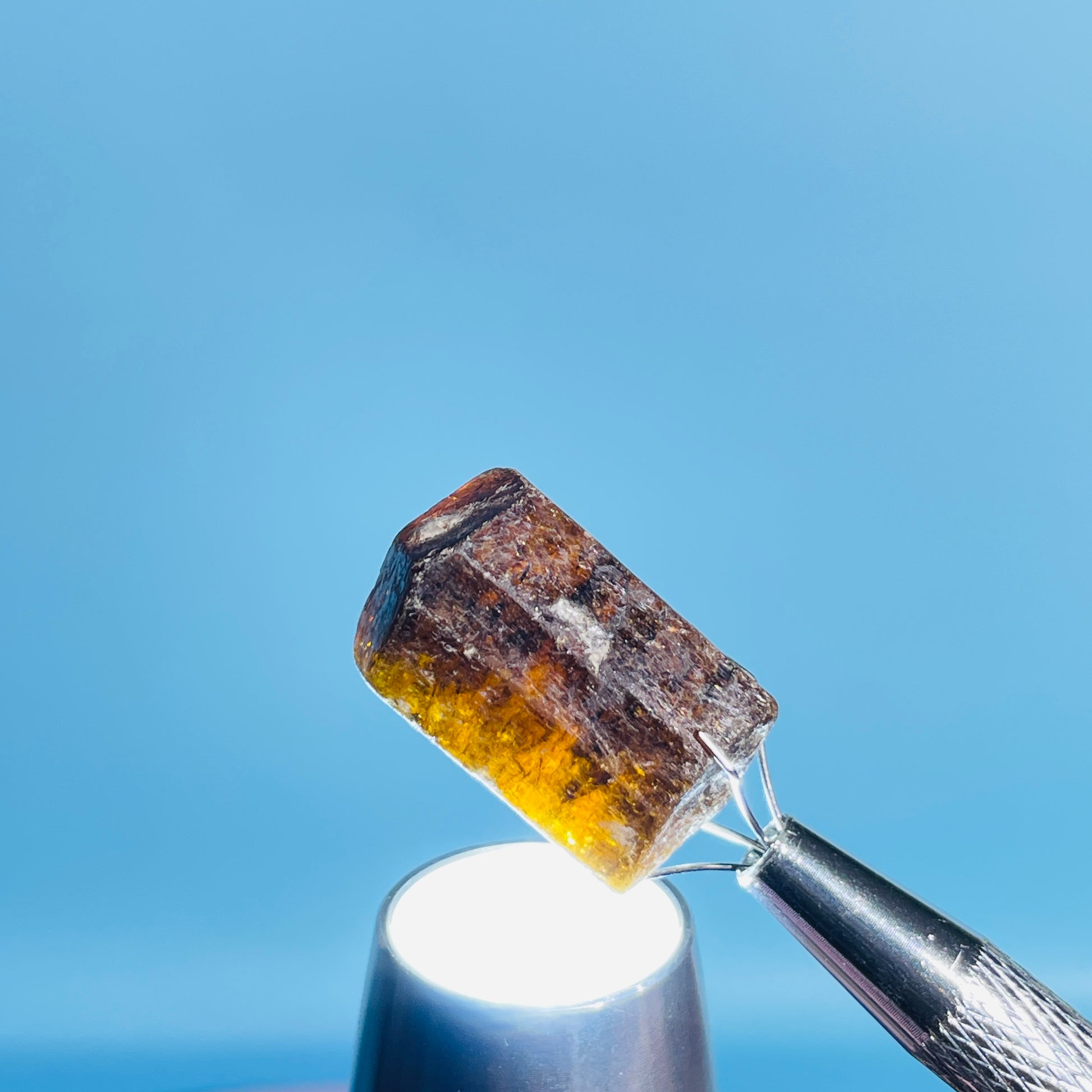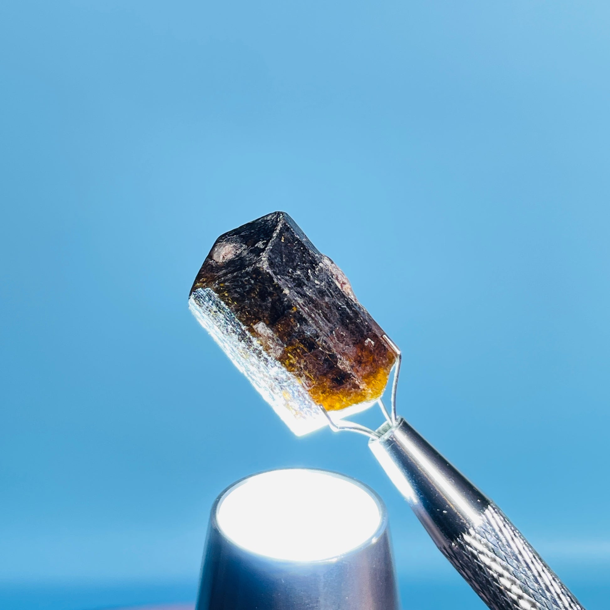 A gorgeous dark brown/orange/yellow rare Dravite Tourmaline crystal with lovely inner colour as shown with our gem torch.