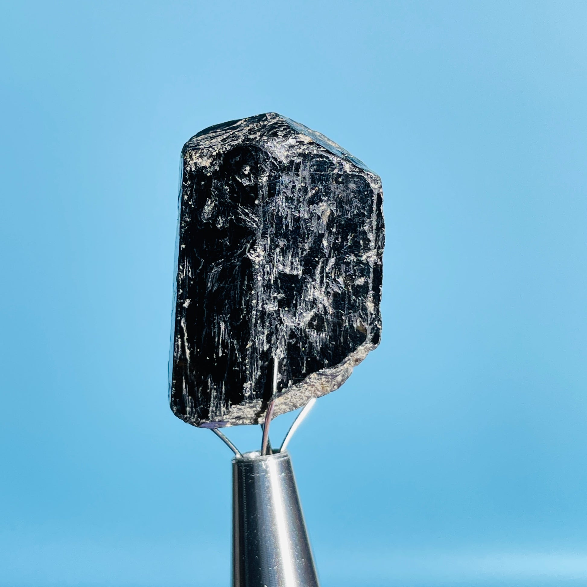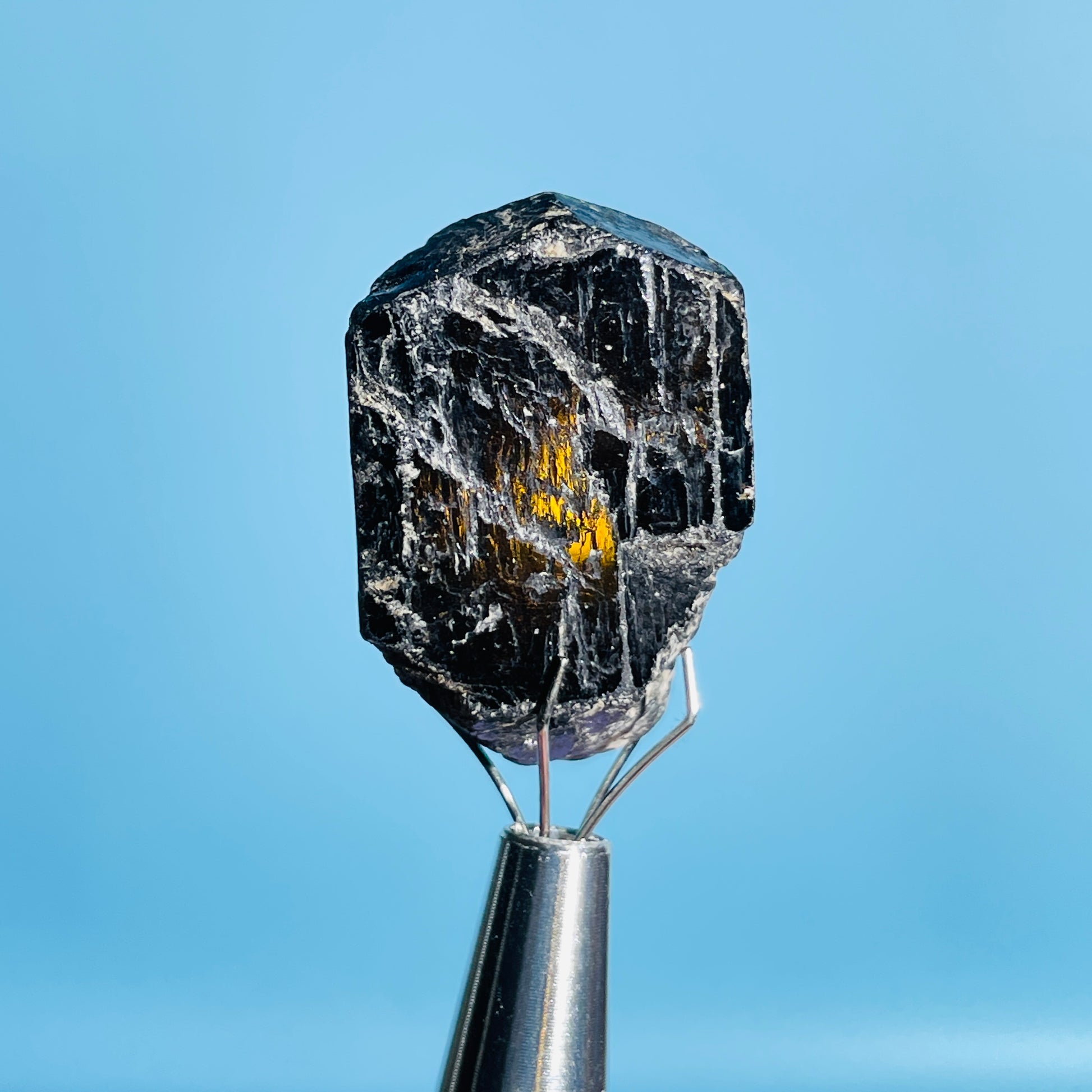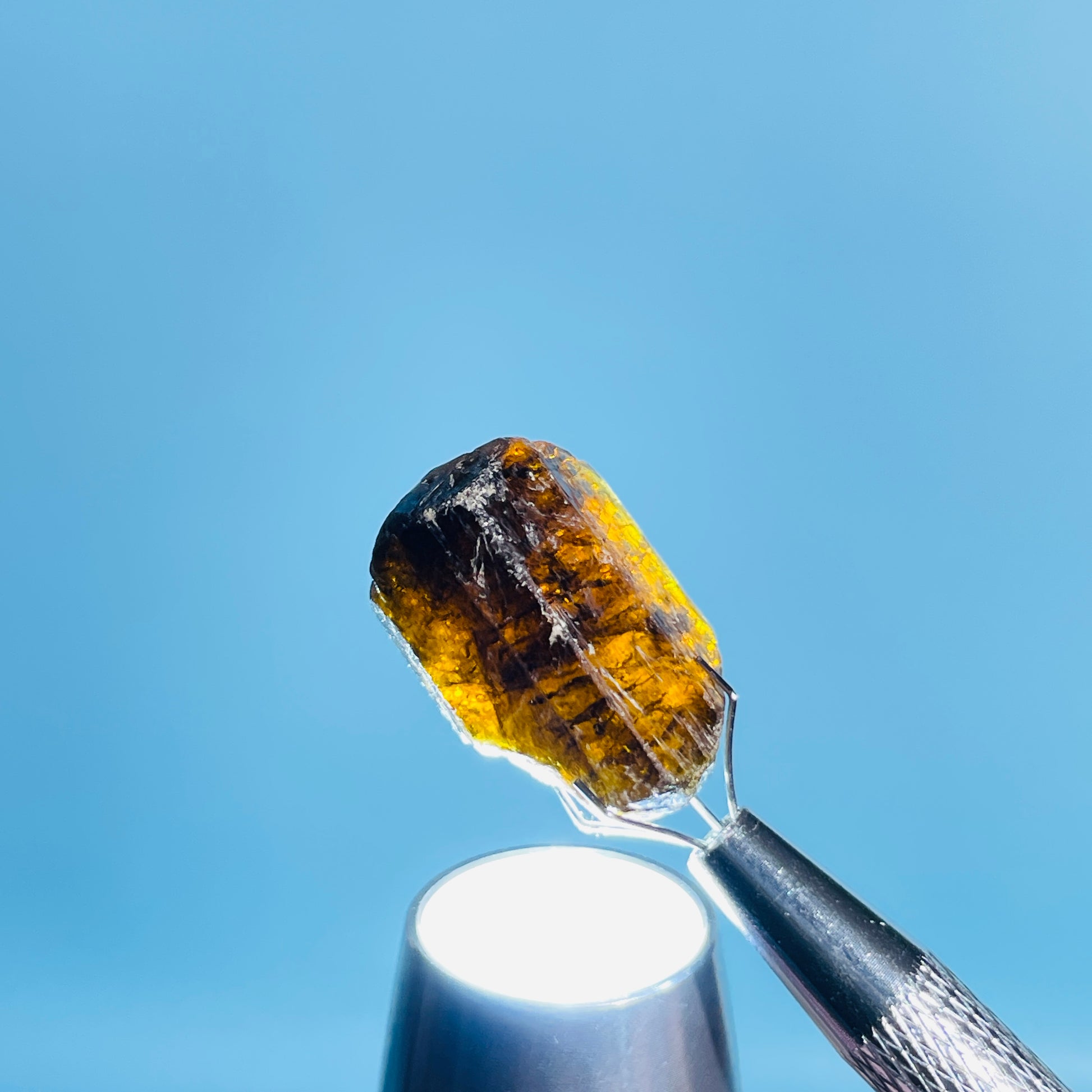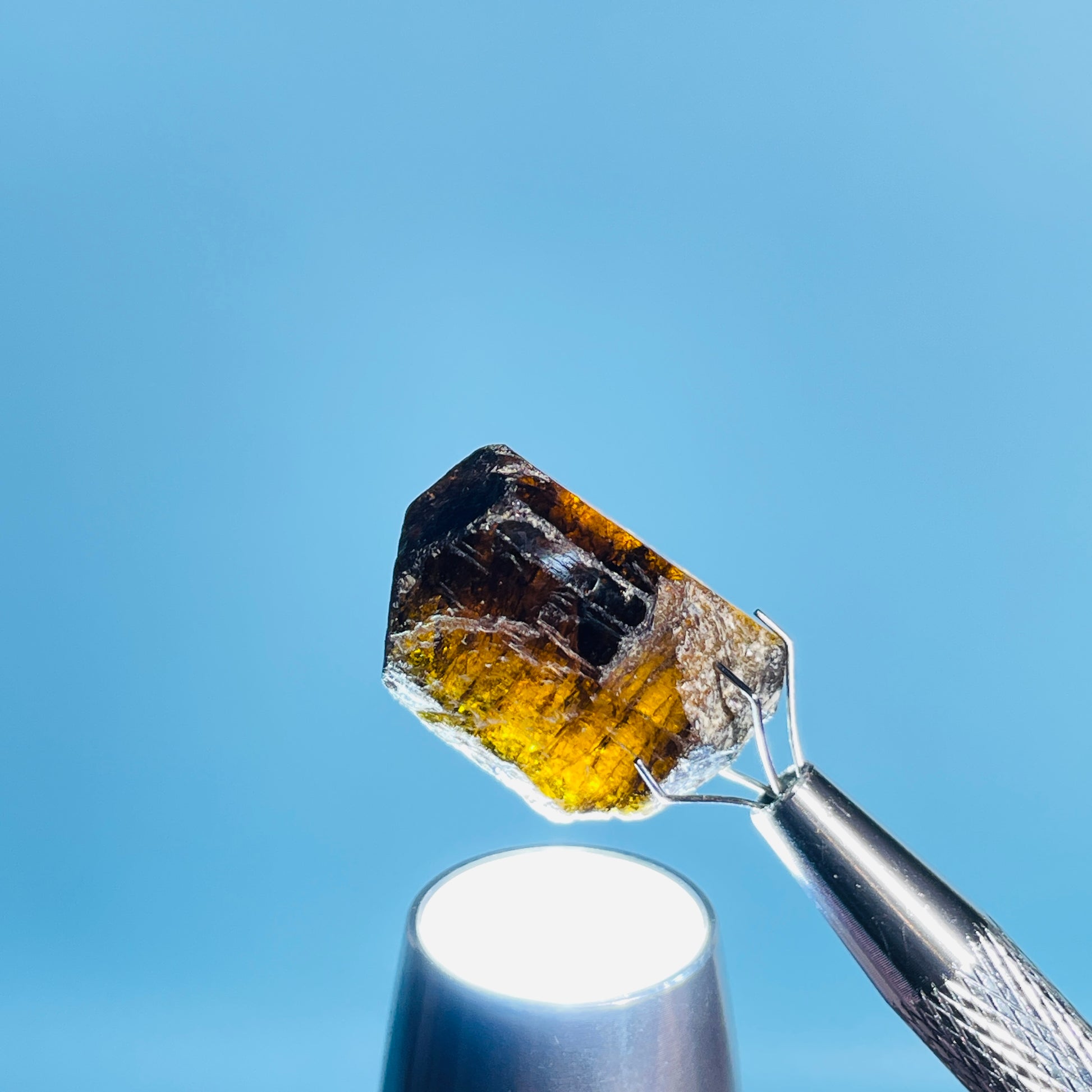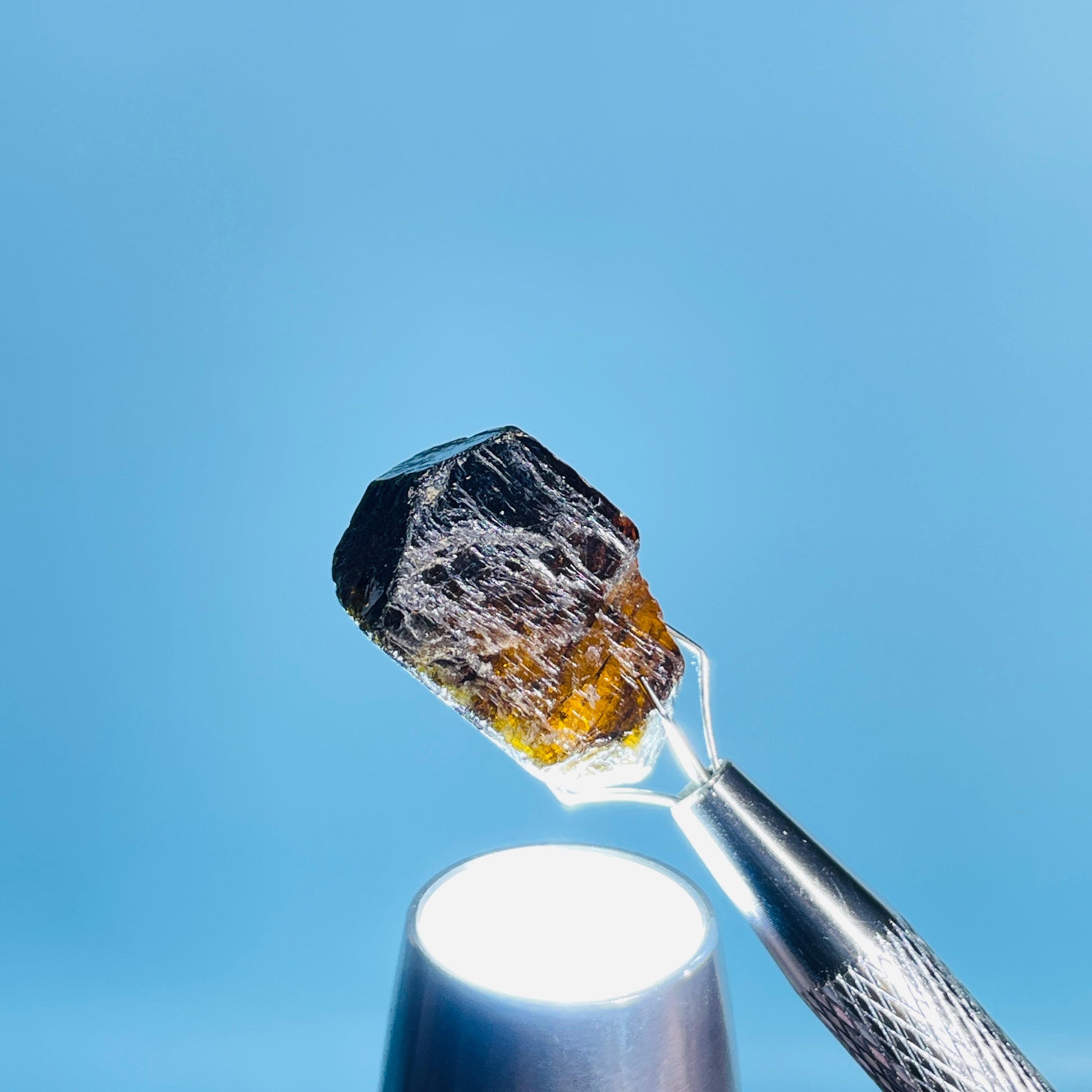 A gorgeous dark brown/orange/yellow rare Dravite Tourmaline crystal with lovely inner colour as shown with our gem torch.