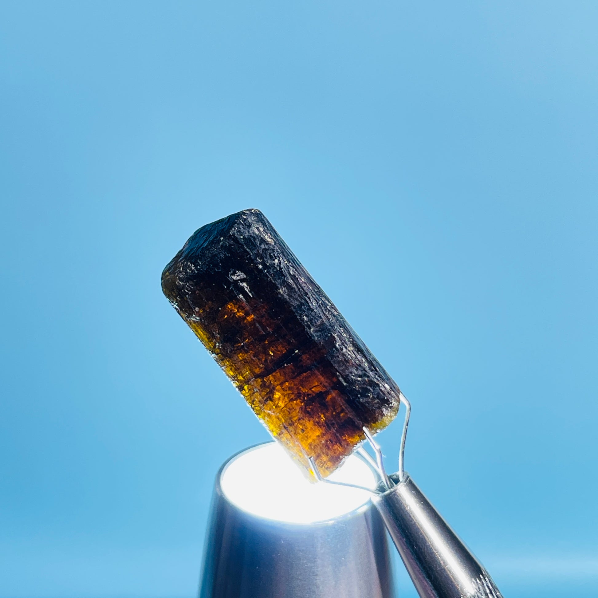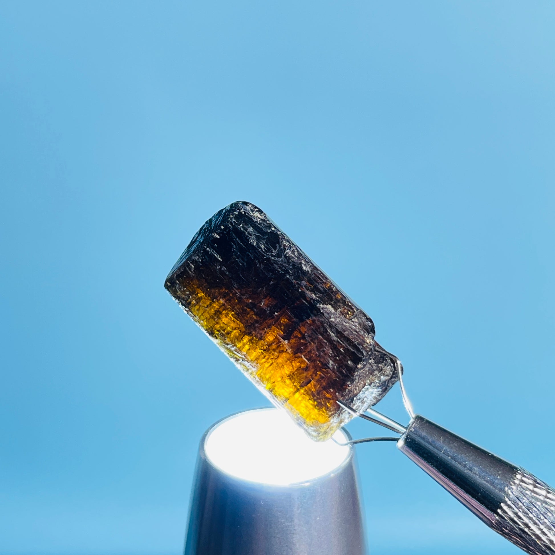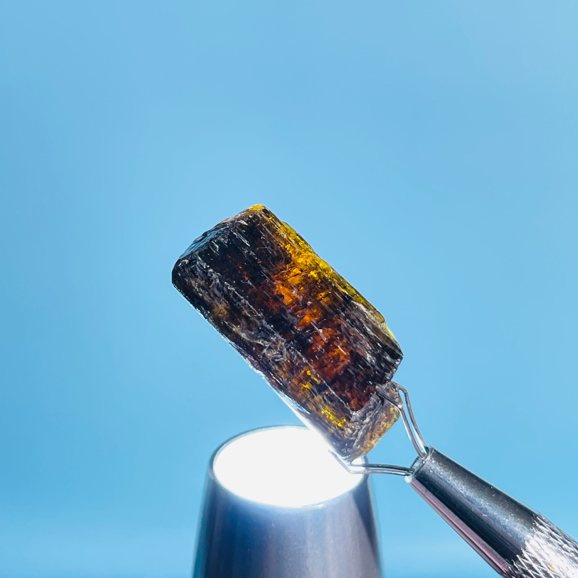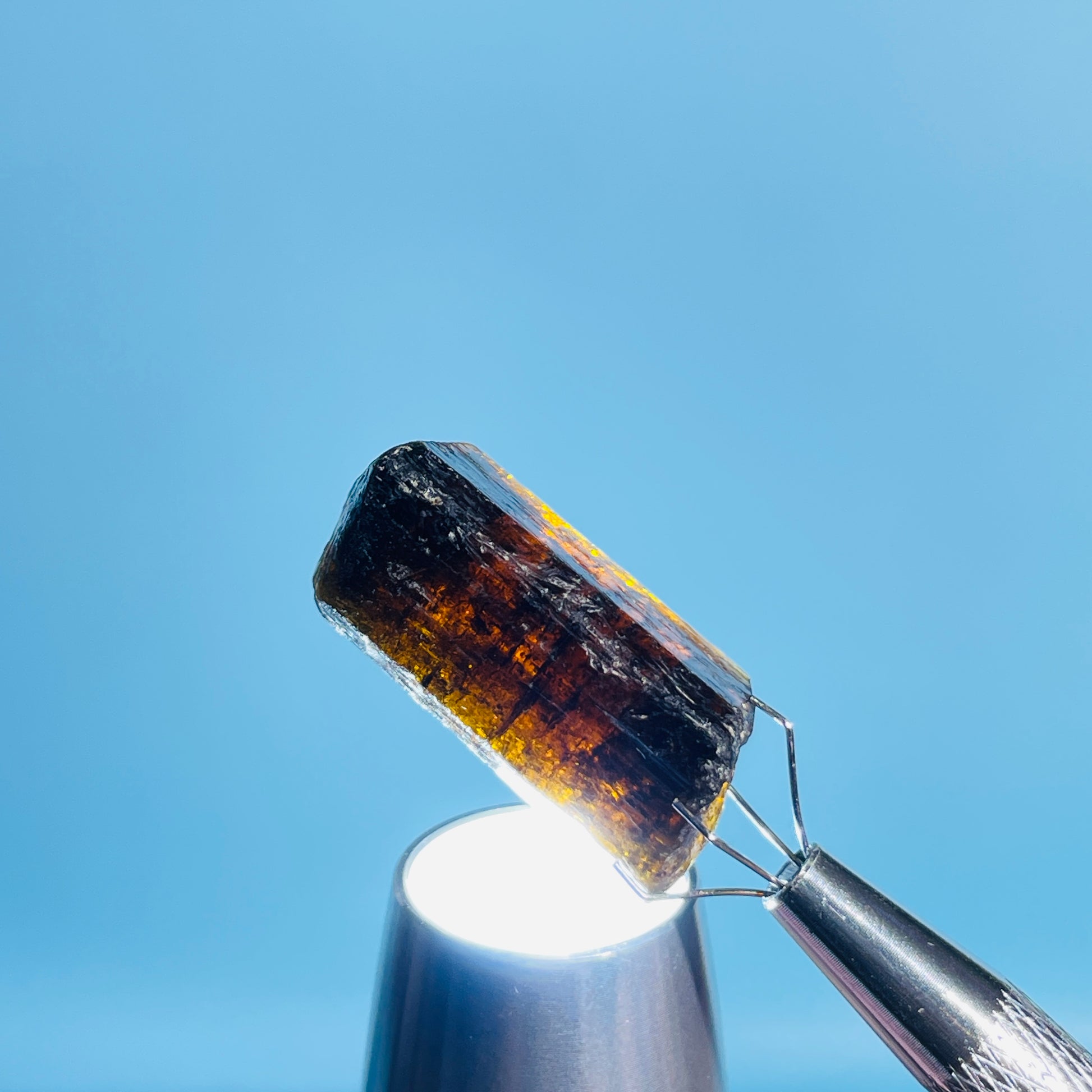A gorgeous dark brown/orange/yellow rare Dravite Tourmaline crystal with lovely inner colour as shown with our gem torch.