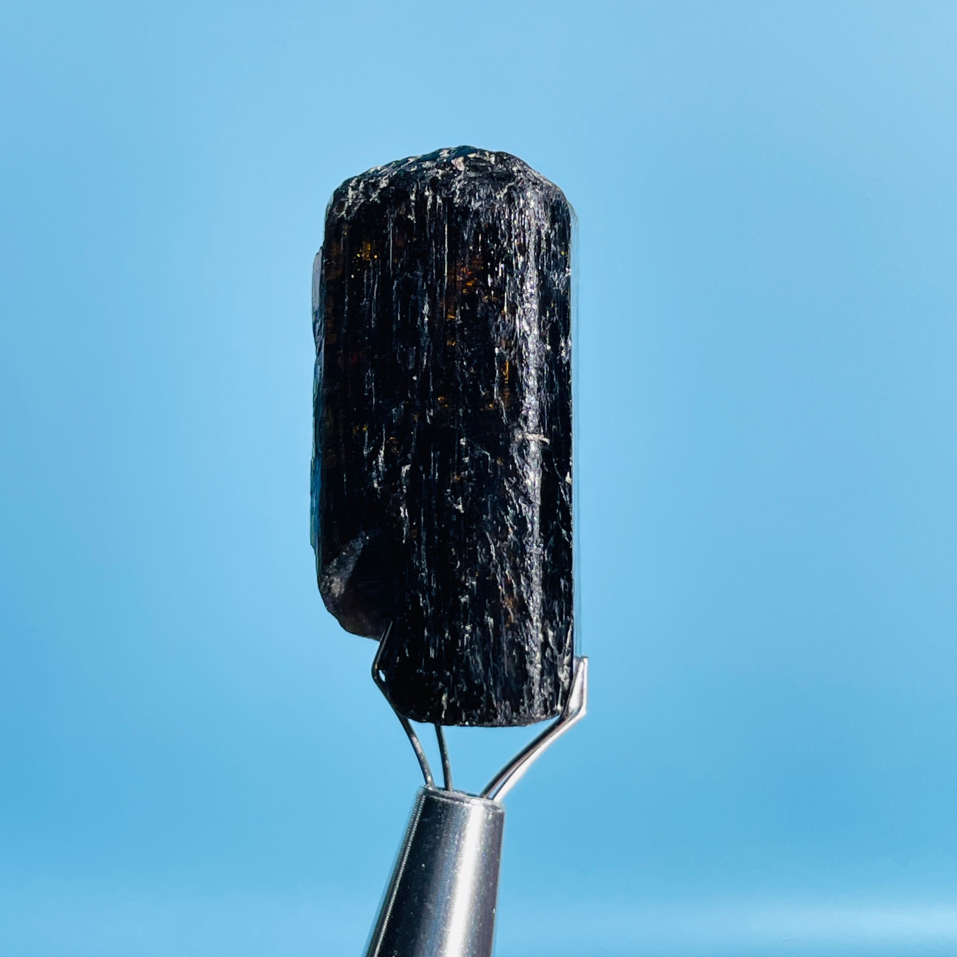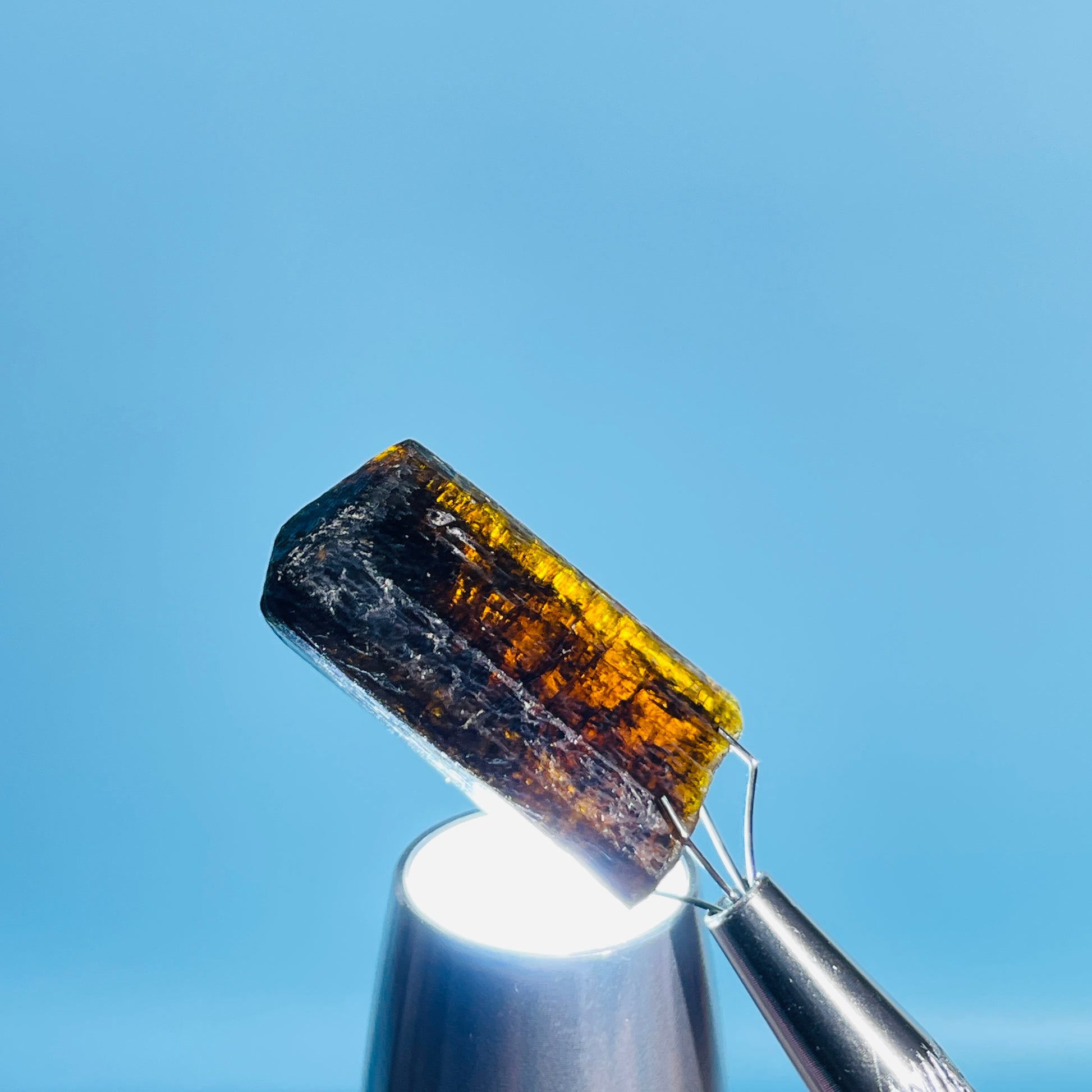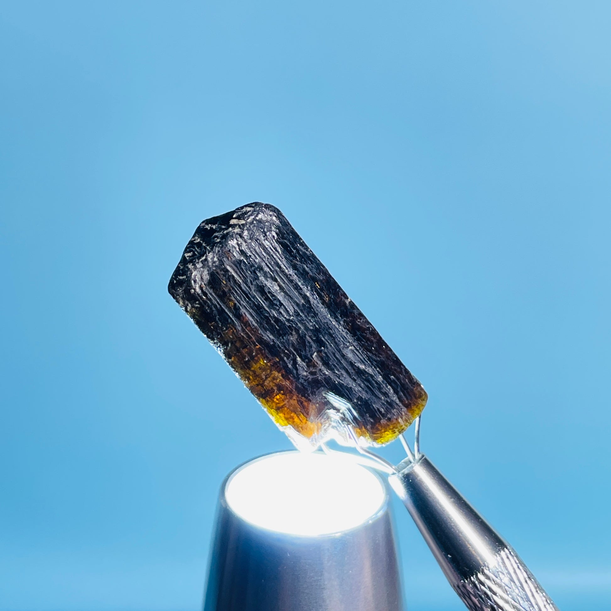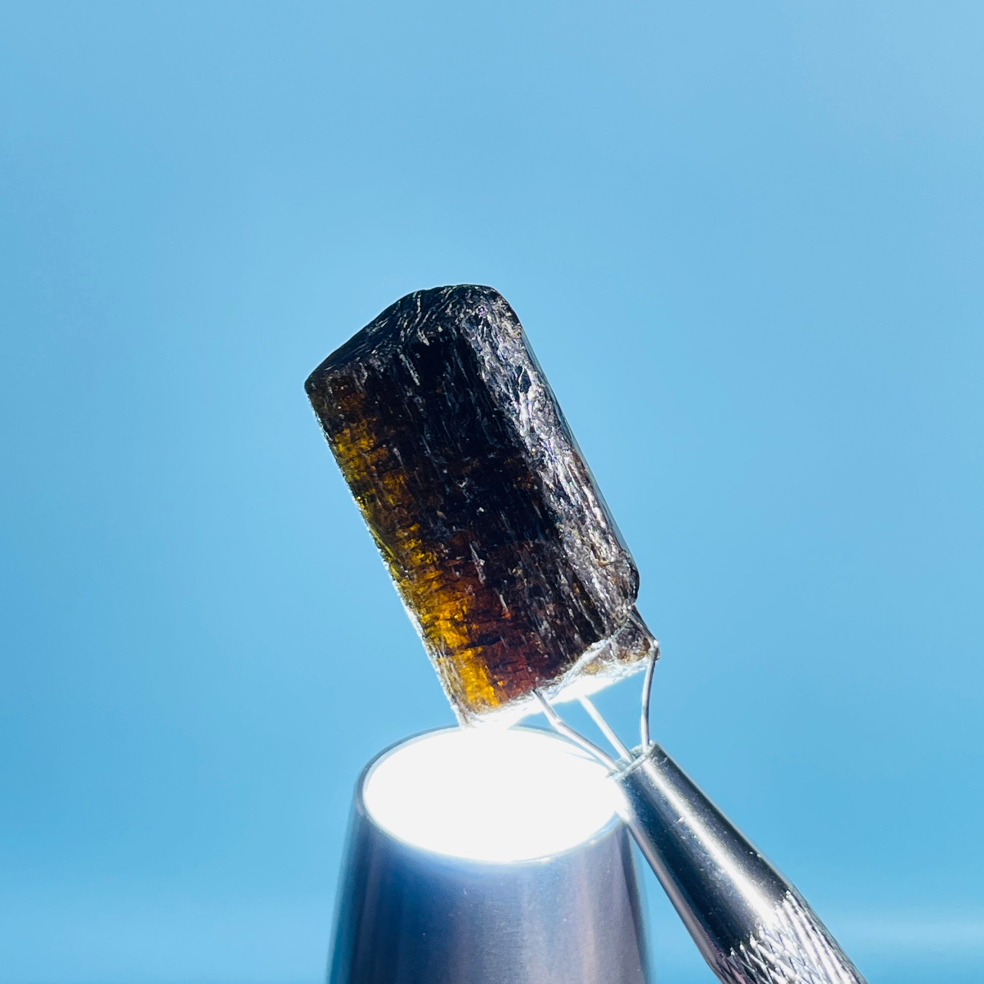 A gorgeous dark brown/orange/yellow rare Dravite Tourmaline crystal with lovely inner colour as shown with our gem torch.