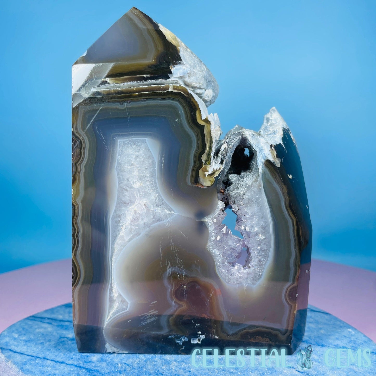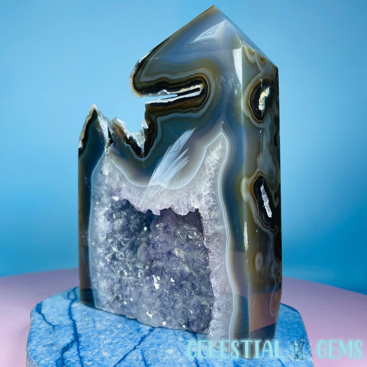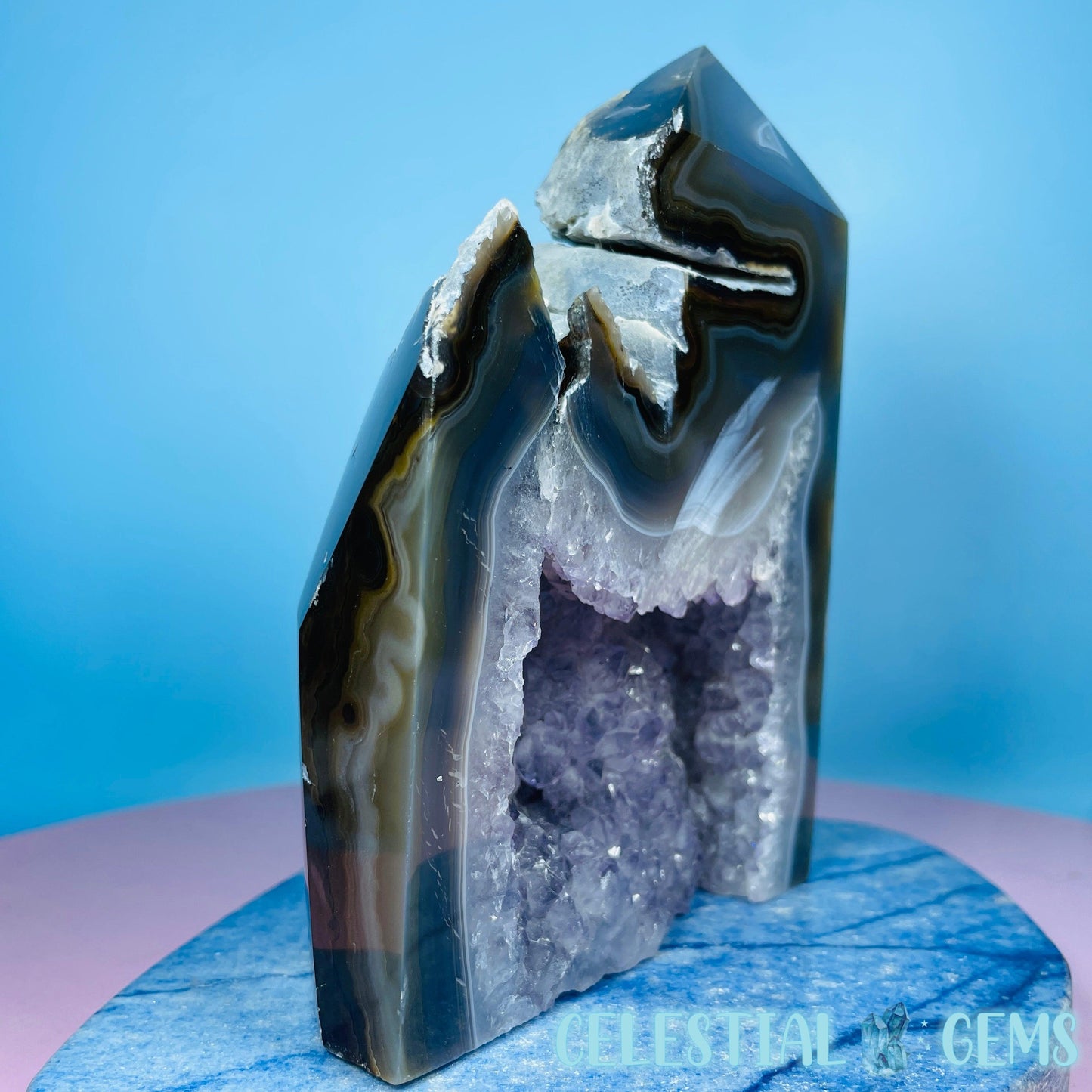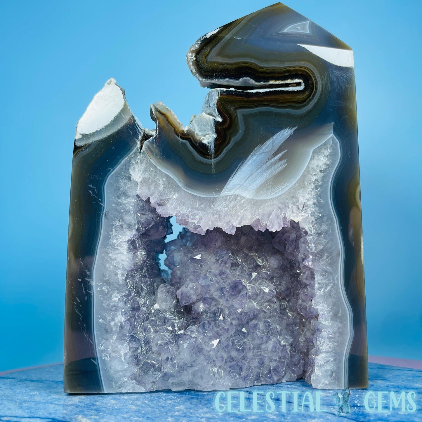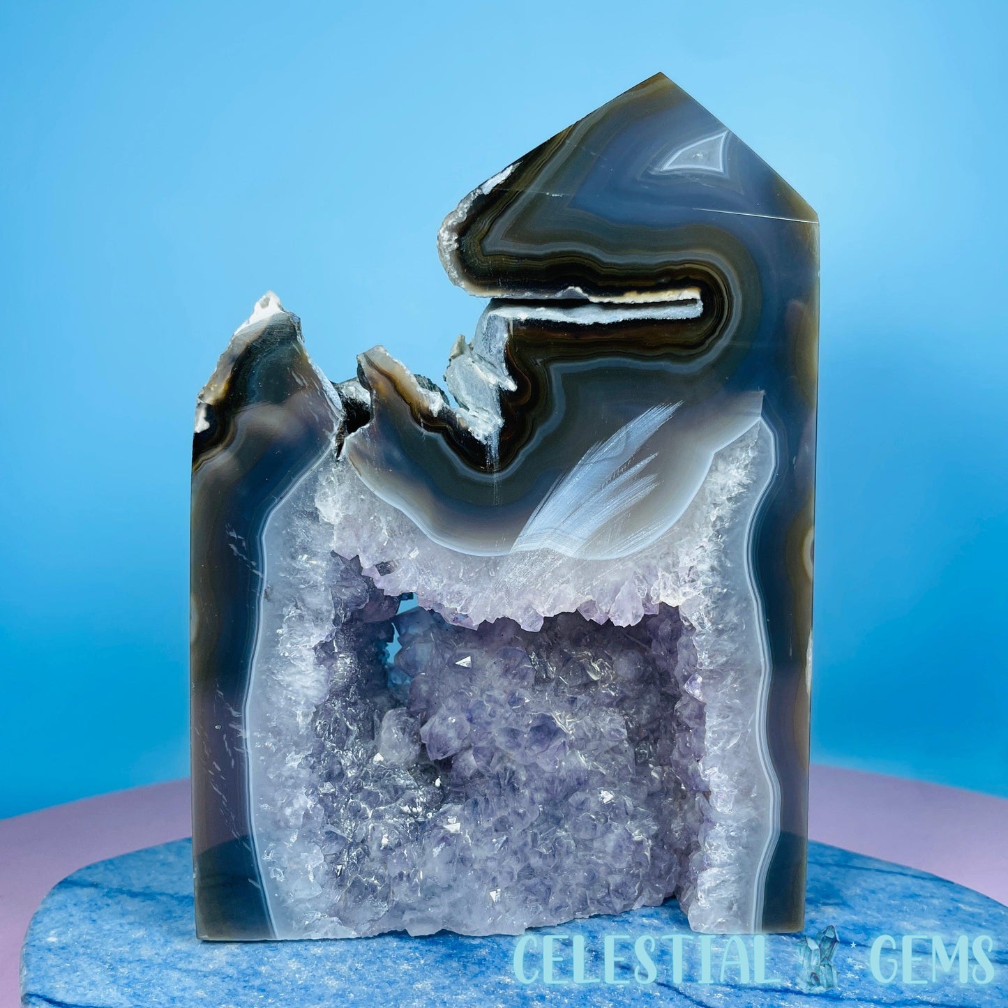 A semi-polished large tower/freeform of druzy Amethyst with gorgeous purple crystals and natural multi-coloured Agate with large open pockets.