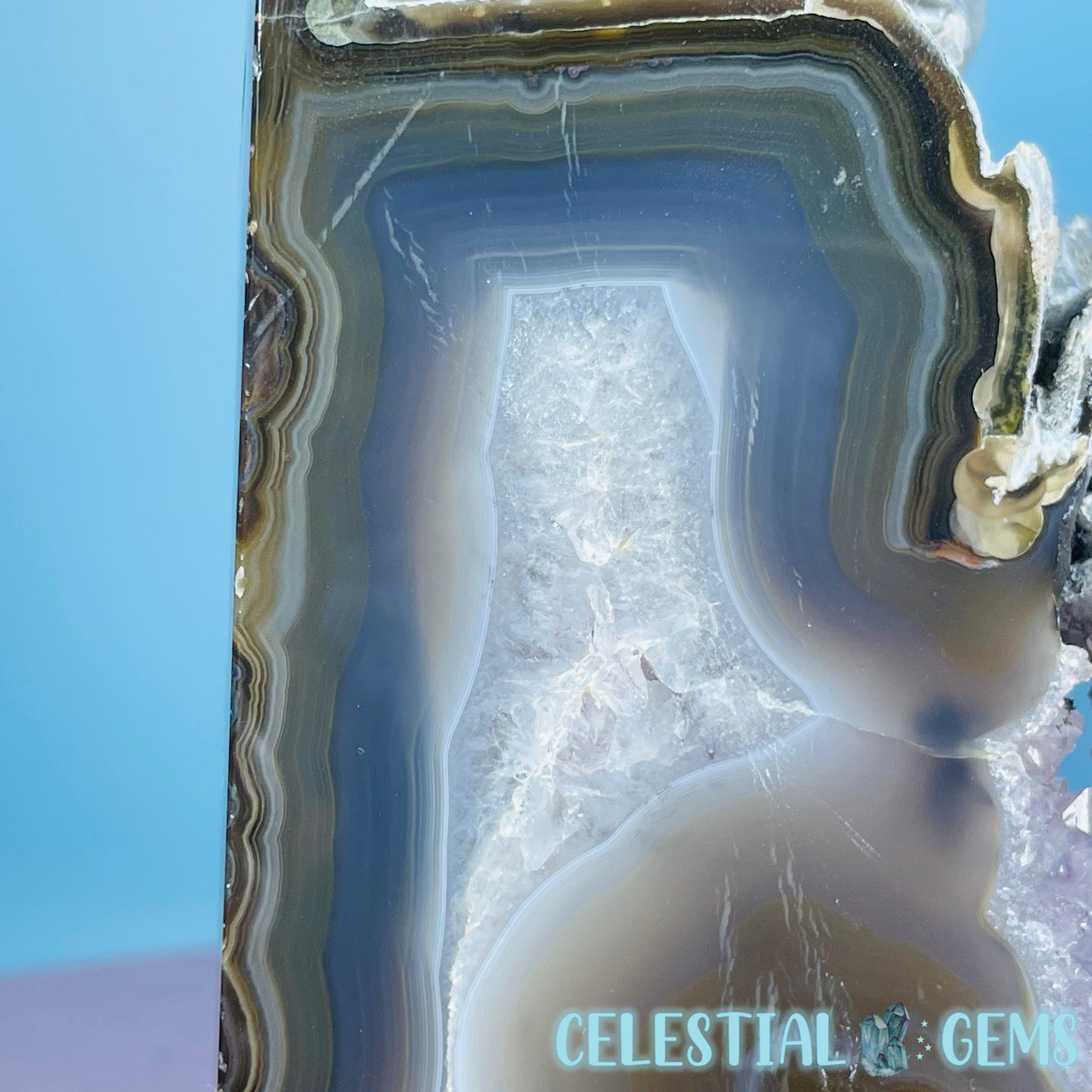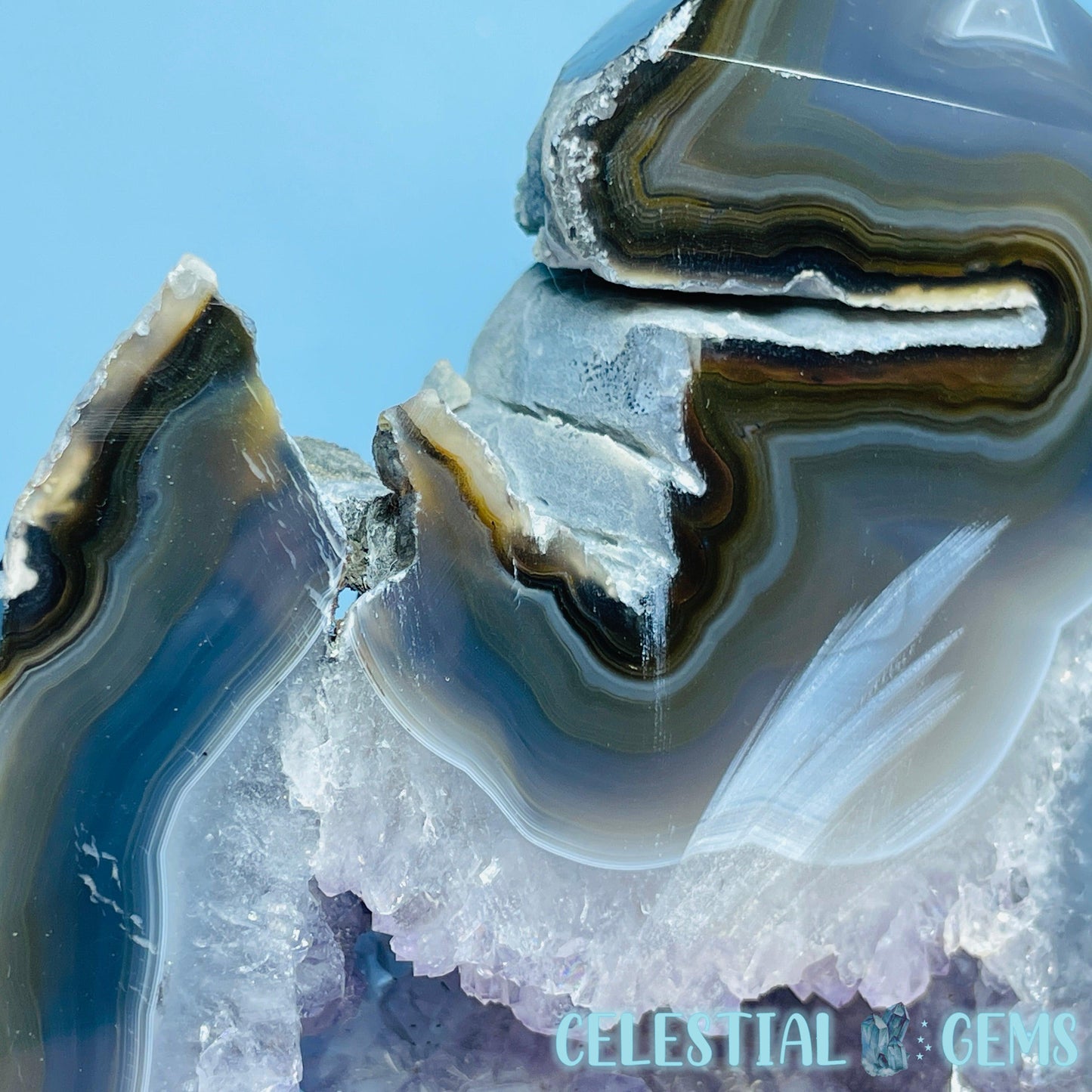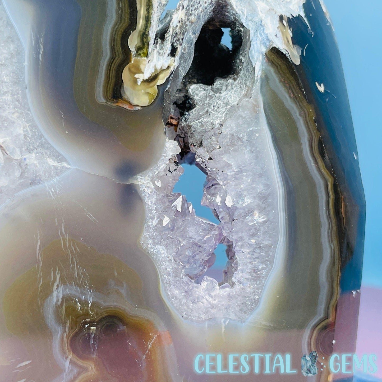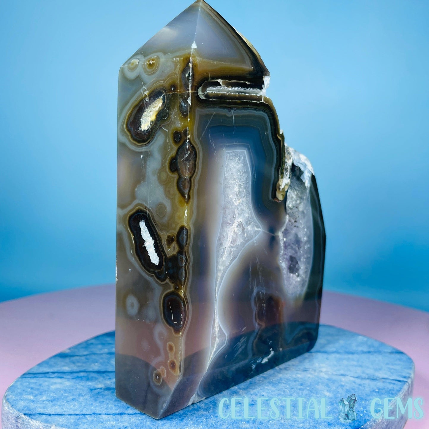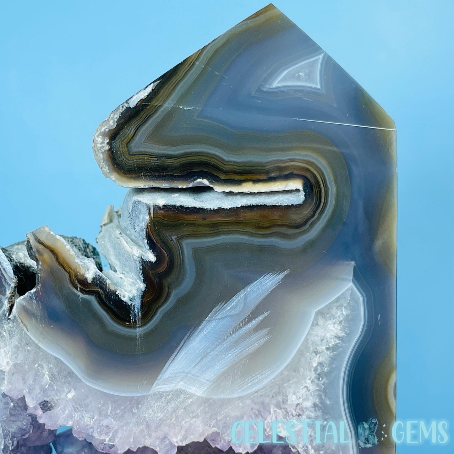 A semi-polished large tower/freeform of druzy Amethyst with gorgeous purple crystals and natural multi-coloured Agate with large open pockets.