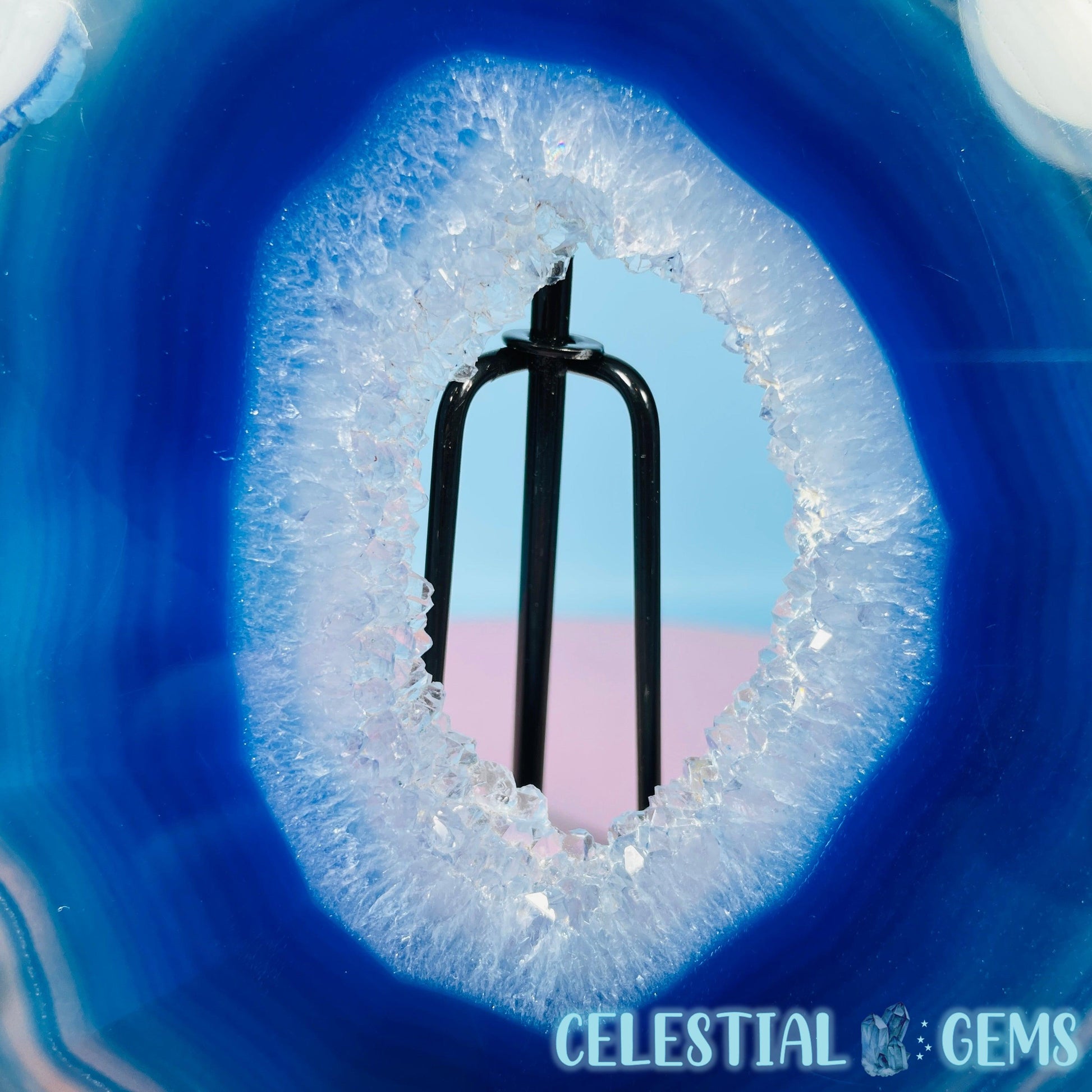 A large slice of an Agate crystal cut thinly with excellent translucency, patterns and colours with an open druzy pocket in the centre.