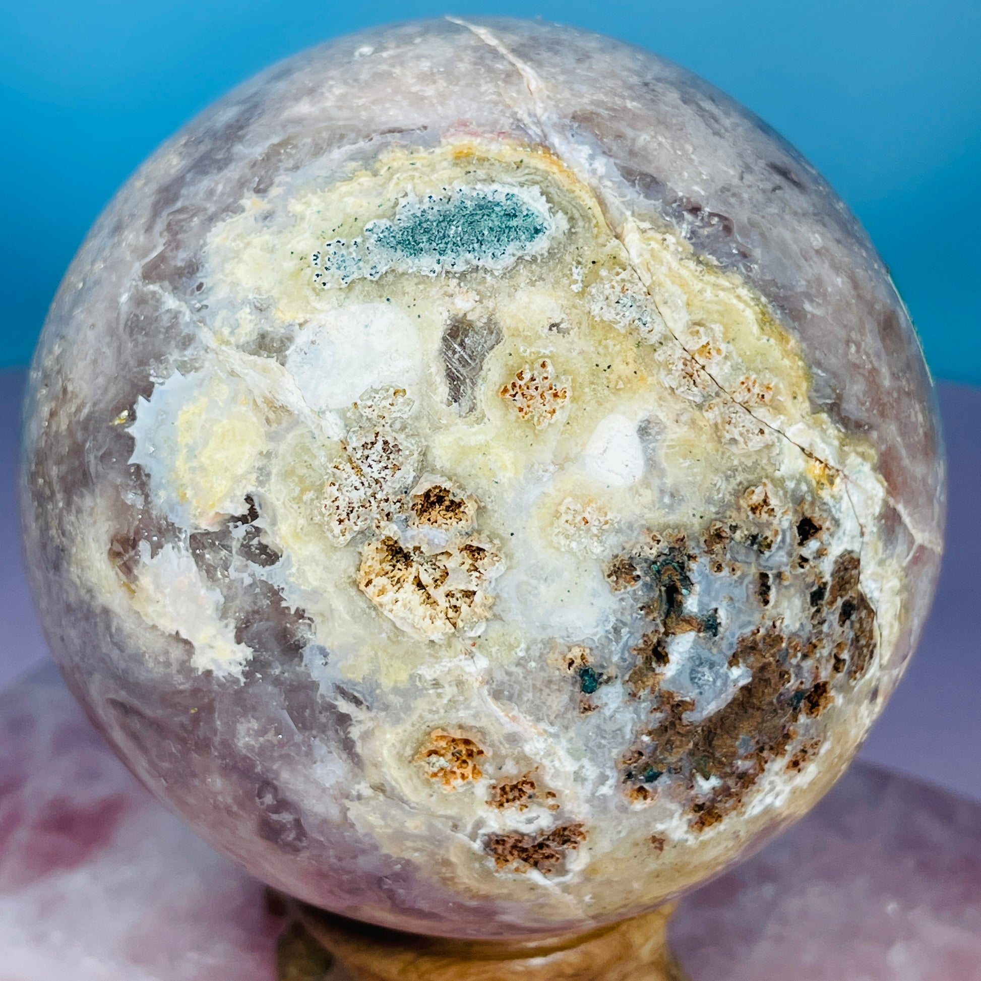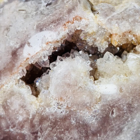 A large sphere of Brazilian Pink Amethyst with pockets of druzy Quartz.