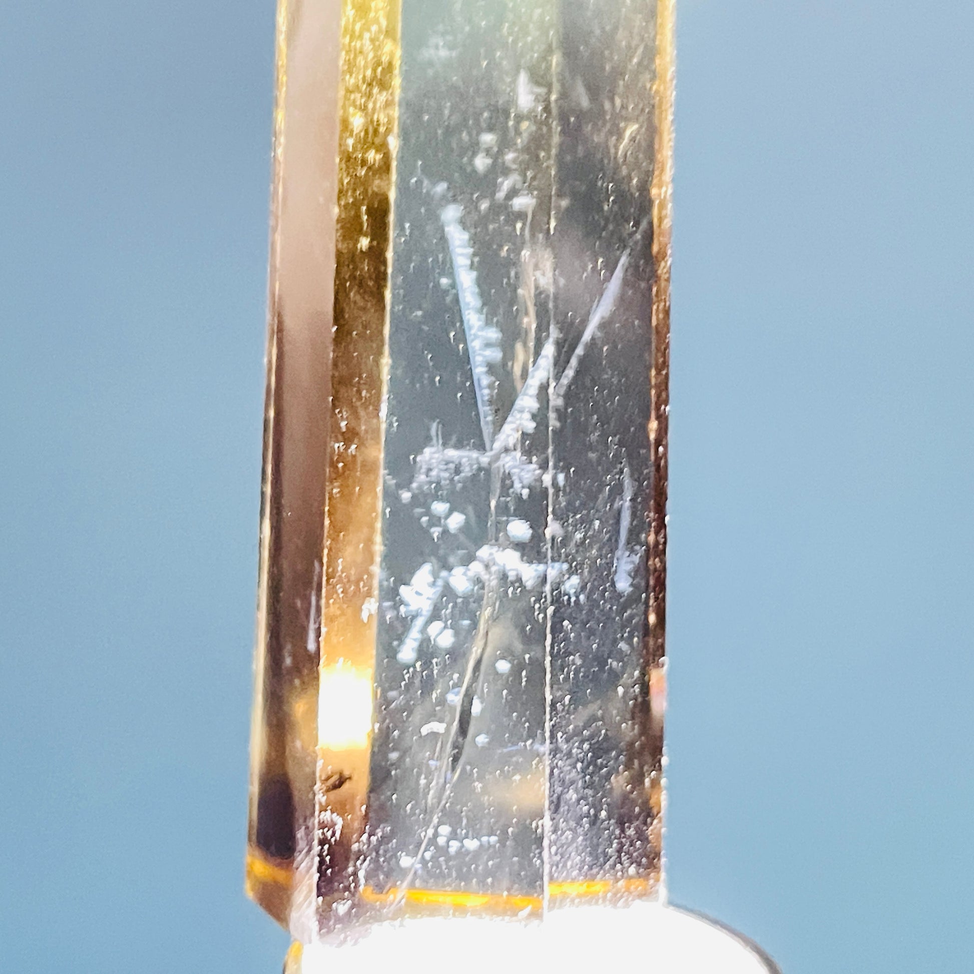 A rare inclusion of Blue Dumortierite in Citrine. This inclusion is commonly known as 'Blue Needle' or 'Blue Angel Feather' due to the striking blue colour of tiny needle-like crystals of Dumortierite within the Citrine Quartz.