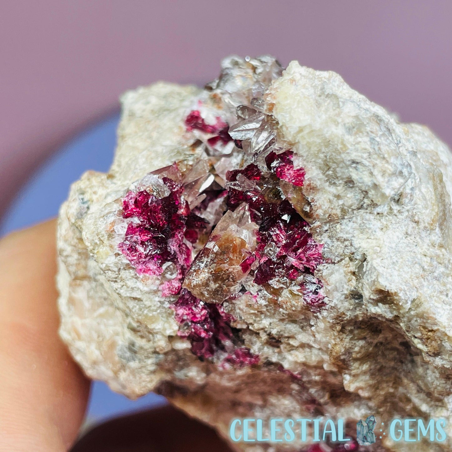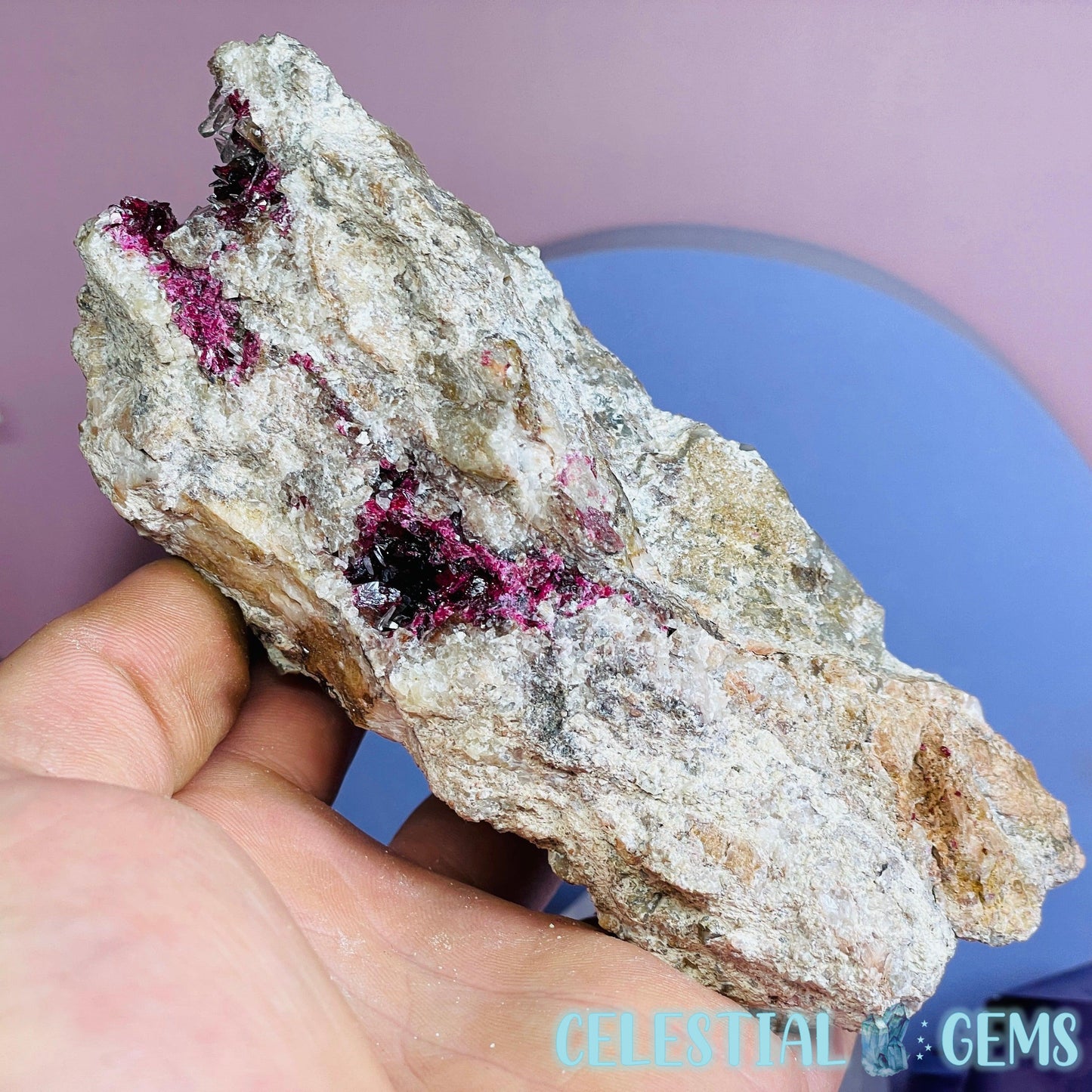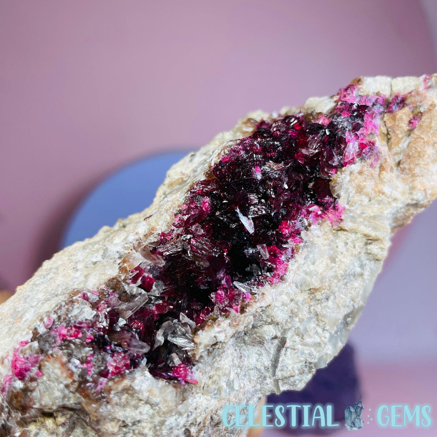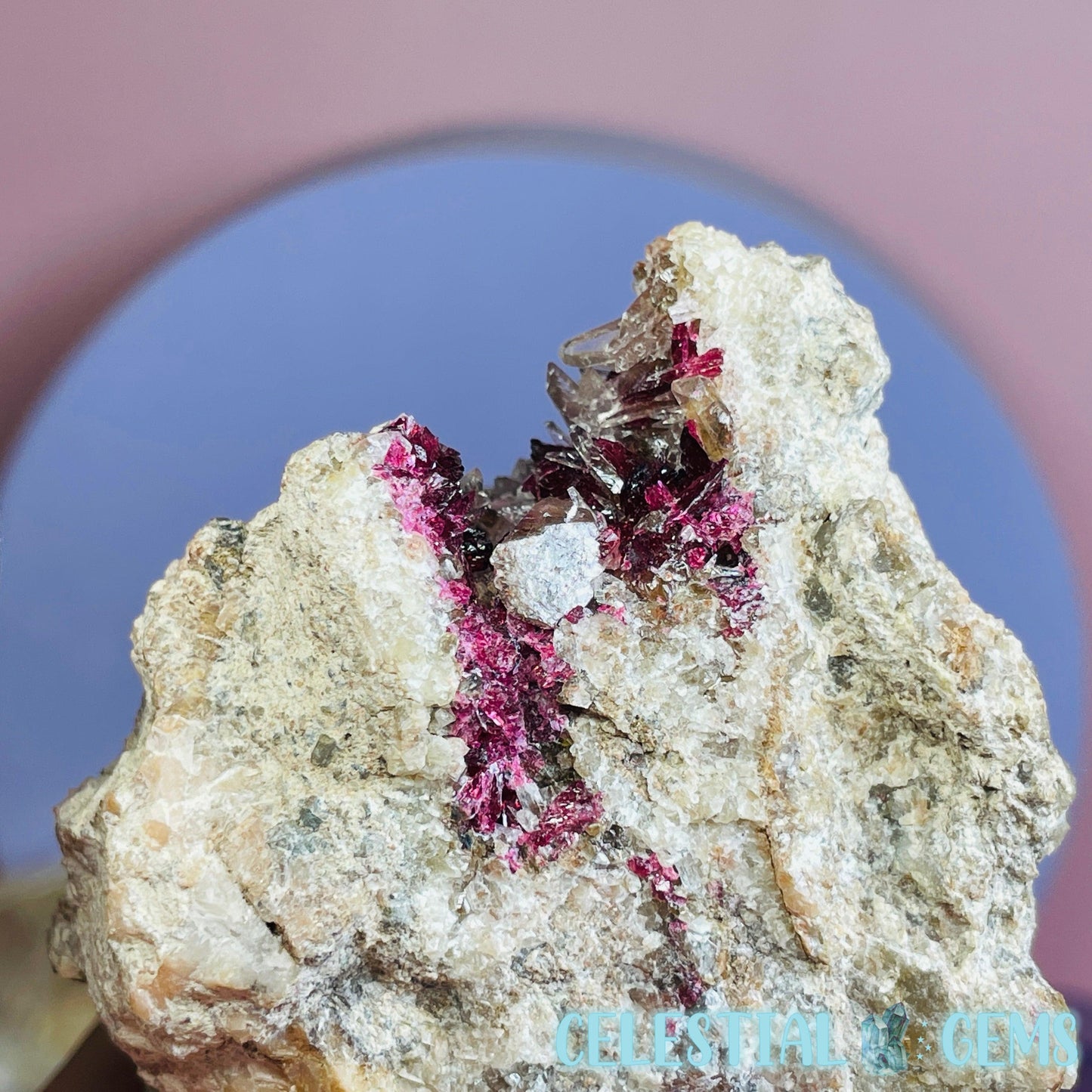 Roselite is an extremely rare pink-red cobalt mineral that sparsely occurs throughout the world and this piece has come from a lot was mined from the incredible Bou Azzer Mine, Morocco, which is famous for it's perfect crystallised Roselite deposits, among other beautiful minerals. Roselite sometimes occurs alongside Calcite crystals like in this piece.