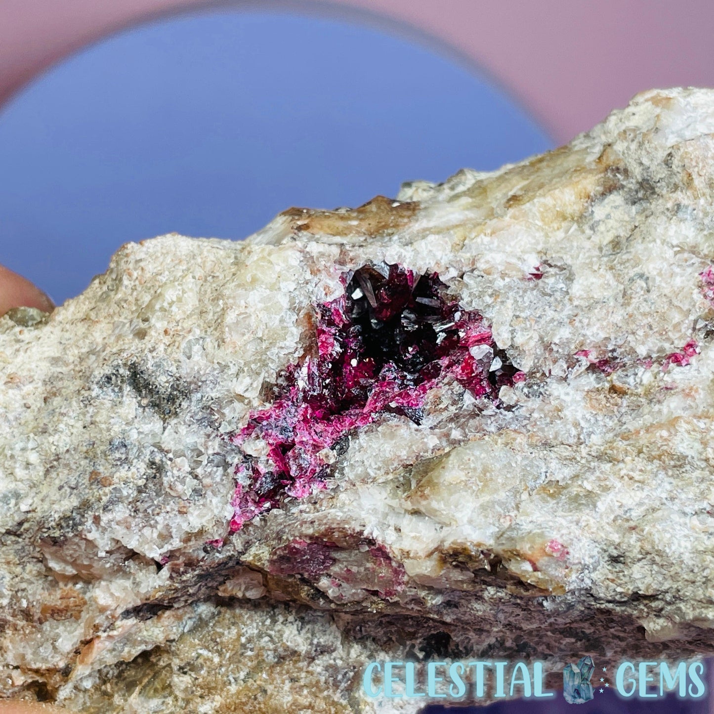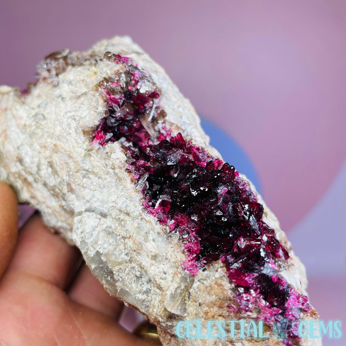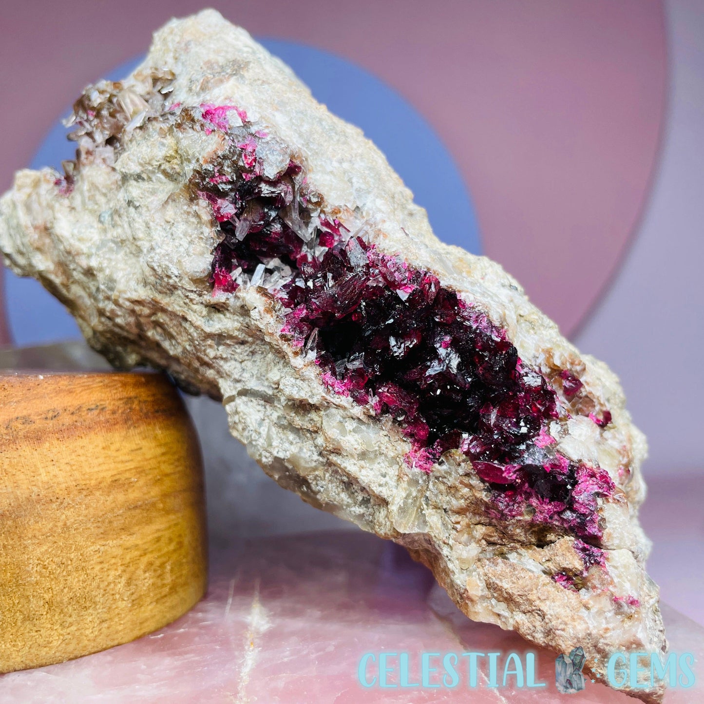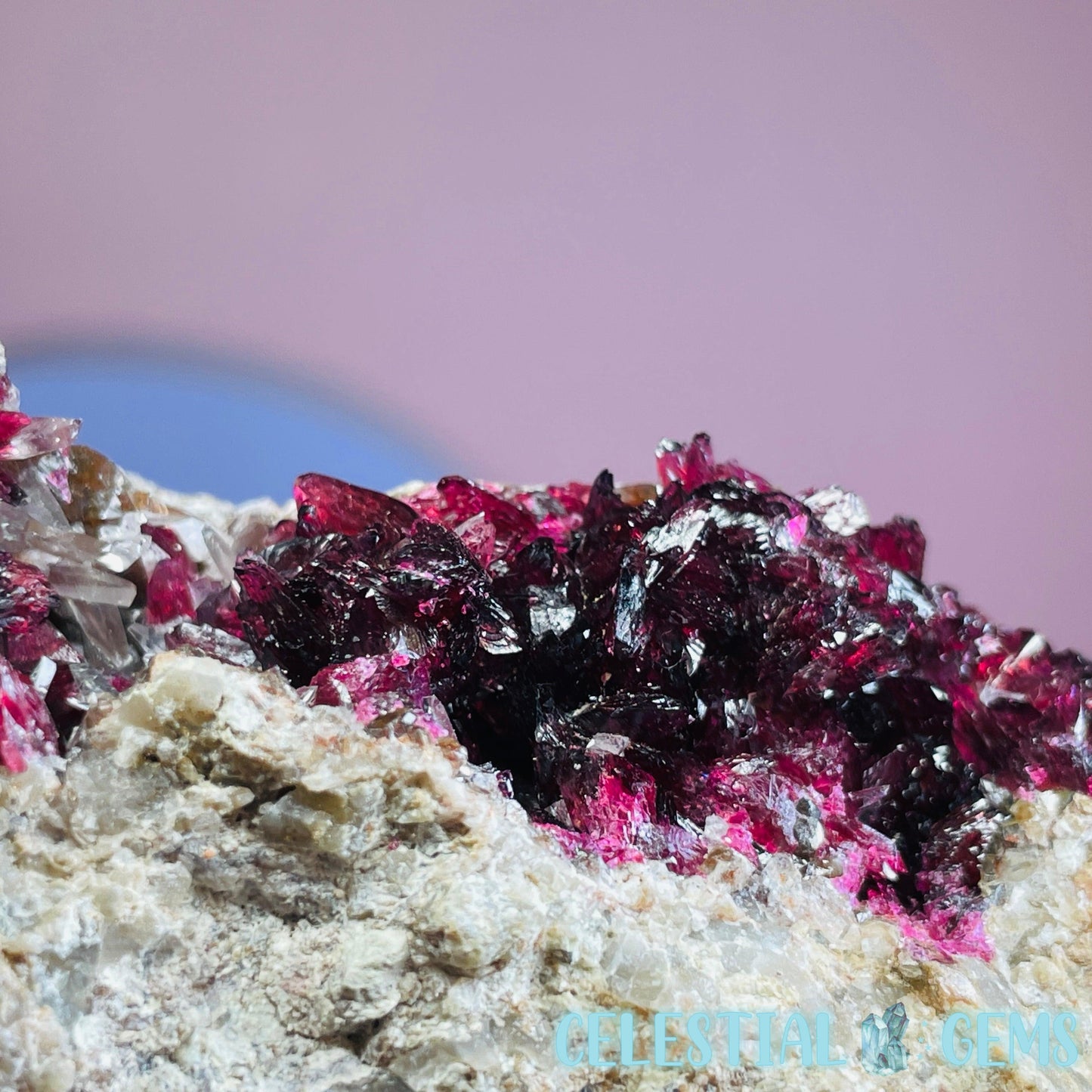 Roselite is an extremely rare pink-red cobalt mineral that sparsely occurs throughout the world and this piece has come from a lot was mined from the incredible Bou Azzer Mine, Morocco, which is famous for it's perfect crystallised Roselite deposits, among other beautiful minerals. Roselite sometimes occurs alongside Calcite crystals like in this piece.