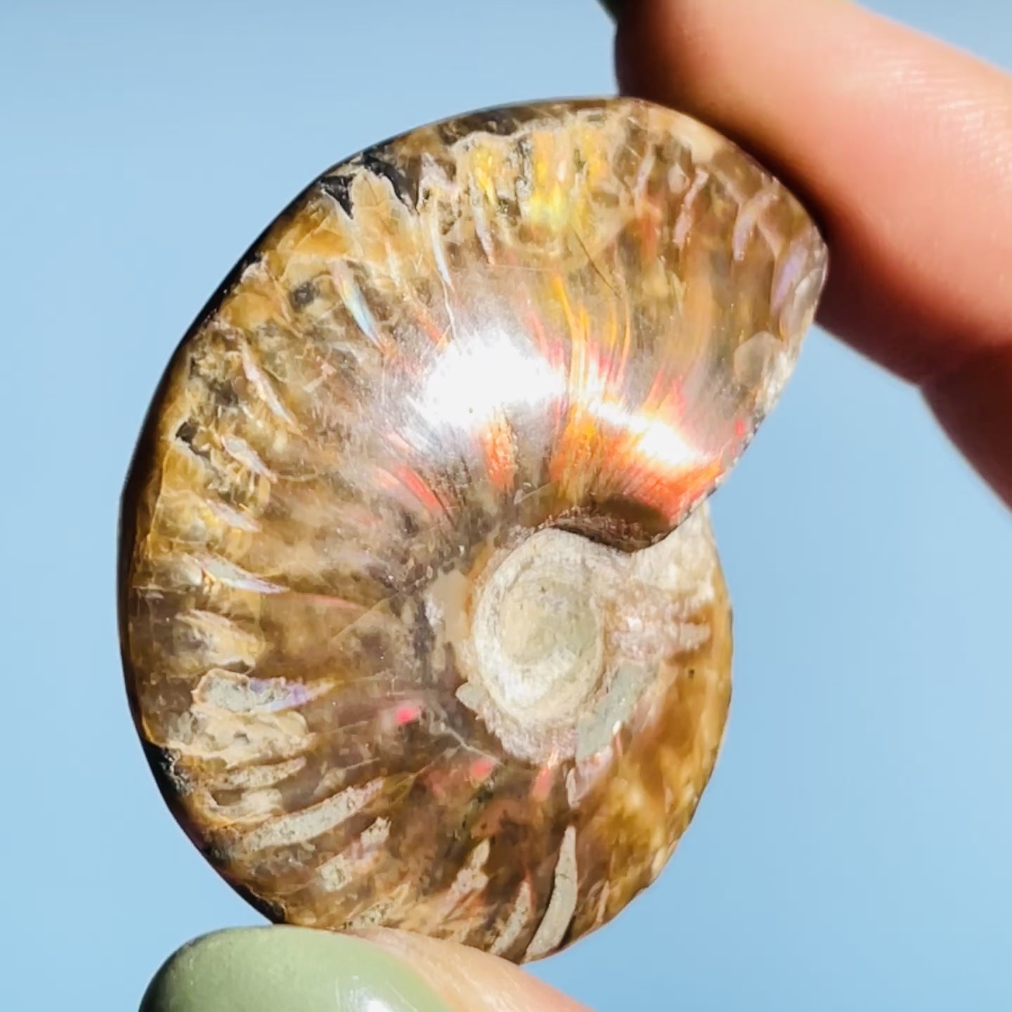 An Ammonite fossil, preserved still with its flashy nacre shell that produces excellent red and sometimes purple/green flashes from the natural original shell of the Ammonite animal.
