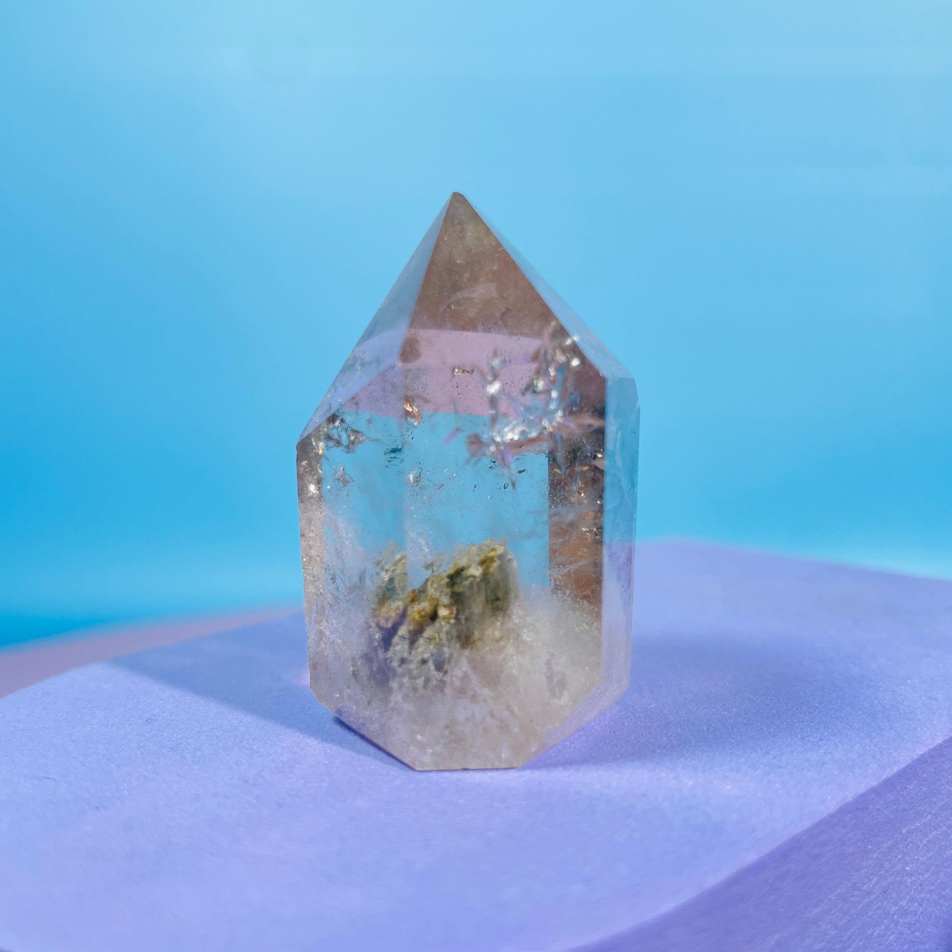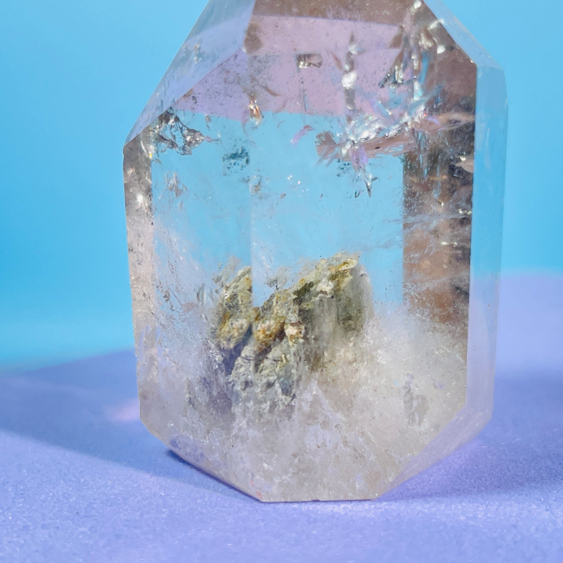 A stunning scenic Garden Quartz, AKA Lodolite, with inclusions of Chlorite, Hematite and other minerals, creating 'garden-like' structures within Quartz. Polished into a small tower.