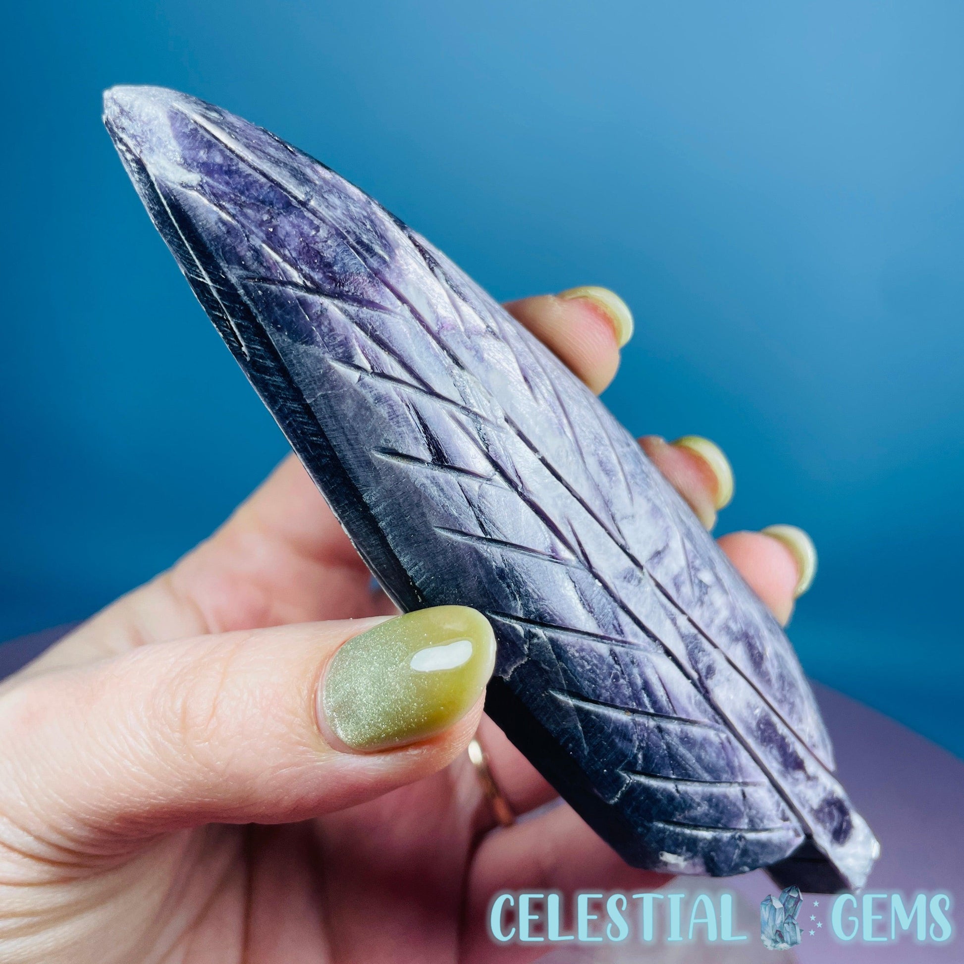 A carving of a feather from gem grade Lepidolite Mica which has exceptional flashes. Approx. 11cm x 4cm x 1.1cm.