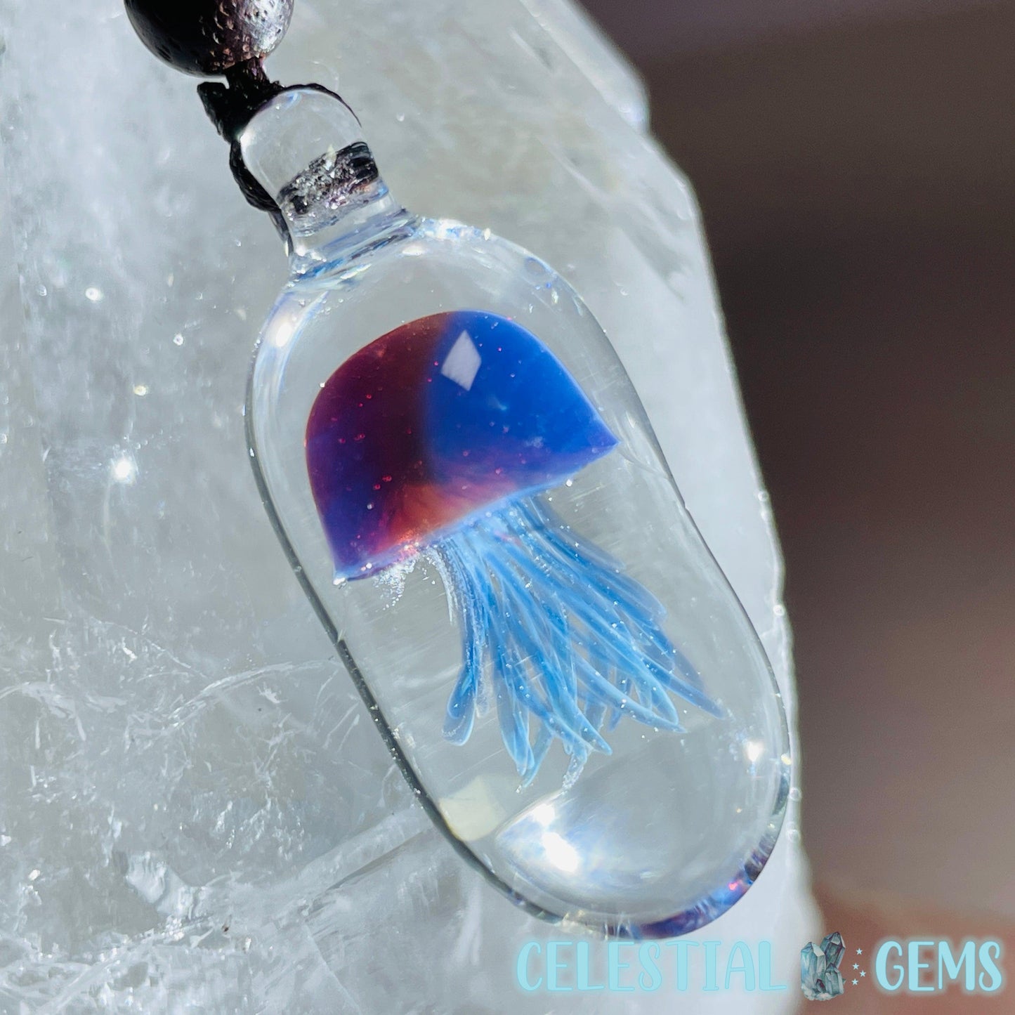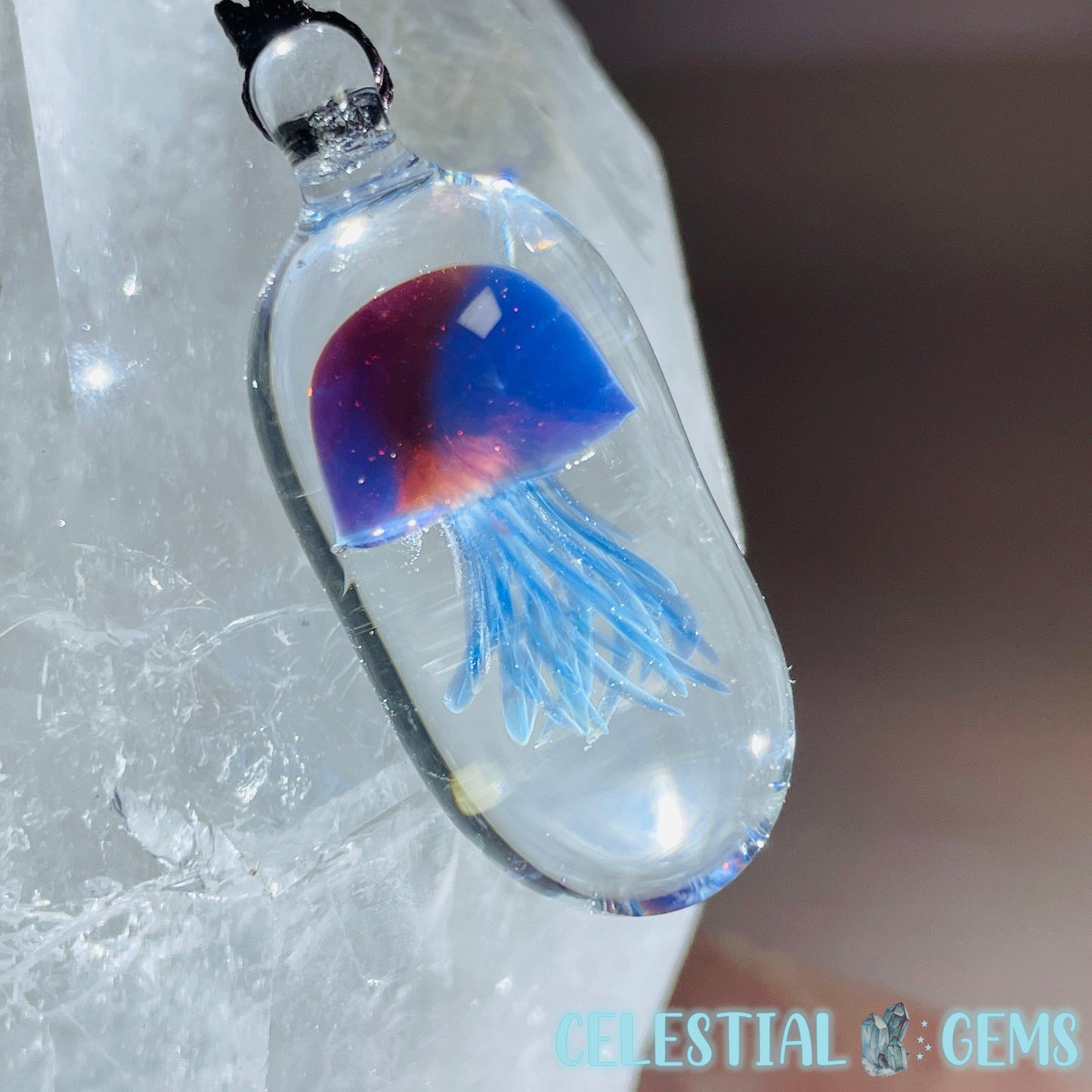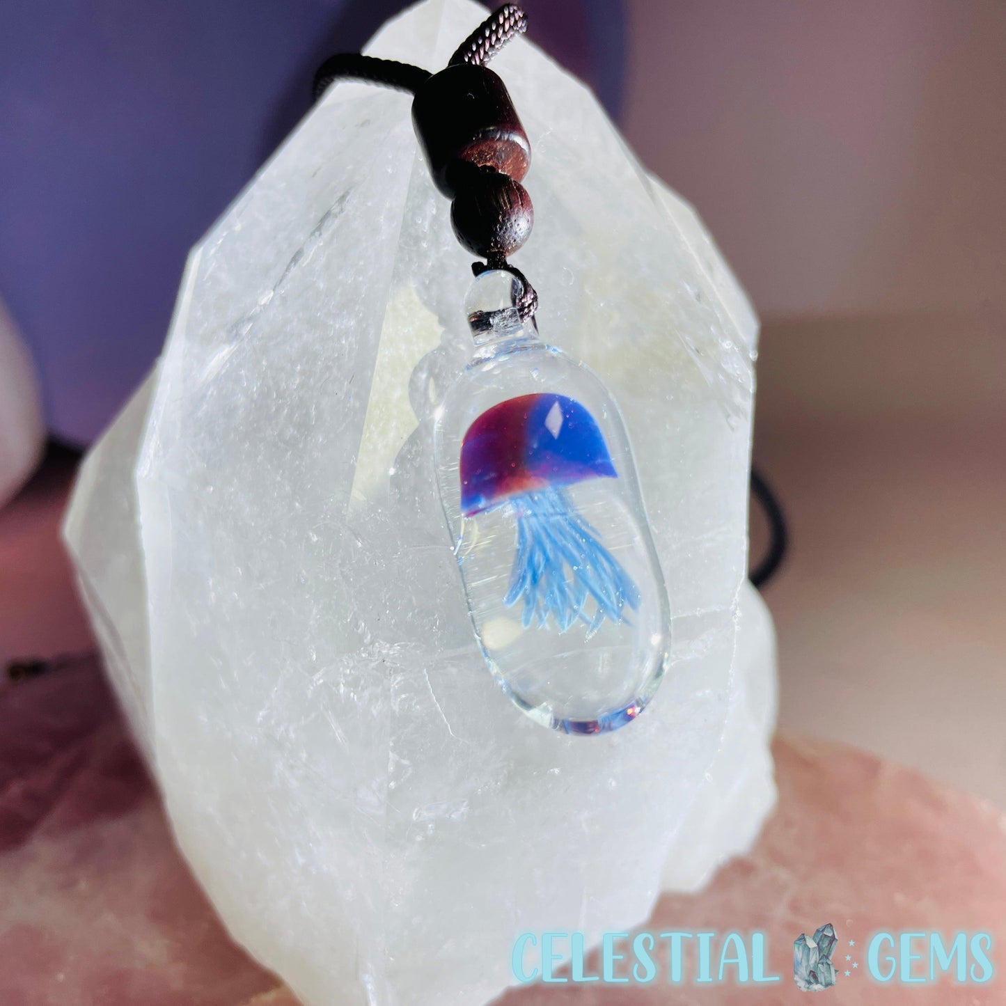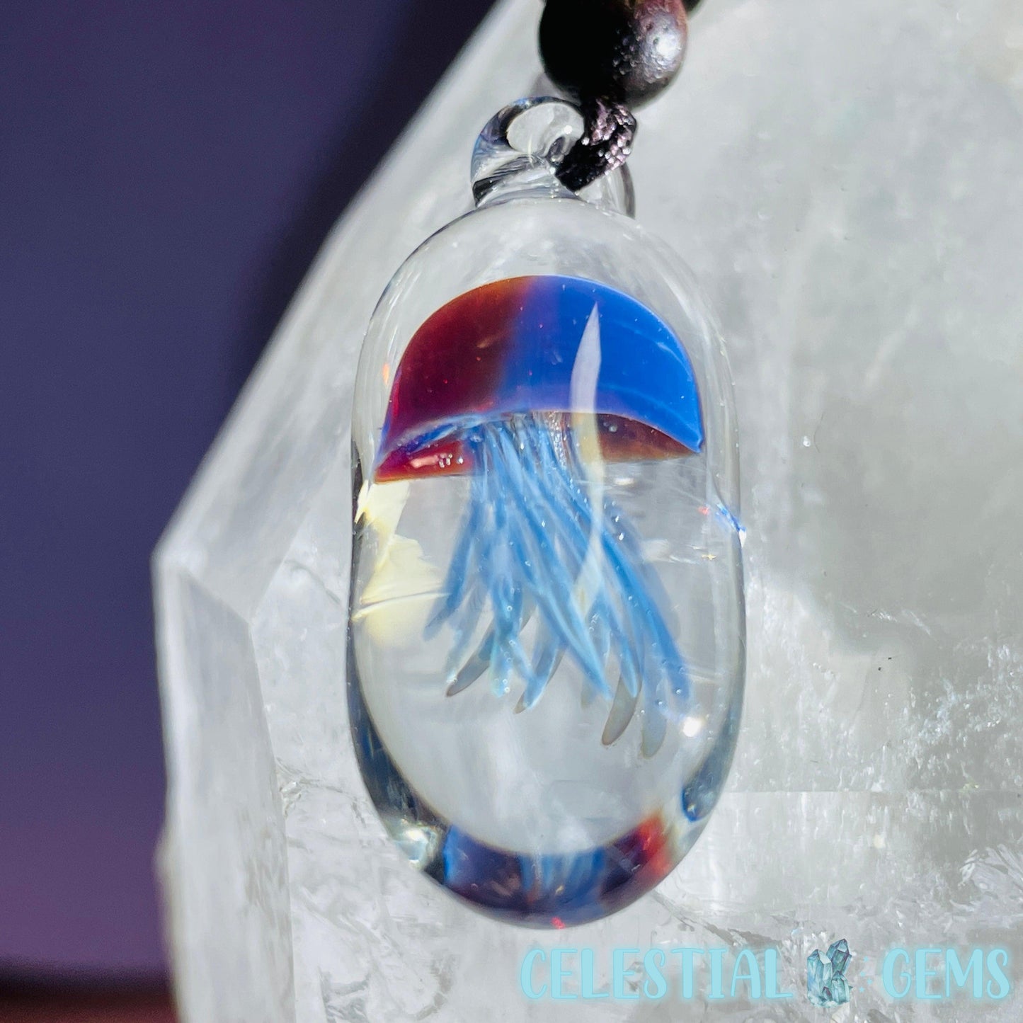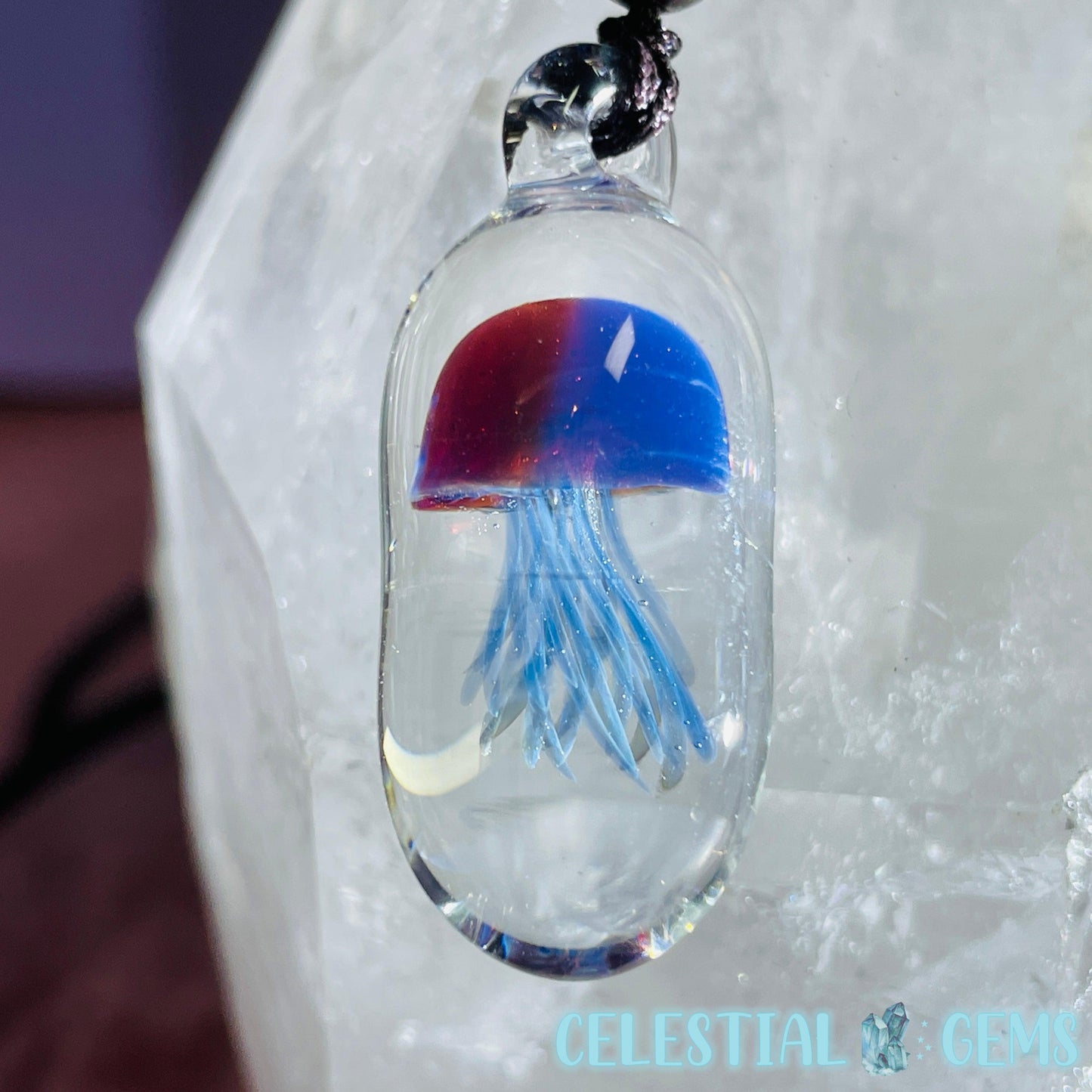 Cute little Jellyfish handmade cleverly from blown glass. Strung on a rope necklace. Pendant is approx. 3.4cm x 1.4cm.