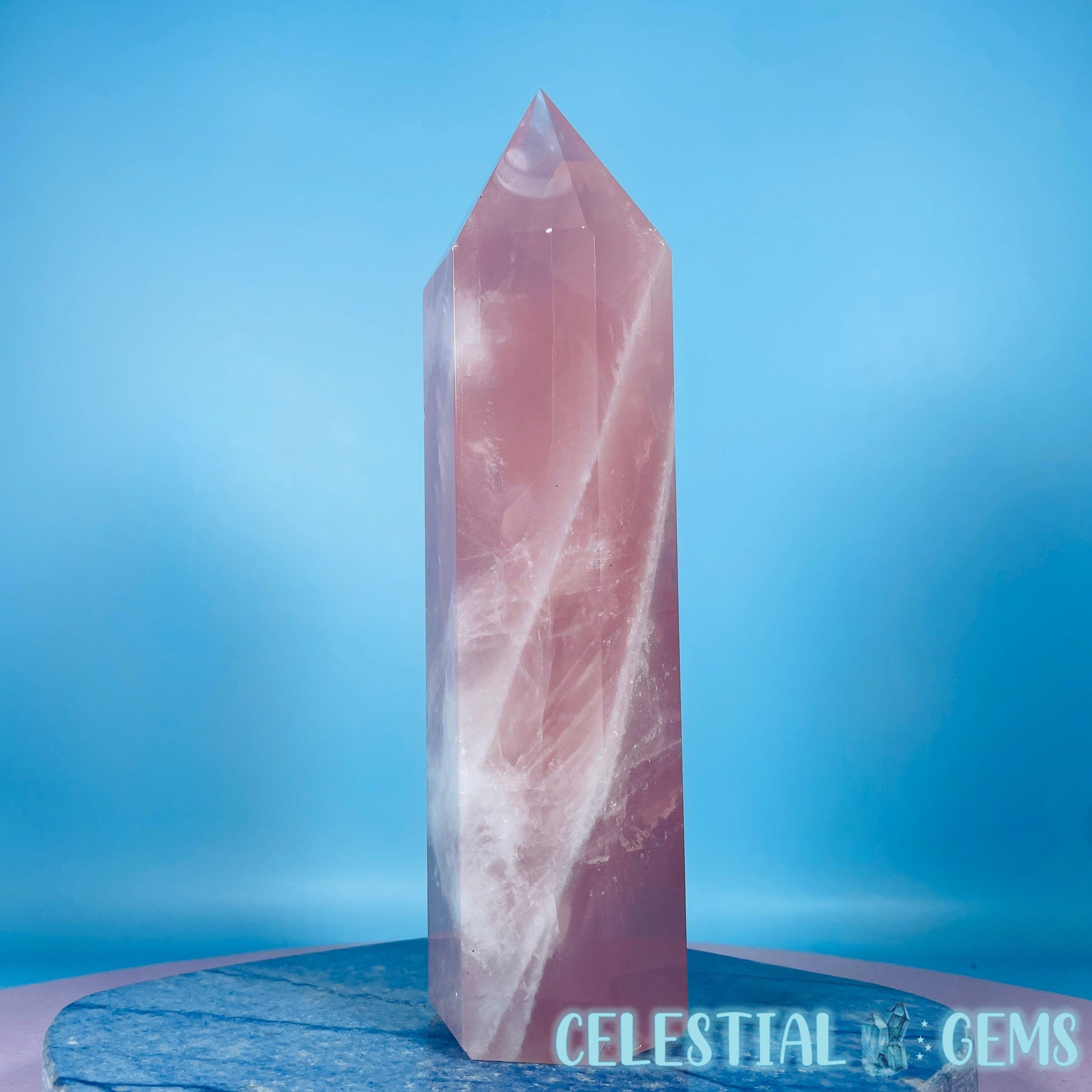 A high grade of translucent pink Rose Quartz polished into a large tower with stunning flashes all over.