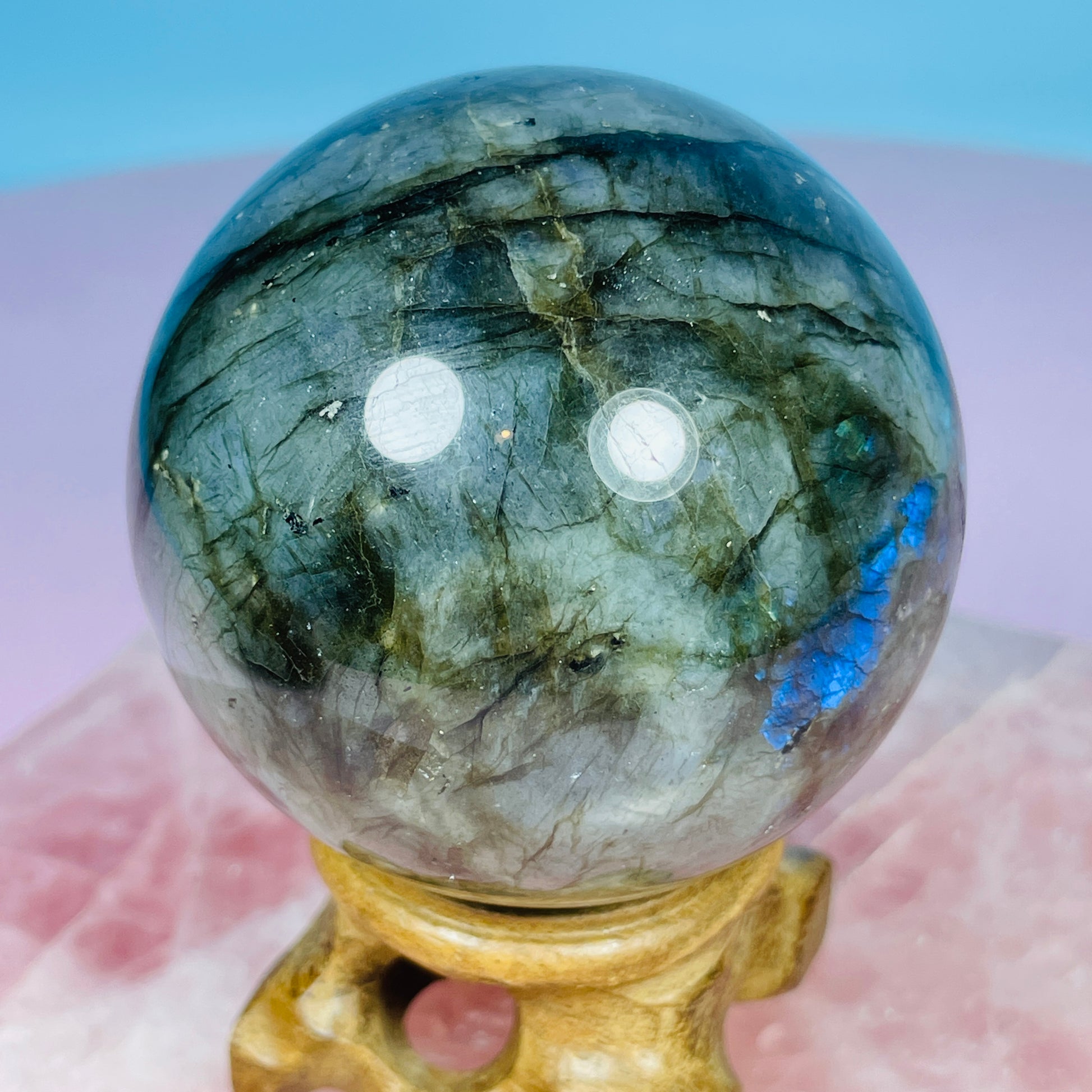 A medium sphere of flashy Labradorite with multicoloured flashes. Swipe to see a video of the flashes of this Labradorite.