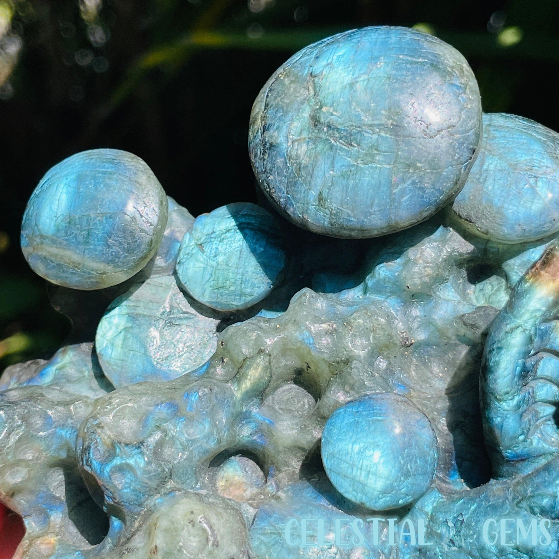 A large carving of flashy Labradorite representing a 'troop' of mushrooms in the mossy scrub.