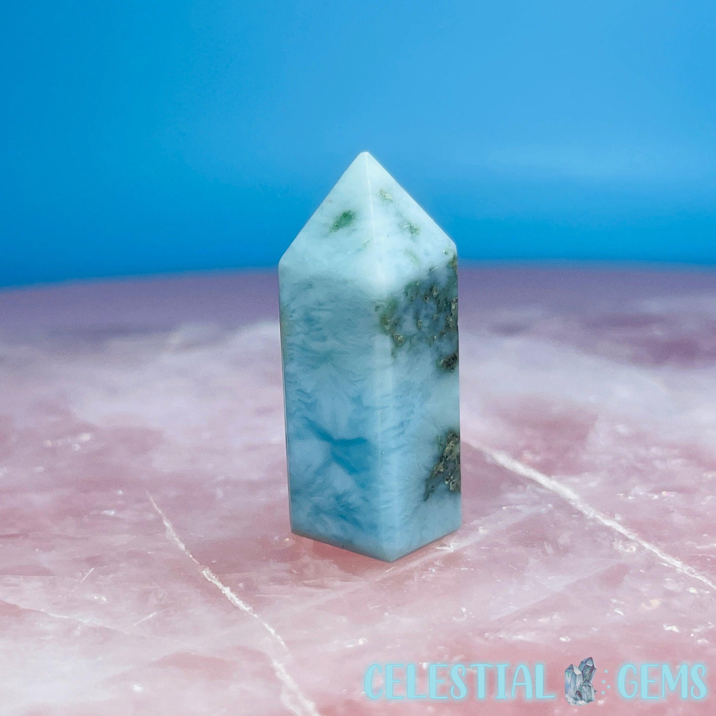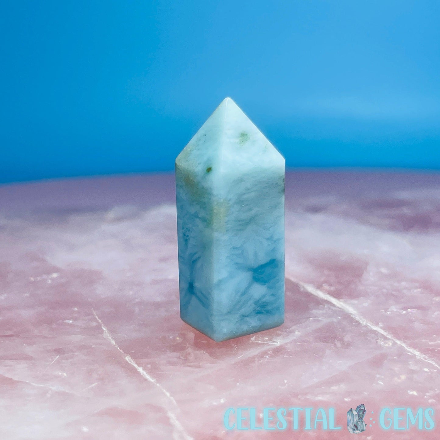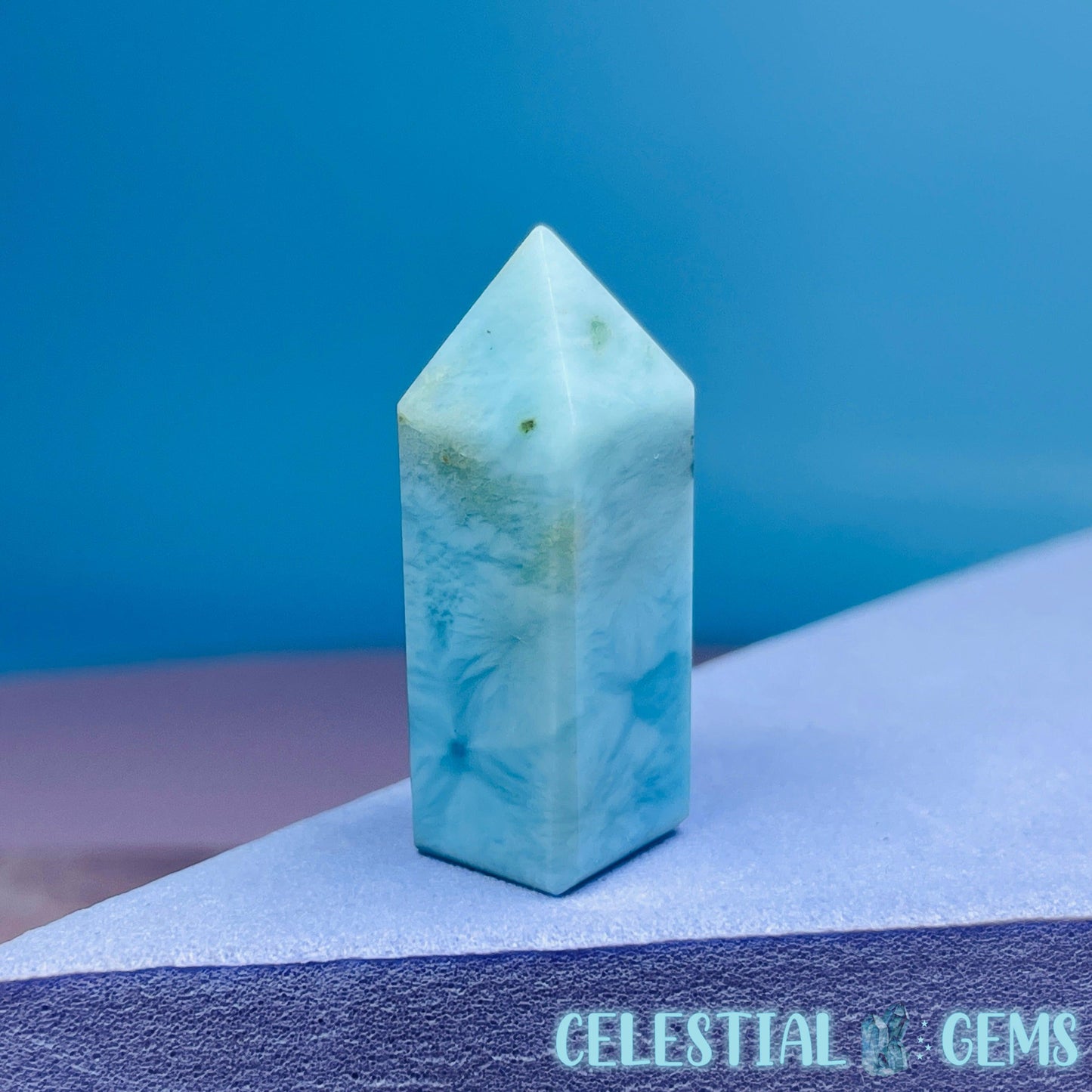 A mini point of rare Larimar (Blue Pectolite) from the Dominican Republic. Approx. 2.9cm x 1.2cm.