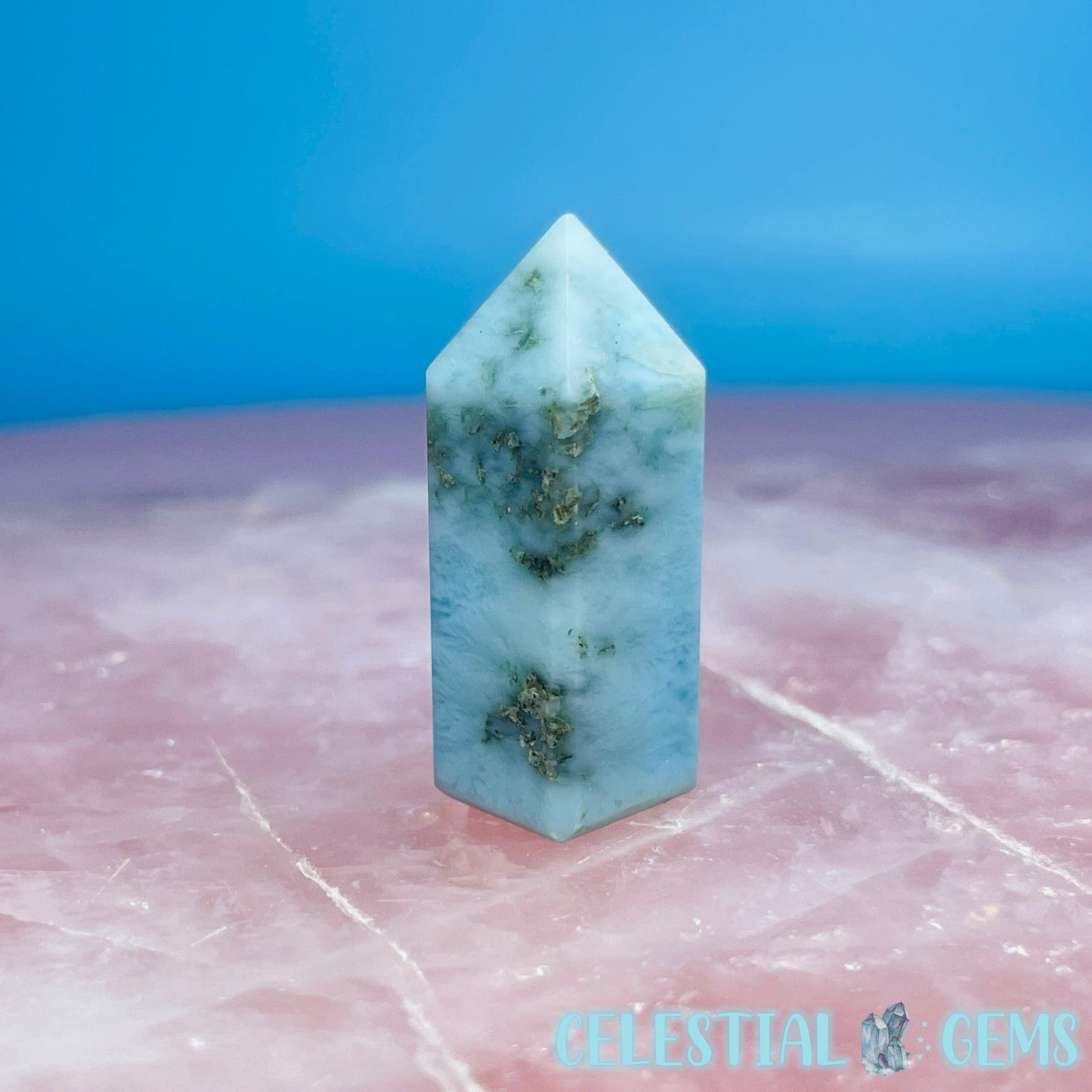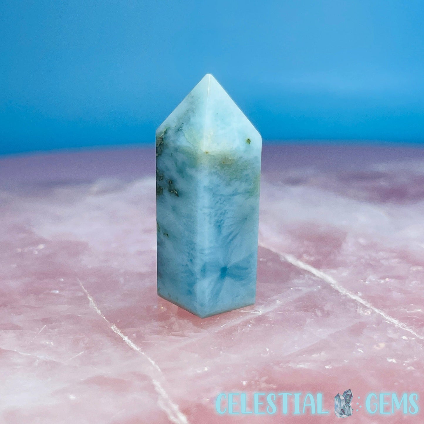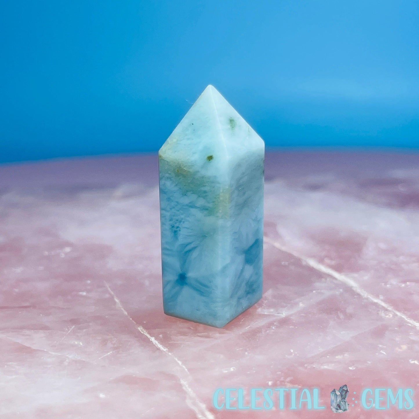 A mini point of rare Larimar (Blue Pectolite) from the Dominican Republic. Approx. 2.9cm x 1.2cm.