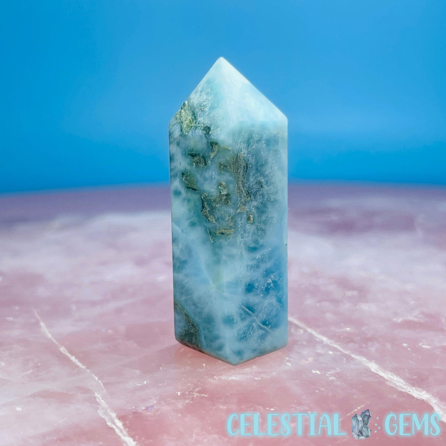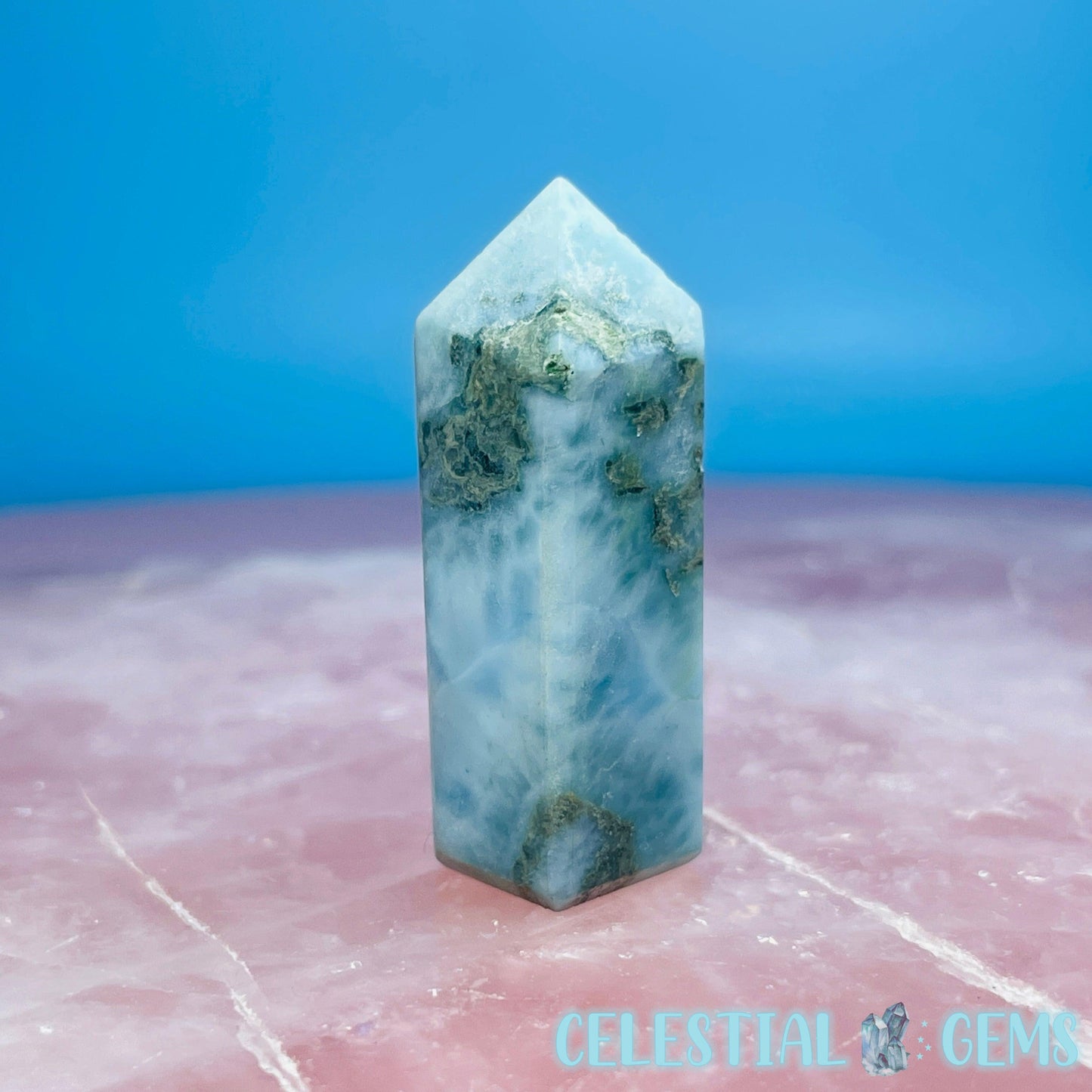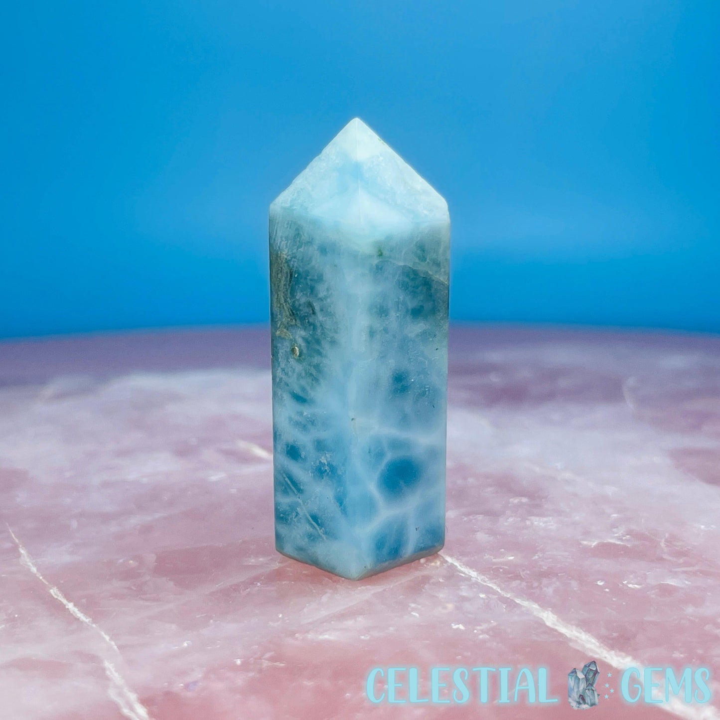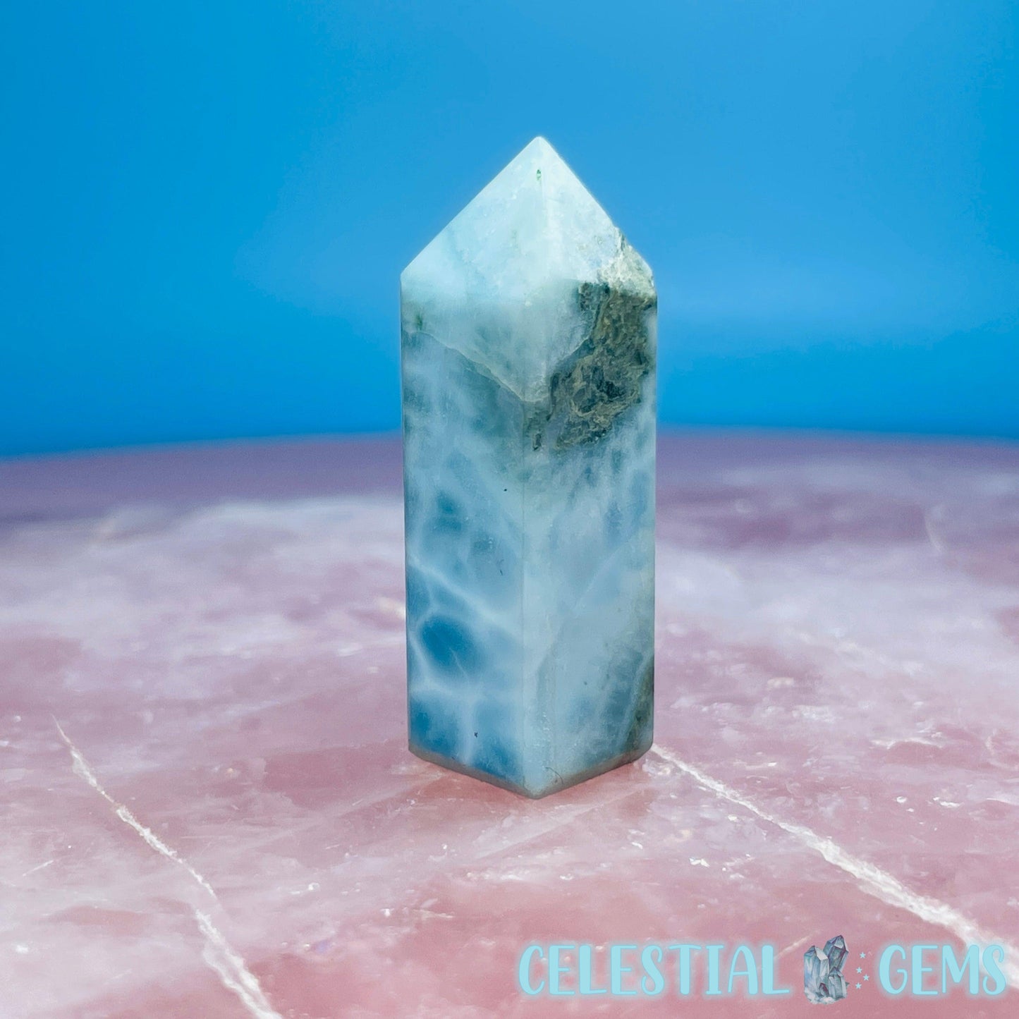 A mini point of rare Larimar (Blue Pectolite) from the Dominican Republic. Approx. 3.6cm x 1.2cm.