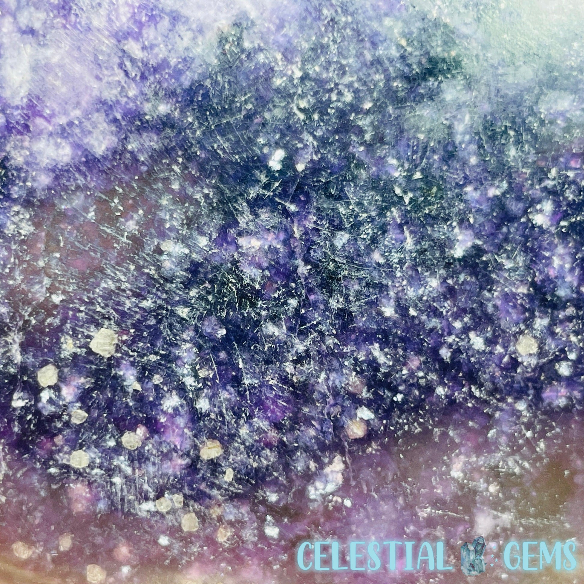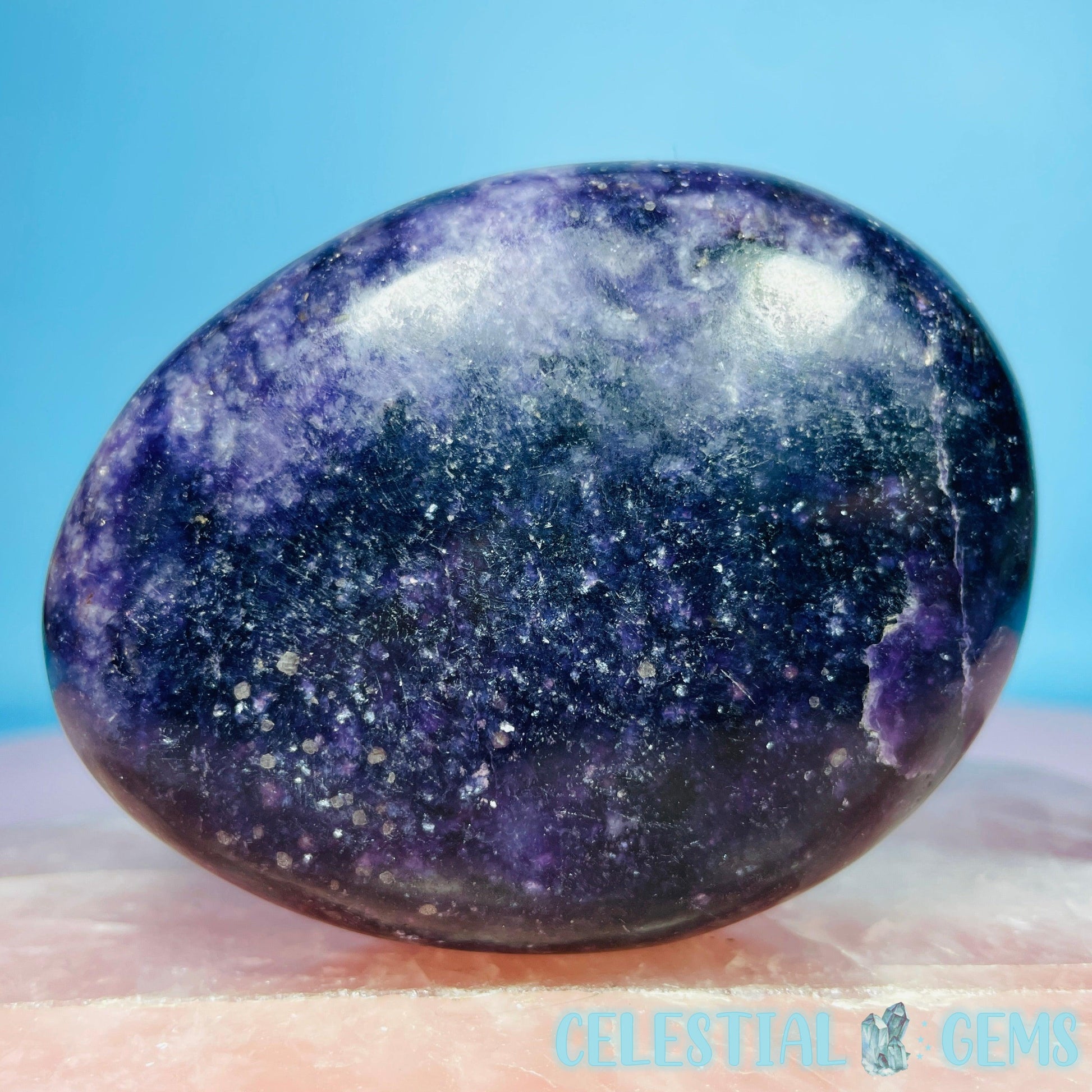 Gorgeous sparkly polished Lepidolite (Purple Mica) medium sized freeform with dark purple colour and white Albite inclusions.