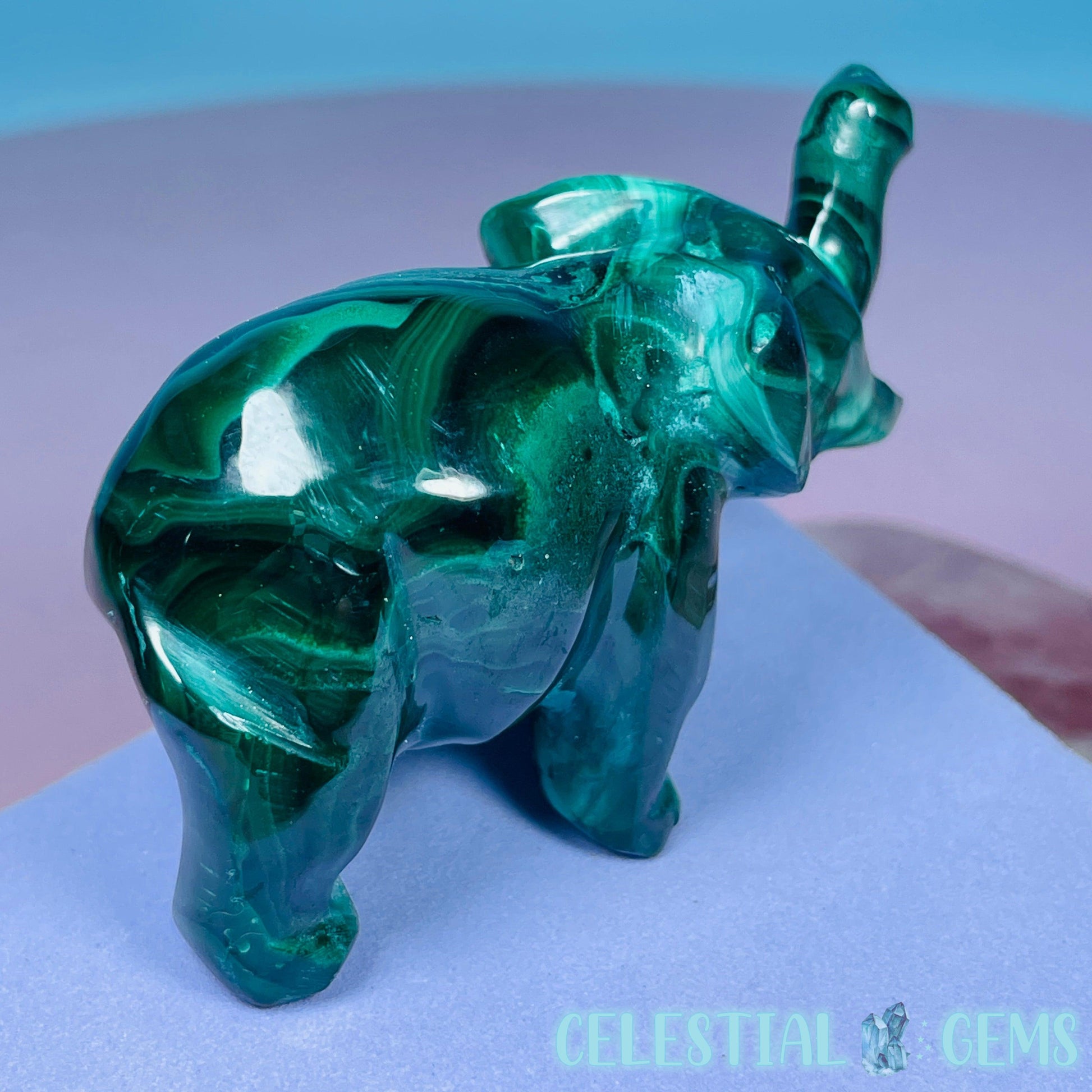 Natural Malachite with excellent patterns, handcarved into a Elephant shape. Sourced from Congo, Africa. Approx. 6.6cm x 4cm x 2.8cm.